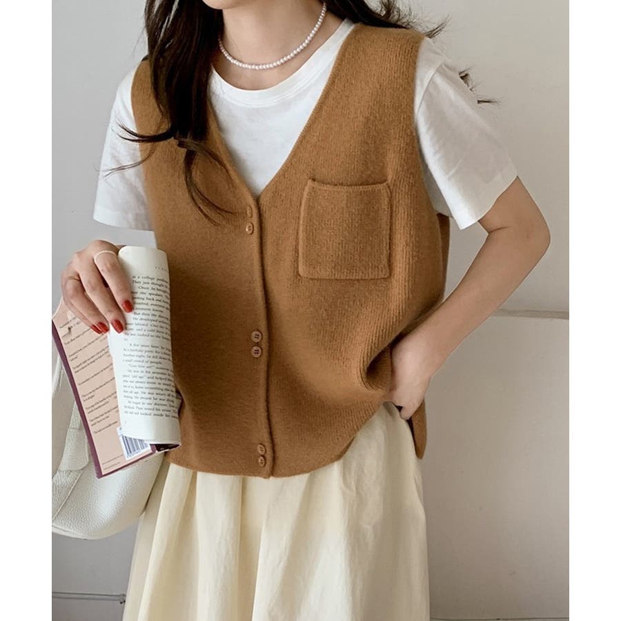 【ブラウン】Vネックニットベスト ニットジレ 重ね着