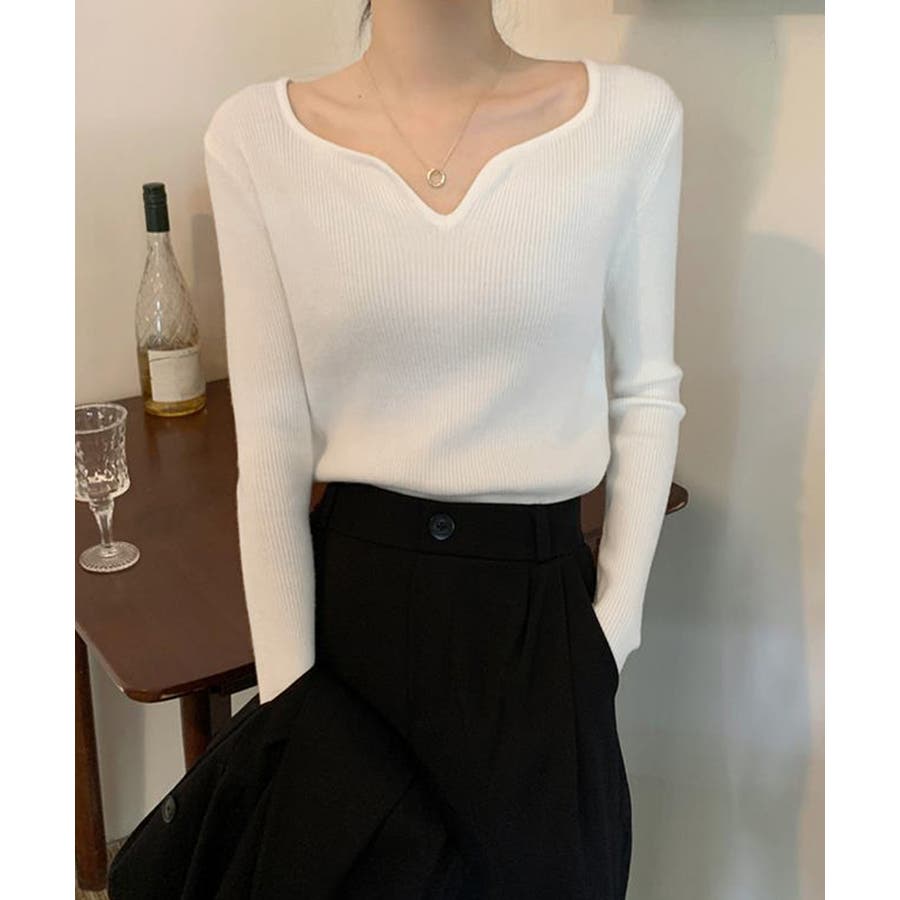 キーネックデザインが首回りをすっきり見せ、抜け感のある大人ニットトップス。