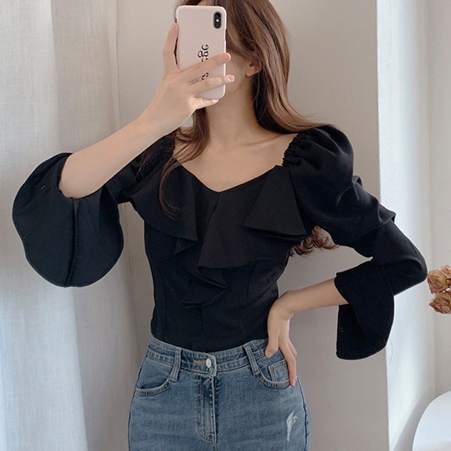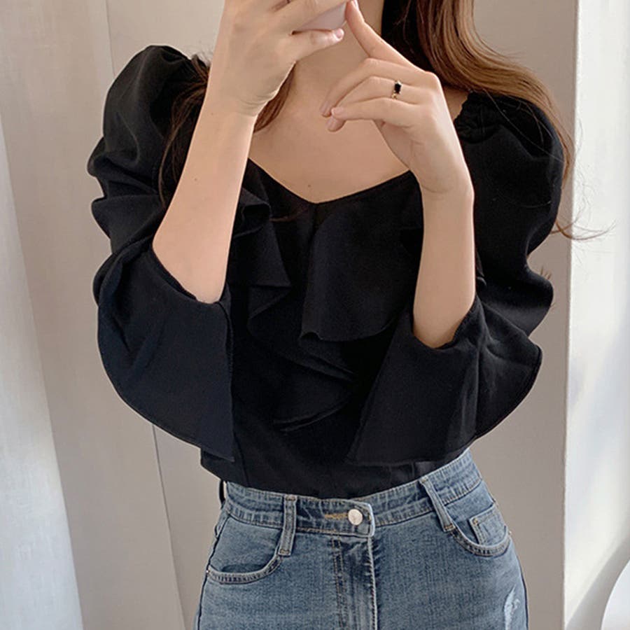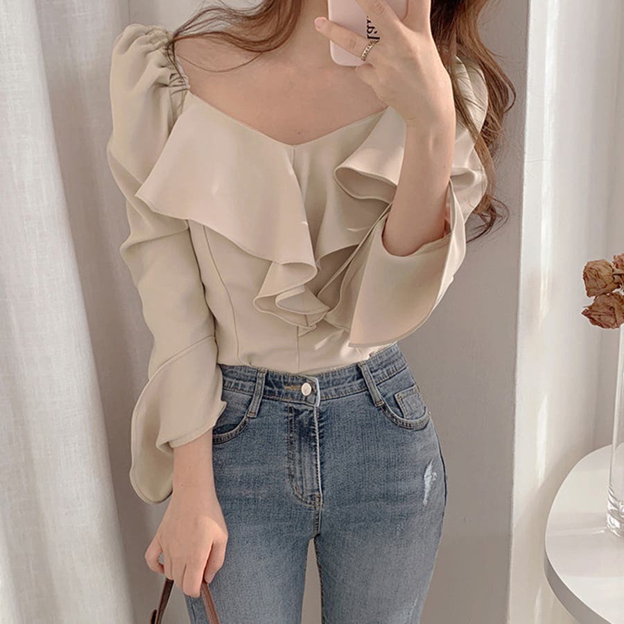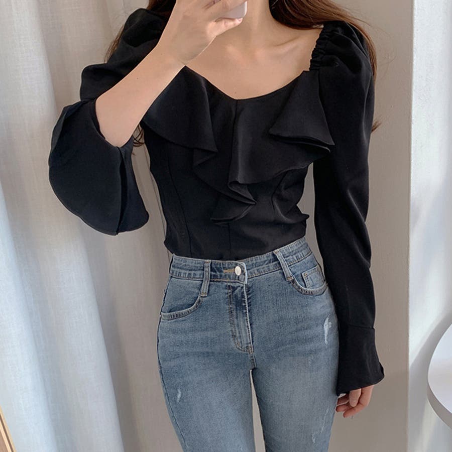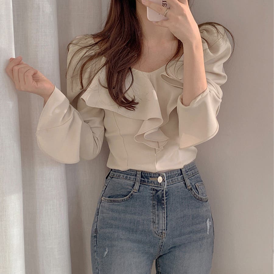 韓国ファッション 長袖ブラウス フリル襟