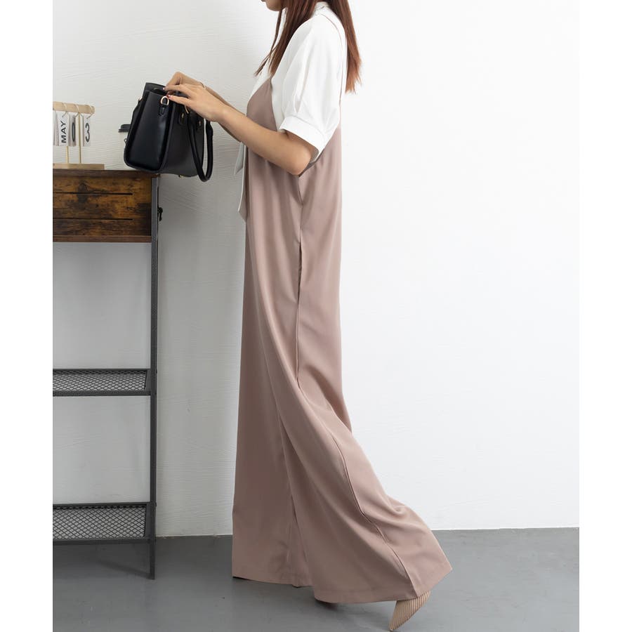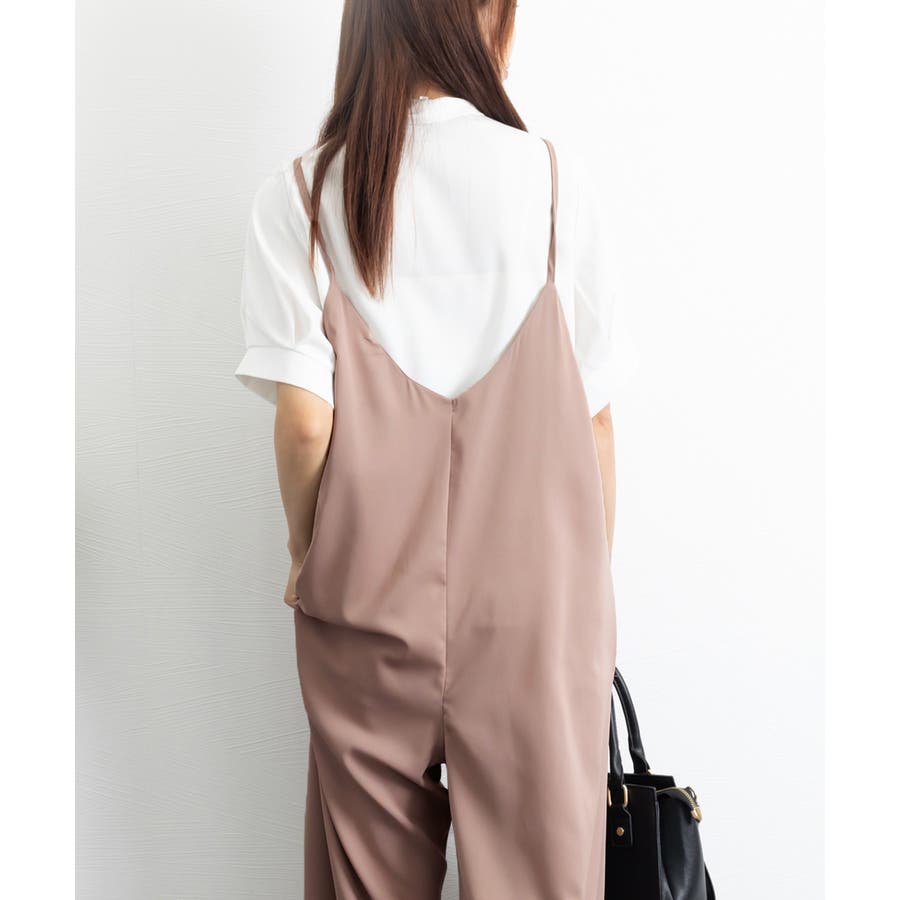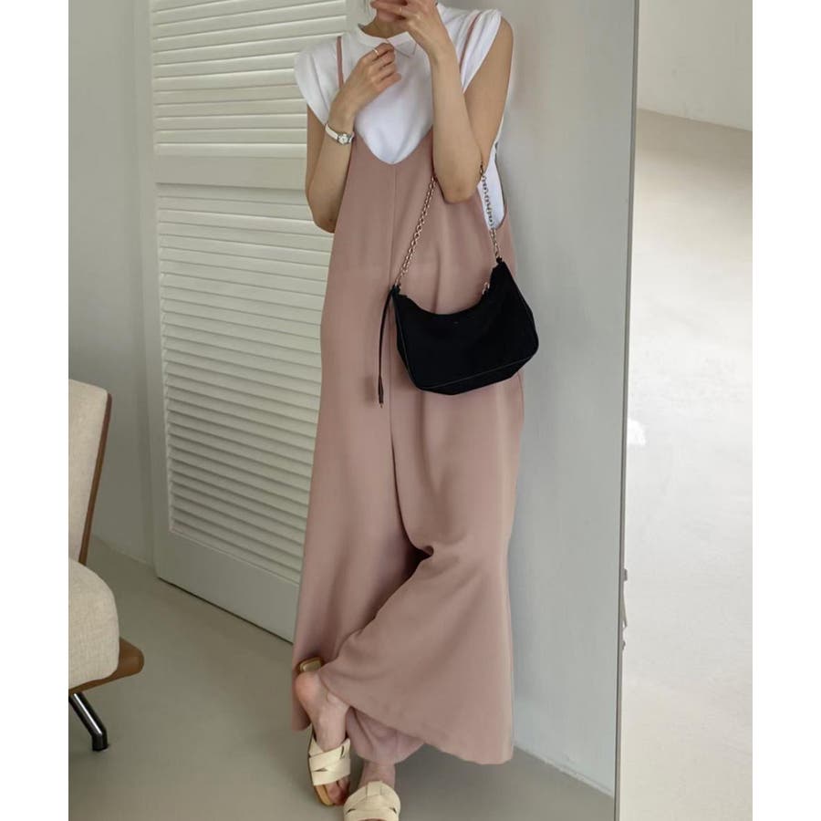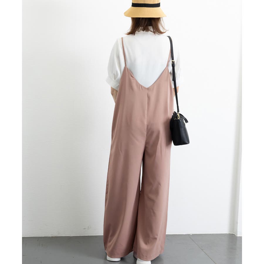細めのストラップと前後Vラインがフェミニンで大人っぽい、キレイめに着られる大人サロペット