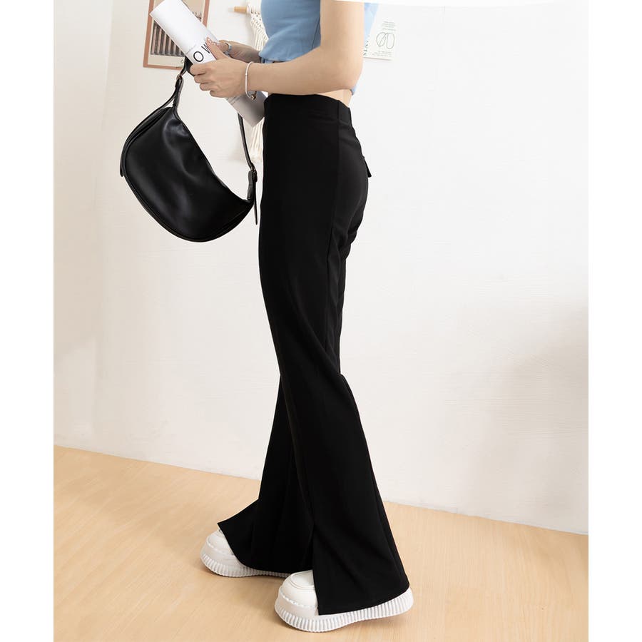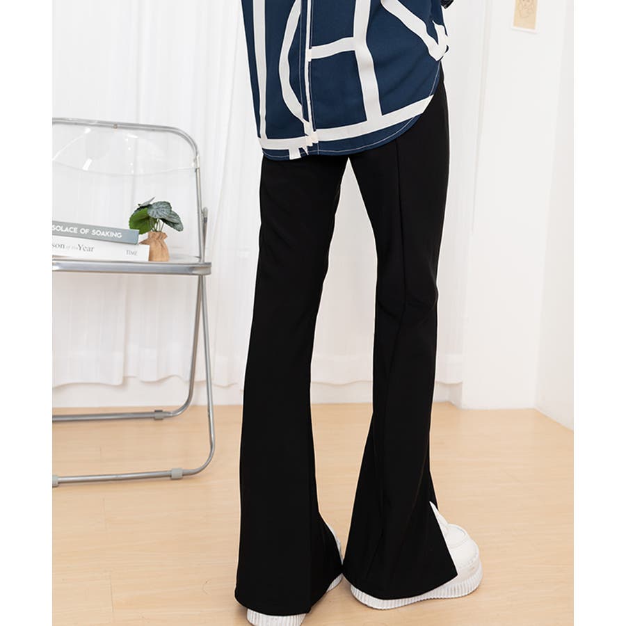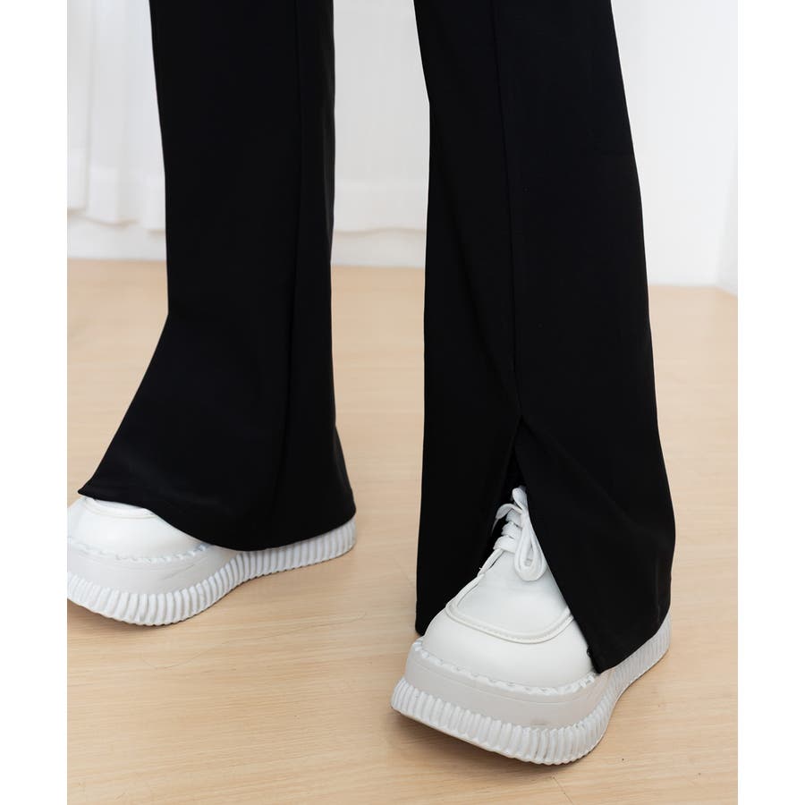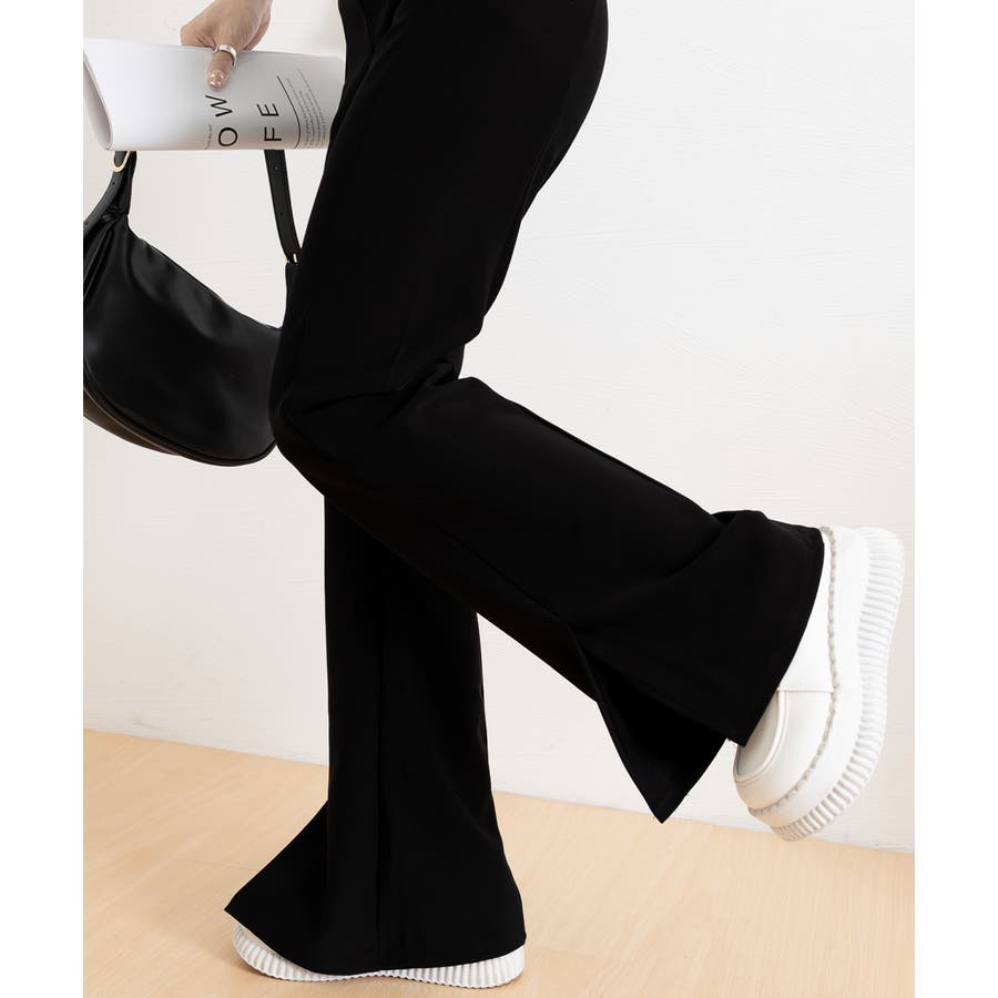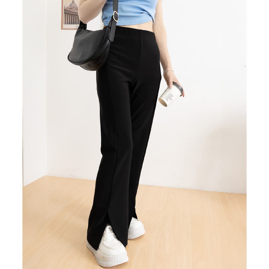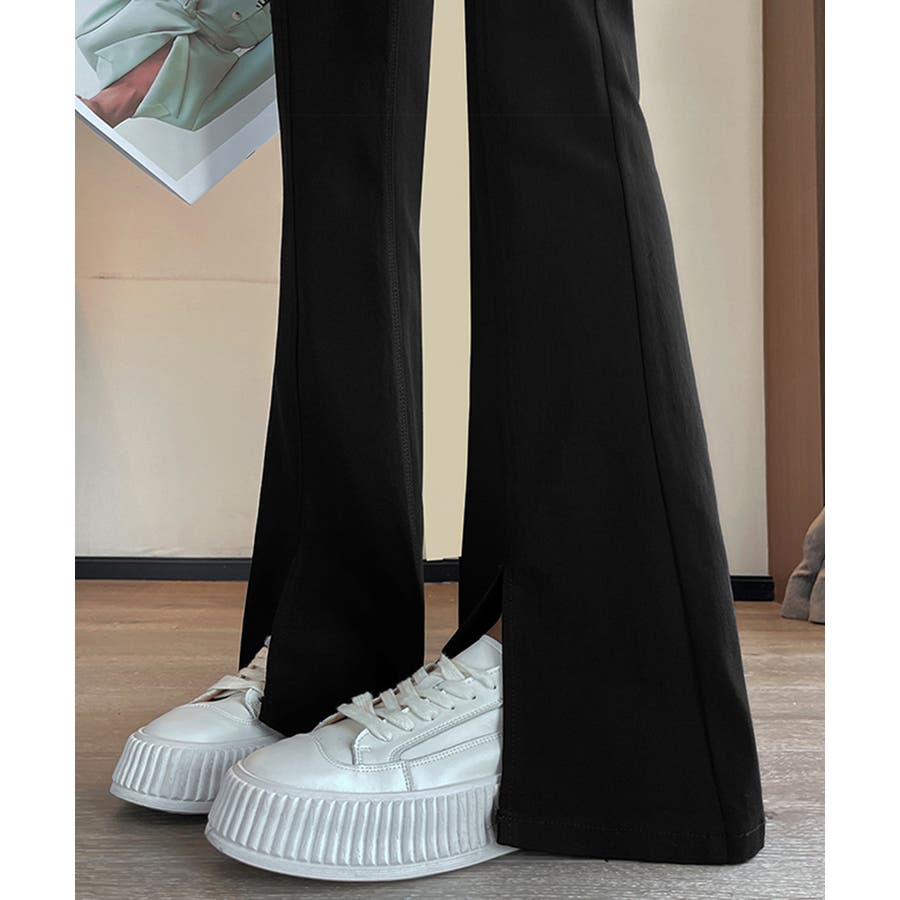 フロント裾のスリットが印象的な、細身シルエットが魅力のフレアスキニーパンツ。