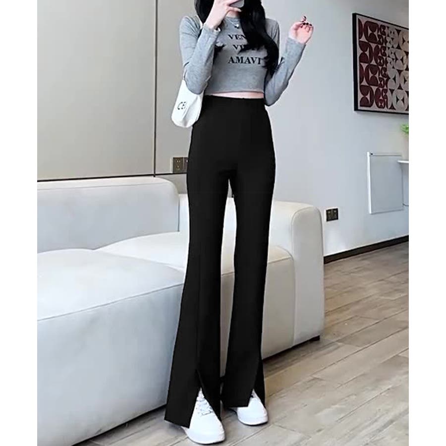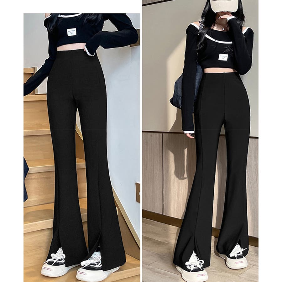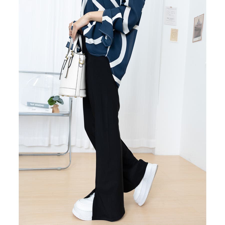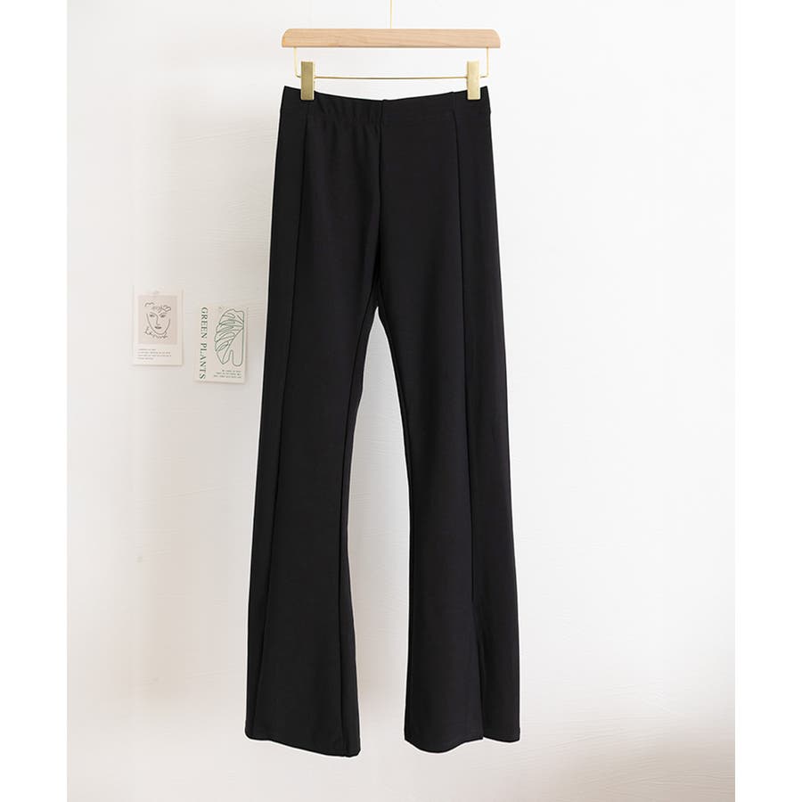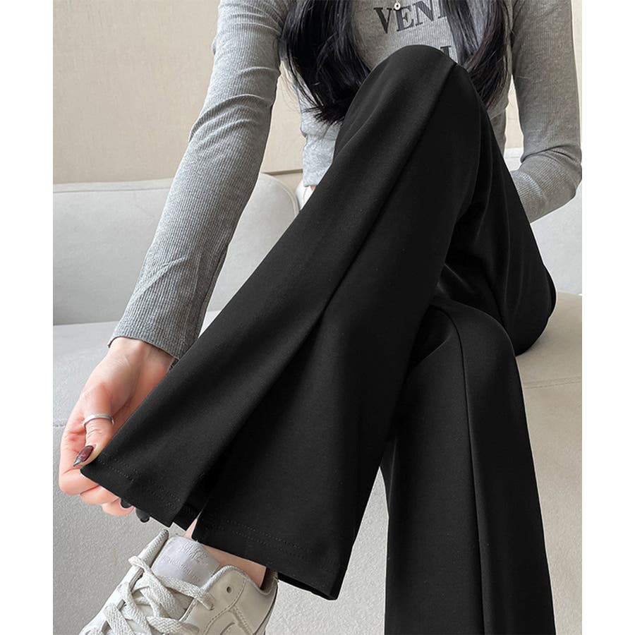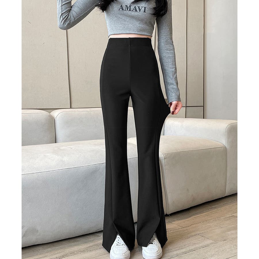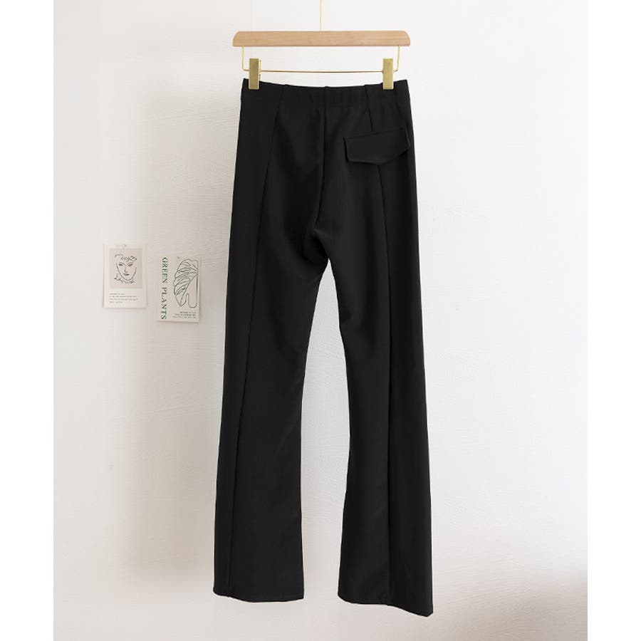 フロント裾のスリットが印象的な、細身シルエットが魅力のフレアスキニーパンツ。