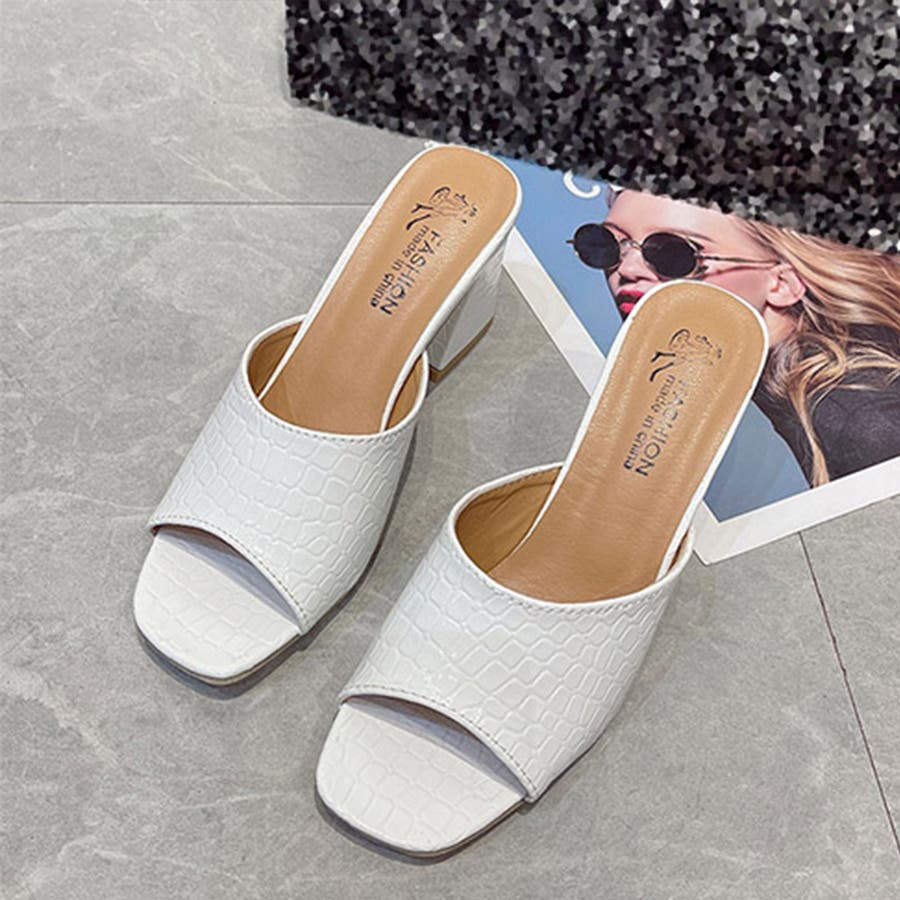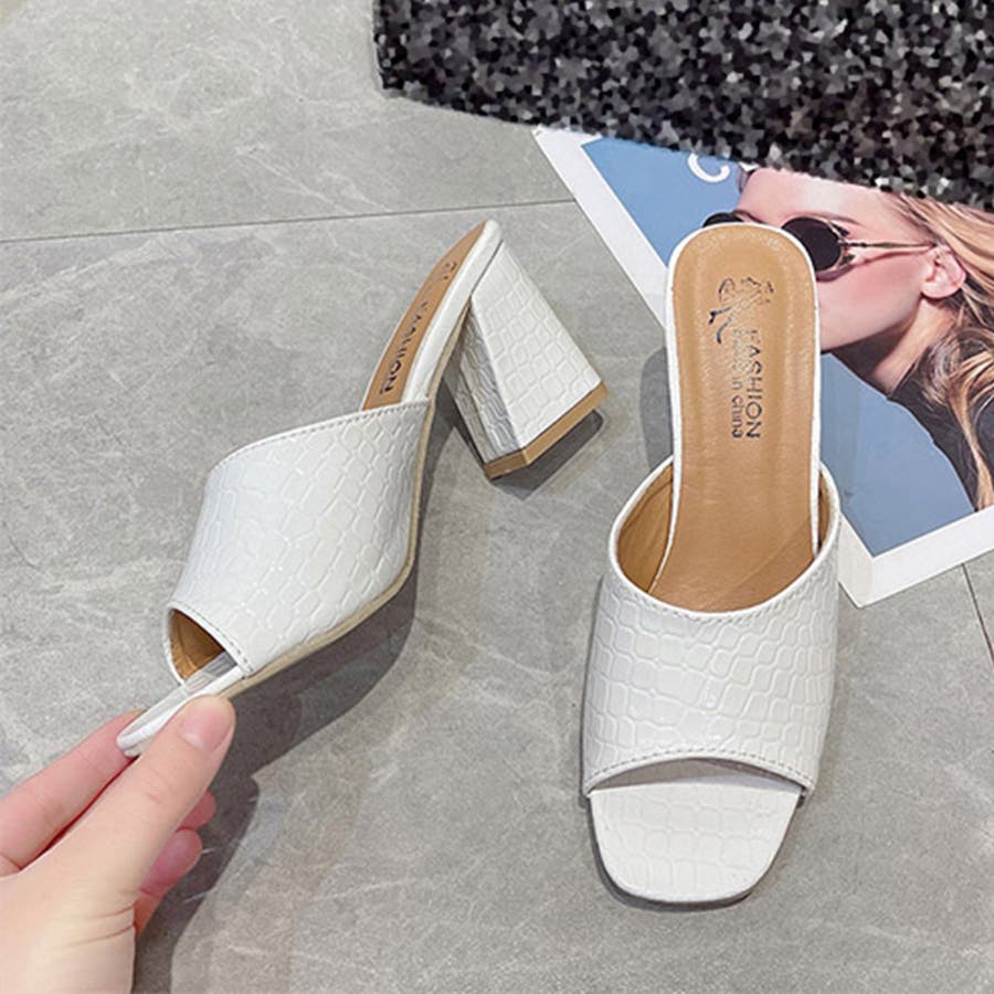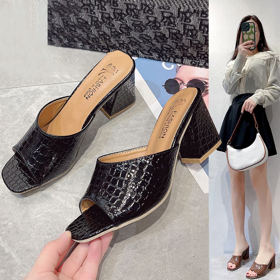 足先を美しく見せて、優雅さを演出してくれるオープントゥデザインのチャンキーヒールサンダルです