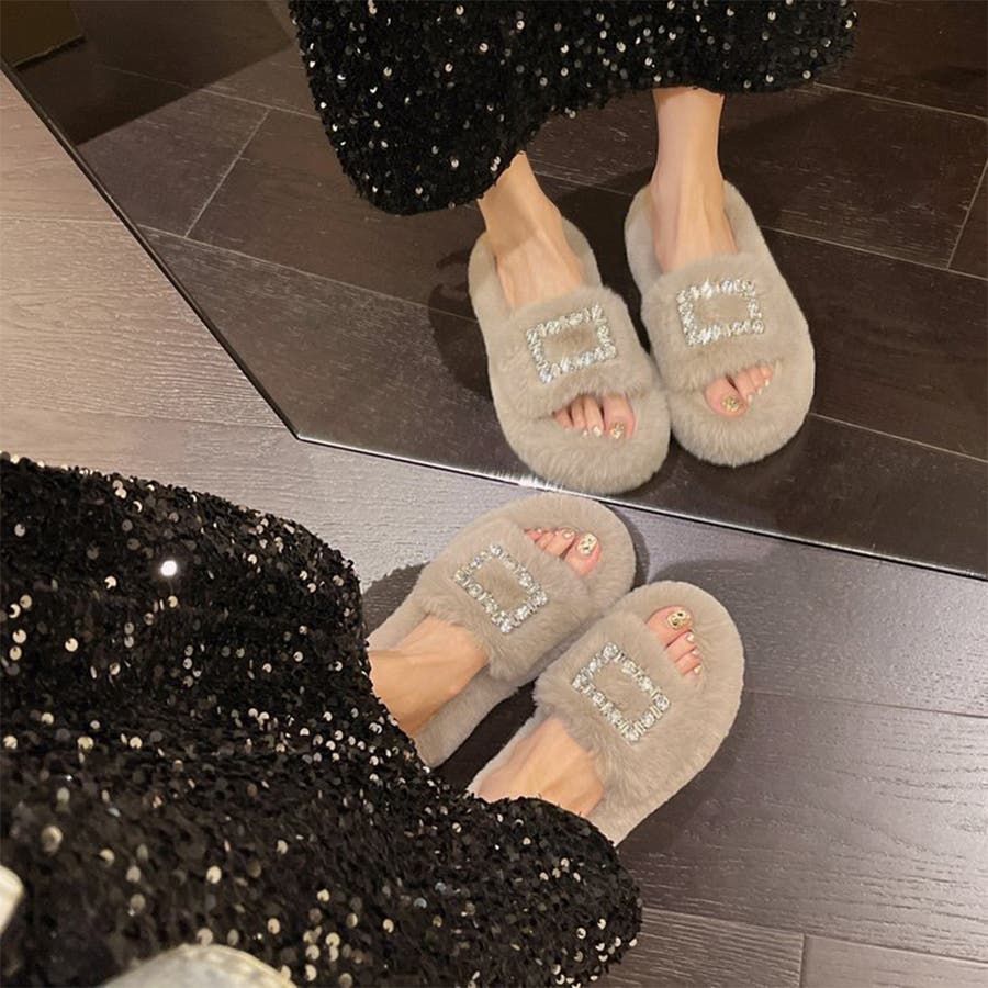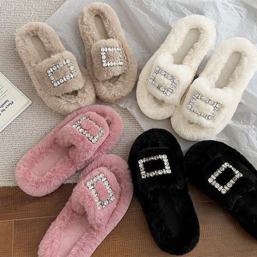 ふわふわのフェイクファー素材にゴージャスなスクエアバックルの飾りがついた、ファビュラスなルームシューズ