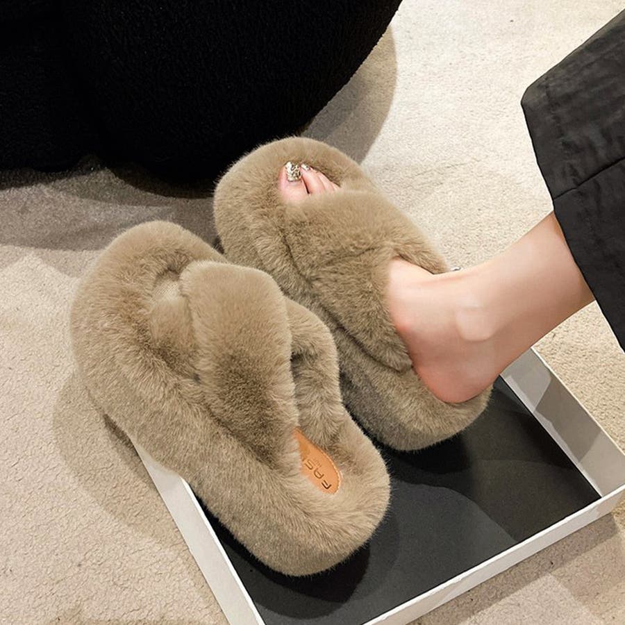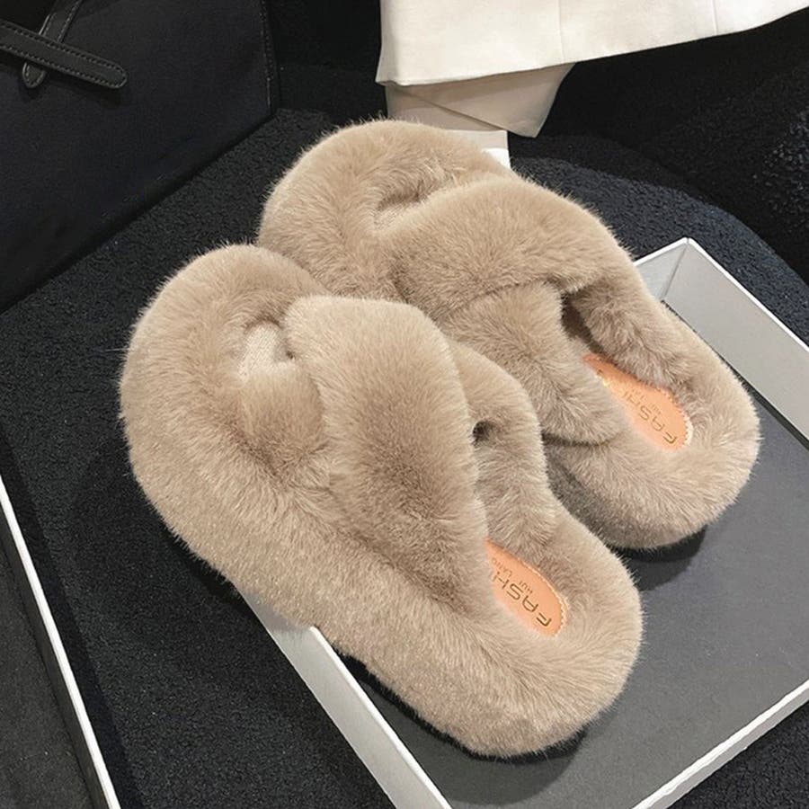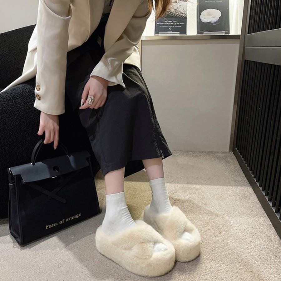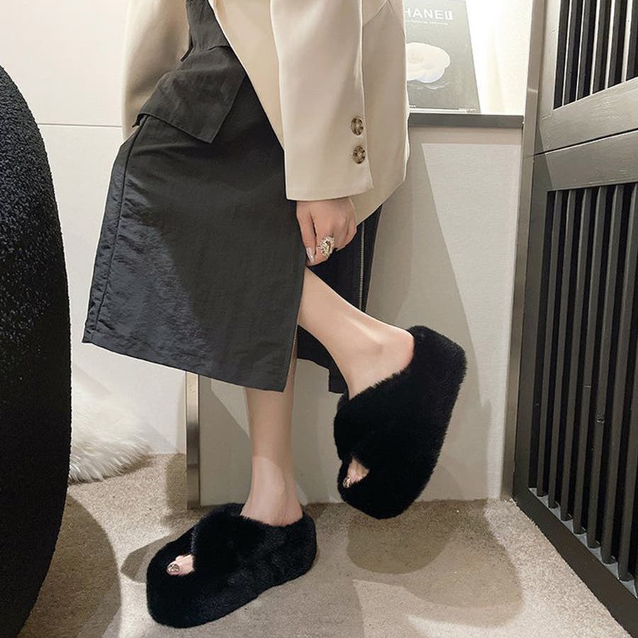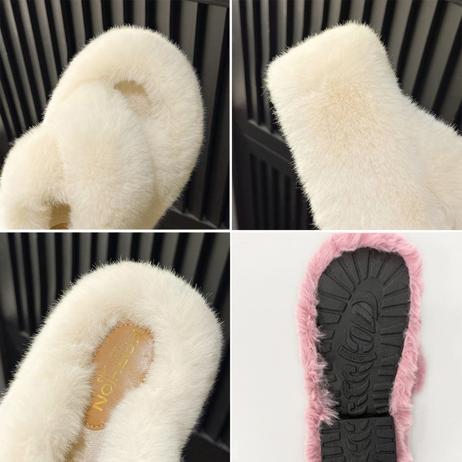 暖かくて柔らかい履き心地の良さをもたらし、もふもふの毛足の長いエコファーが大人可愛いクロスベルトサンダル
