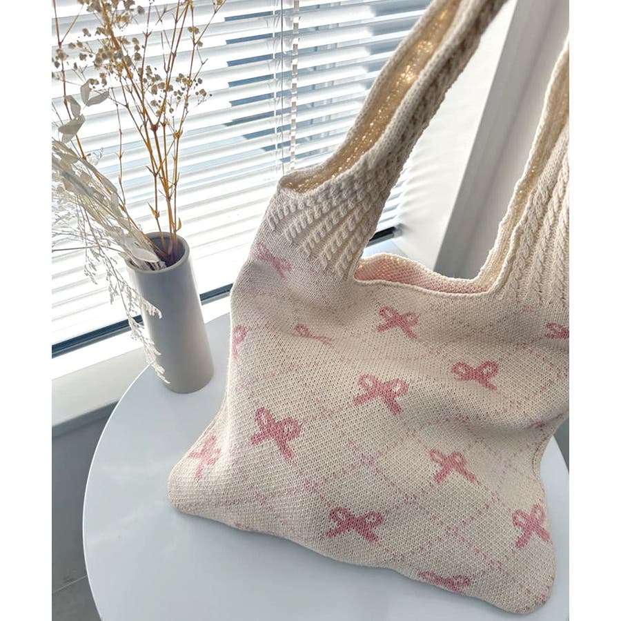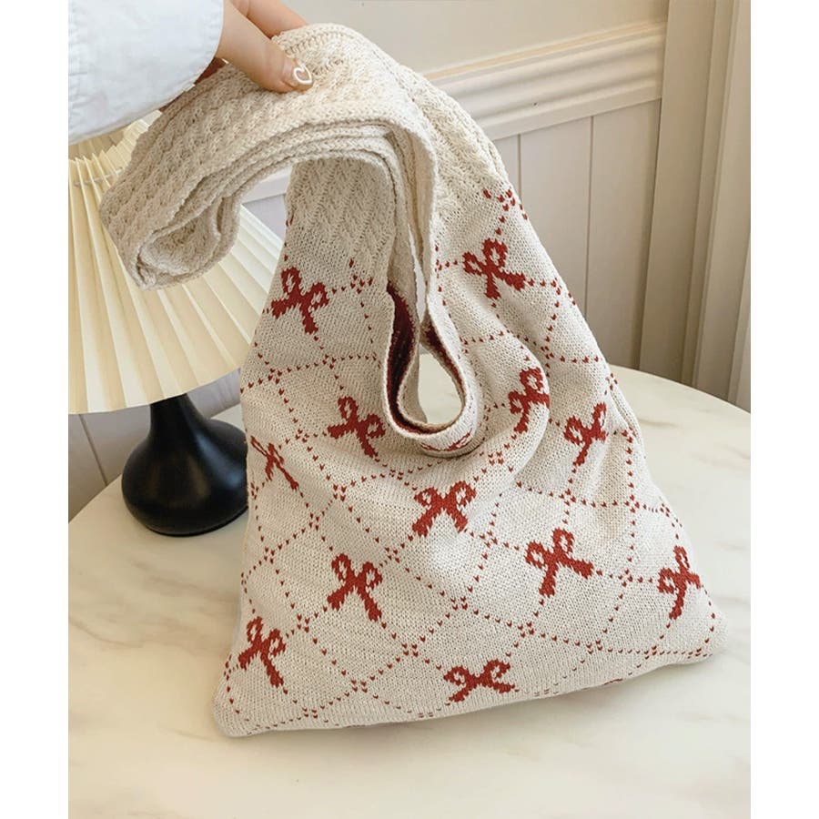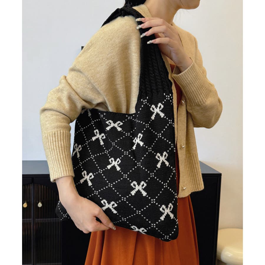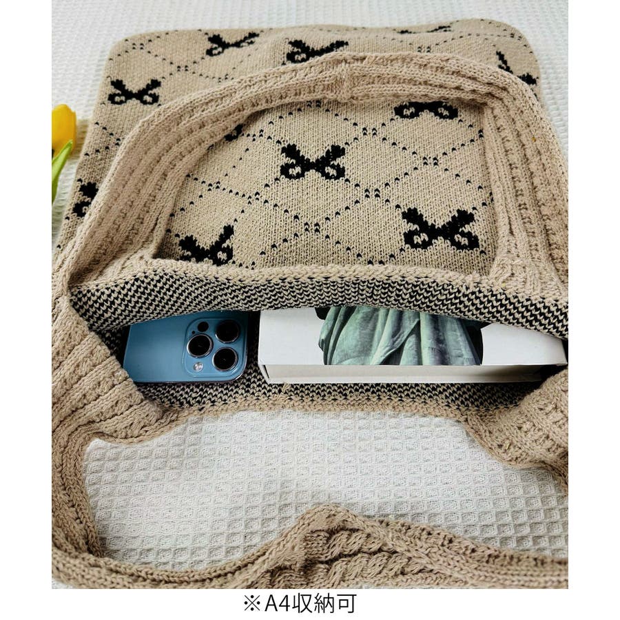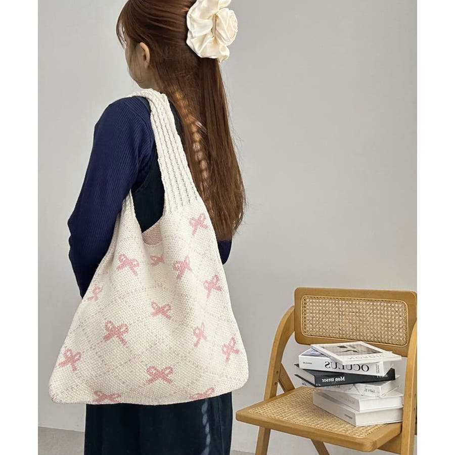 可愛いリボン柄がアクセントになり、コーデにこなれ感をプラスするニットトートバッグ