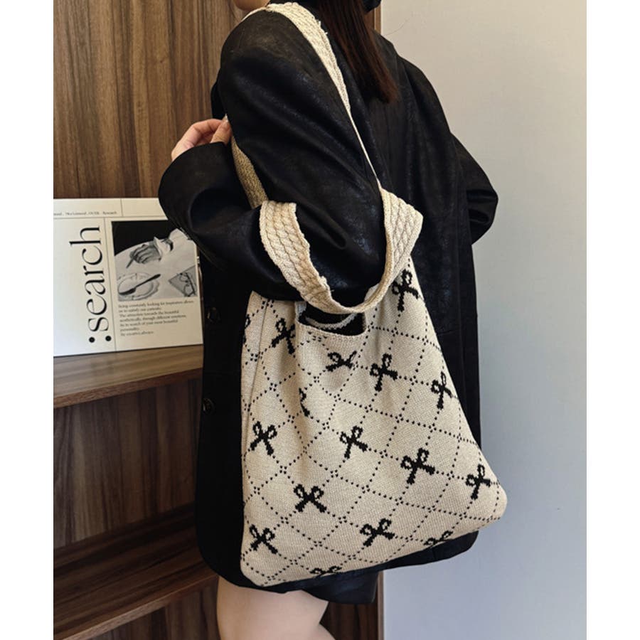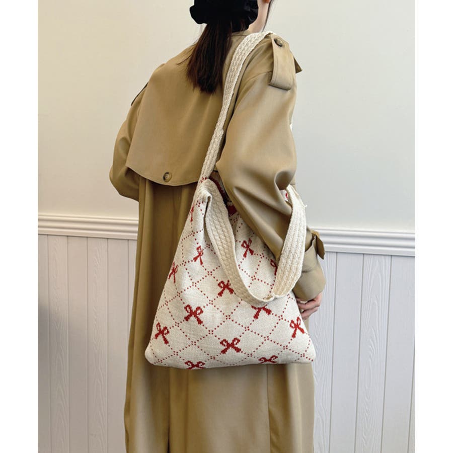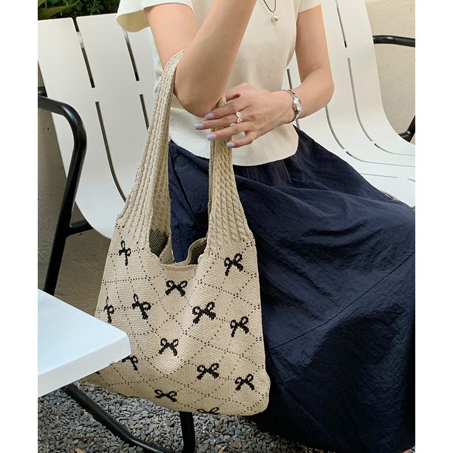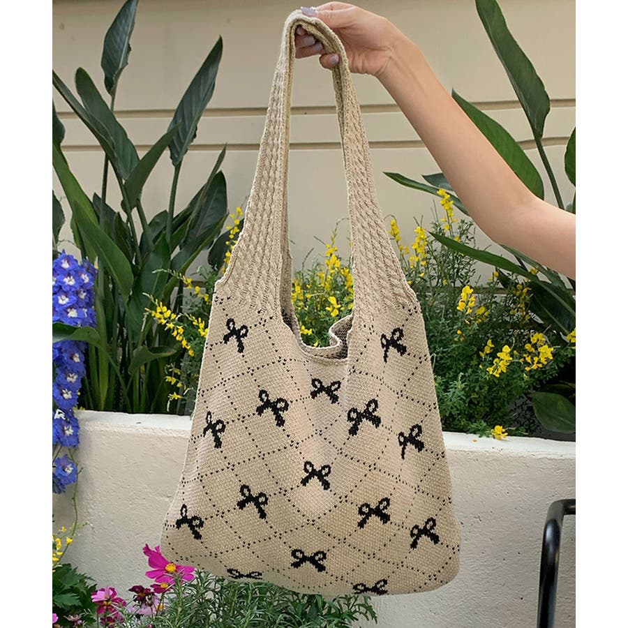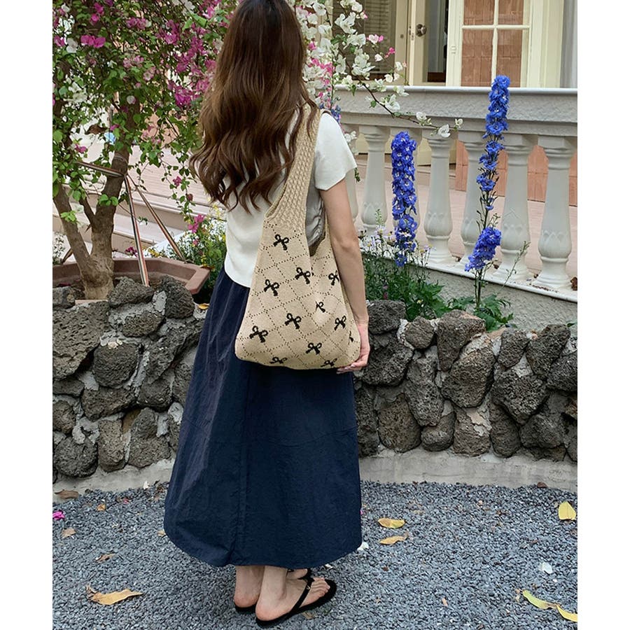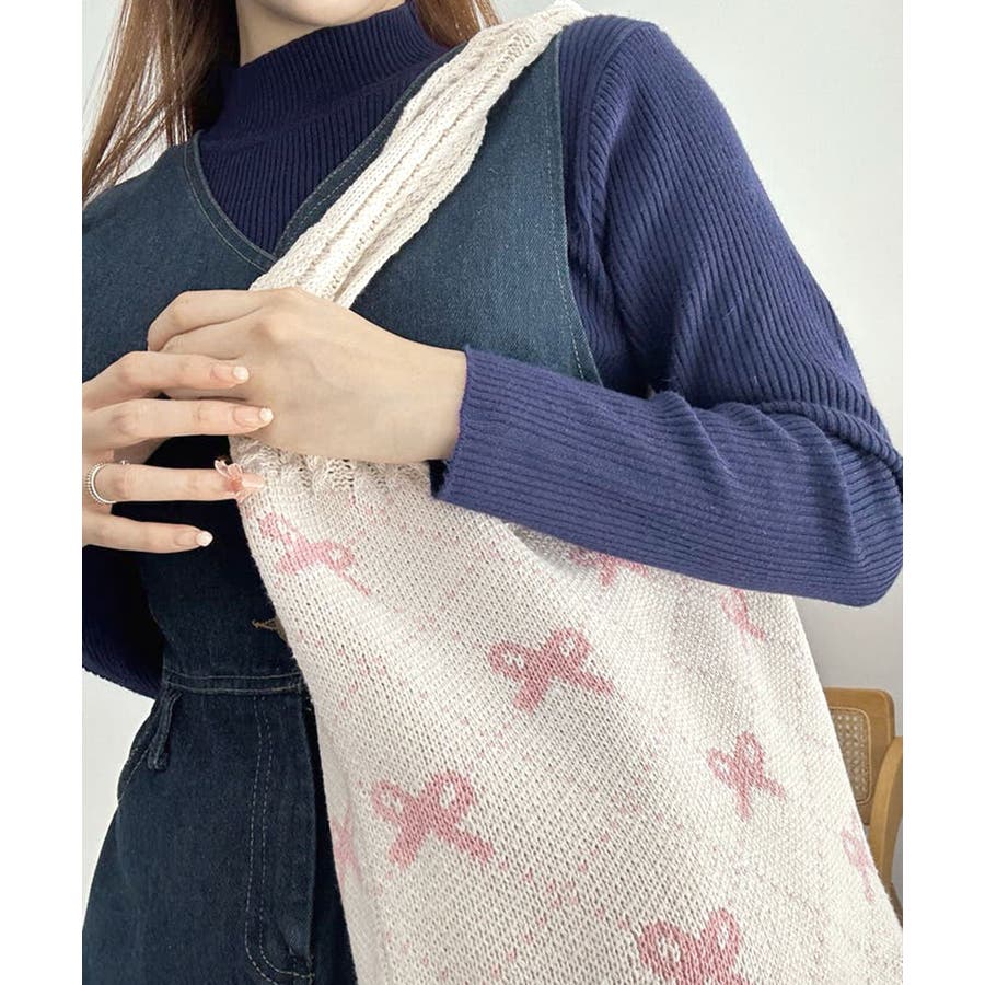 可愛いリボン柄がアクセントになり、コーデにこなれ感をプラスするニットトートバッグ