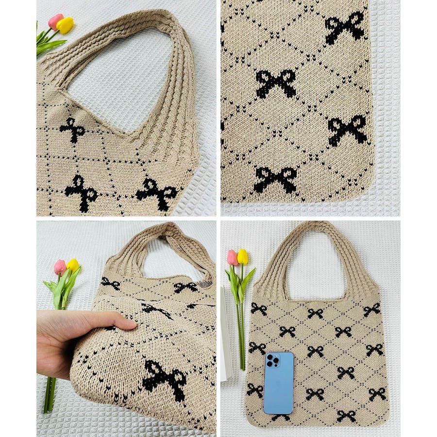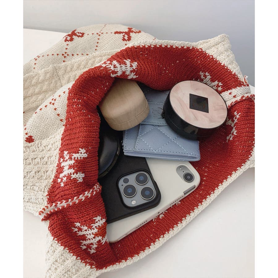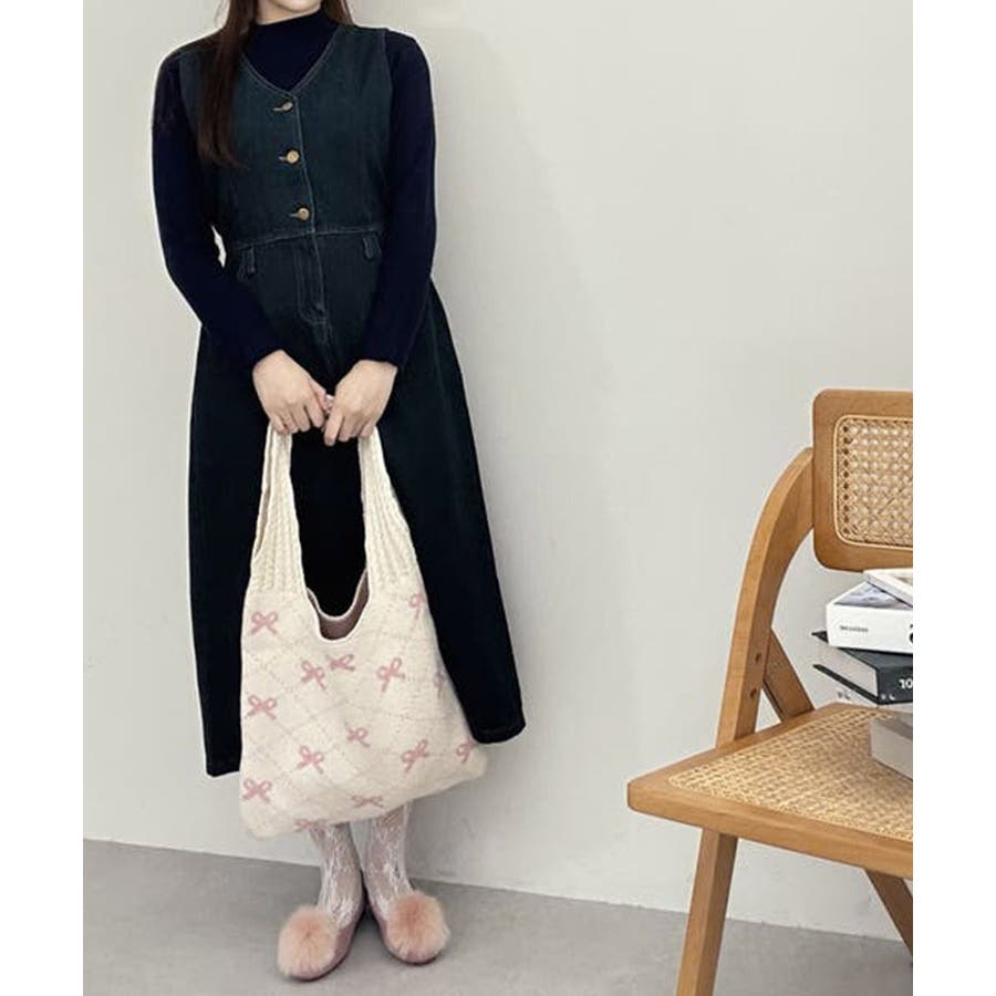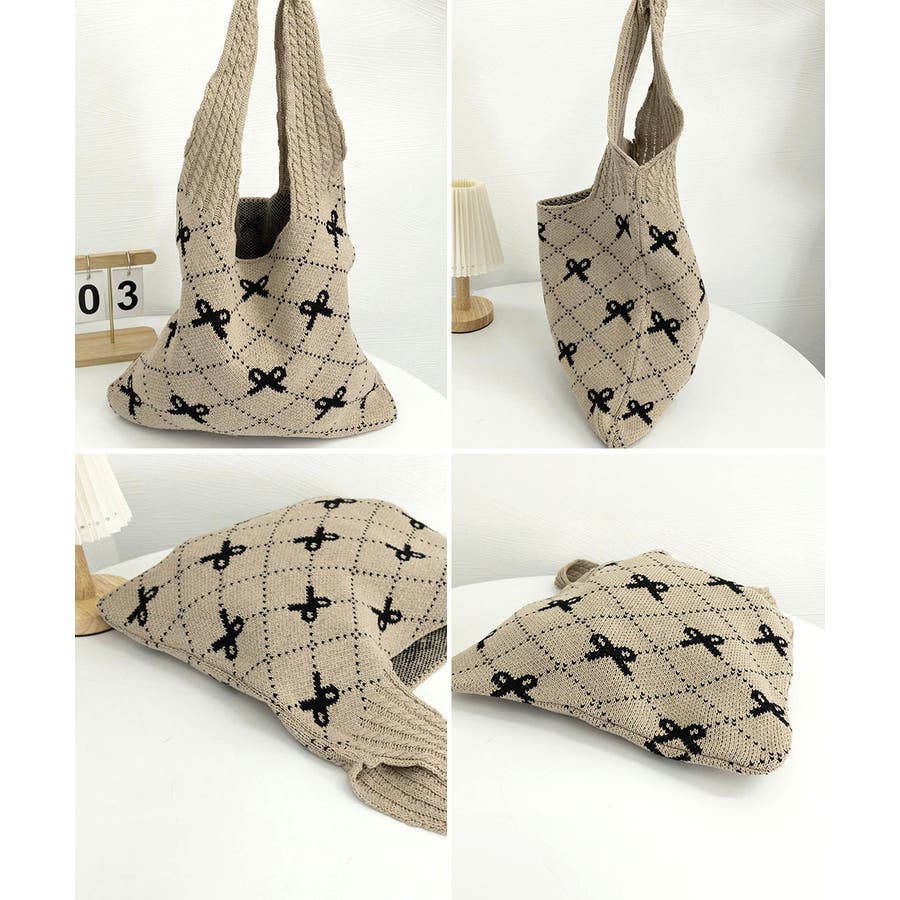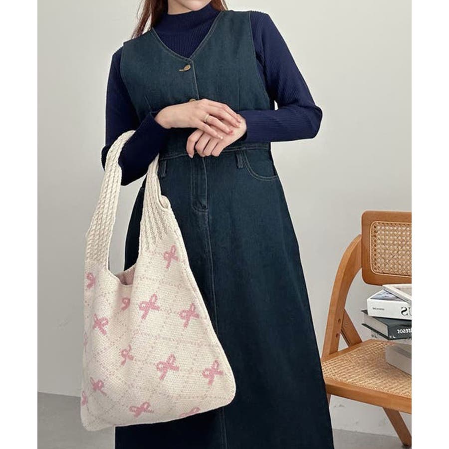 可愛いリボン柄がアクセントになり、コーデにこなれ感をプラスするニットトートバッグ