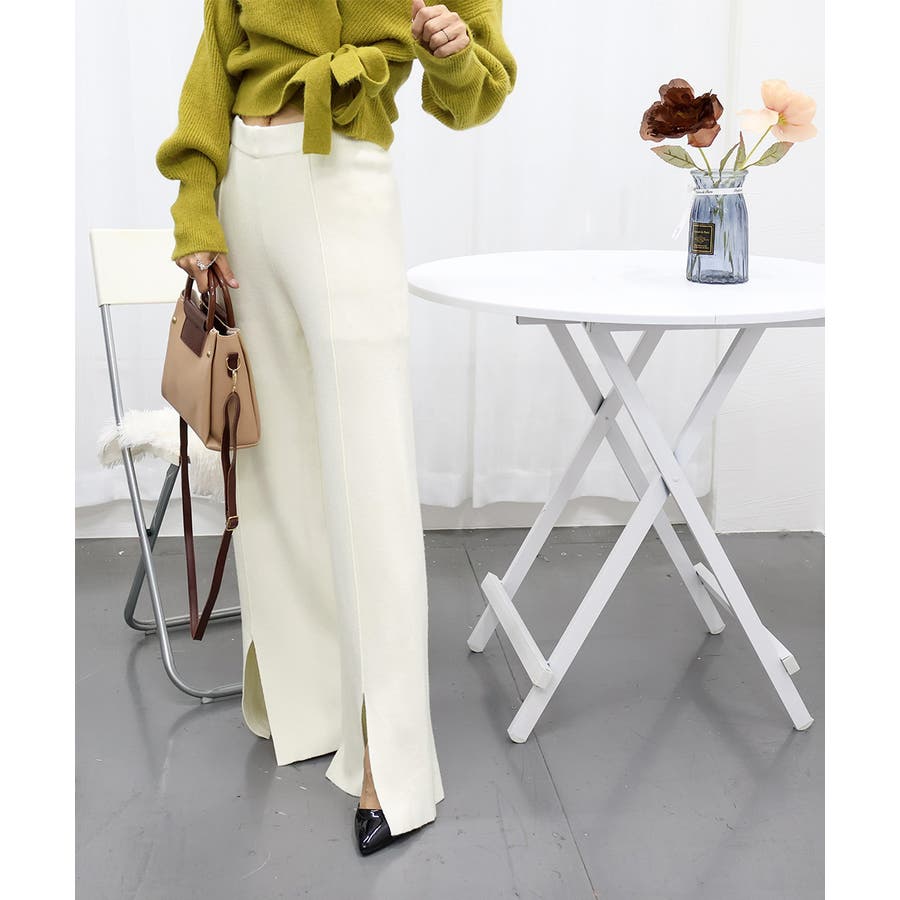 ちくちくせず滑らかな肌触りが魅力ポイント、上質なニット素材で仕上げた秋冬のオシャレに欠かせないセンタープレス仕様のセミワイドパンツ