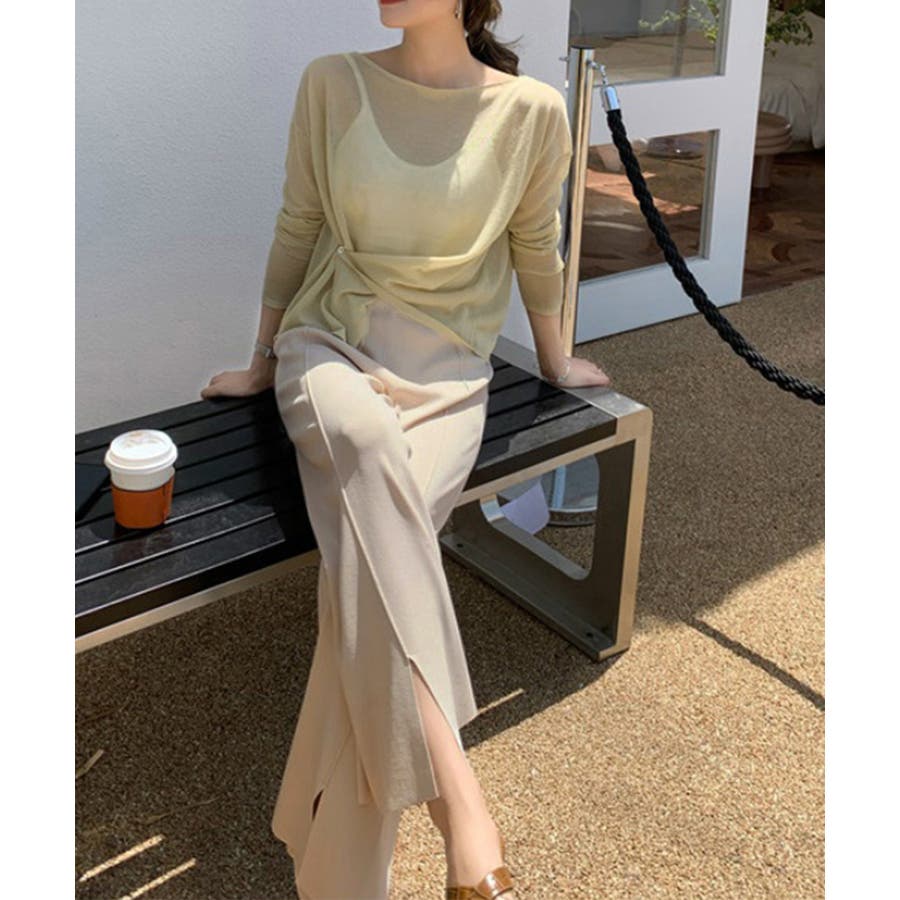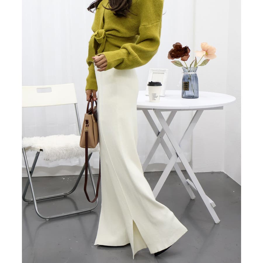 前裾にスリットが入っており、足首をすっきりと見せてくれ、軽やかに穿けて女性らしさを引き立てる