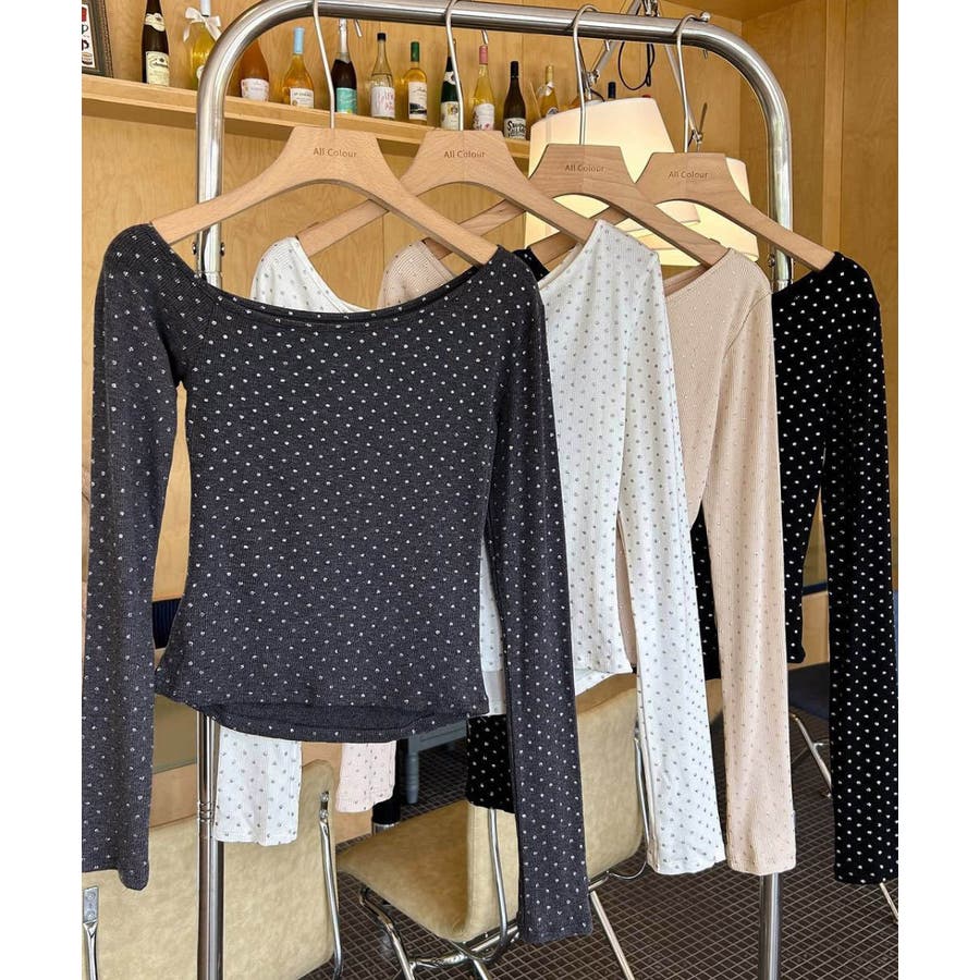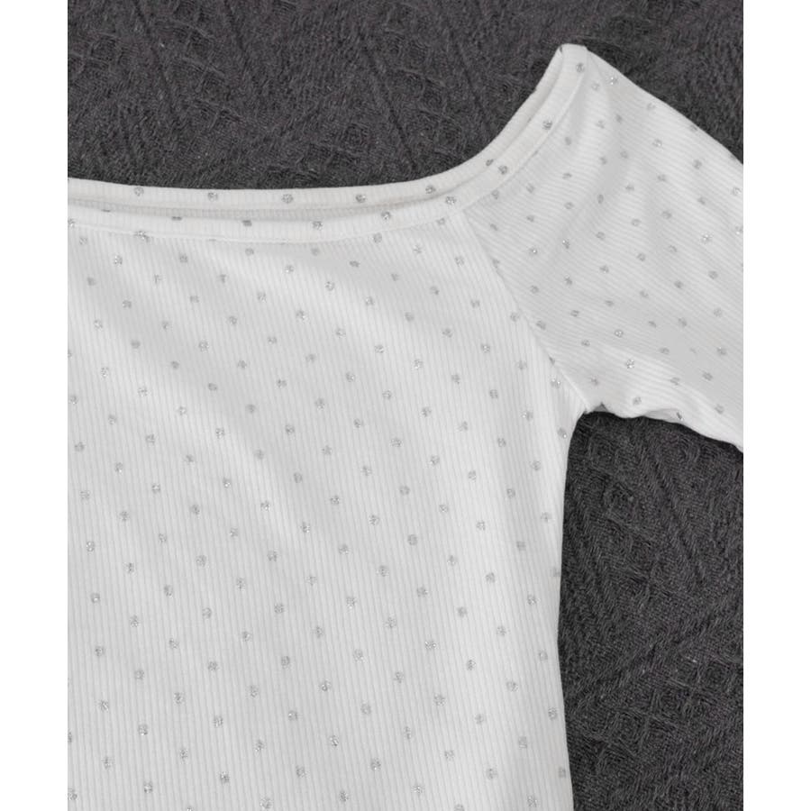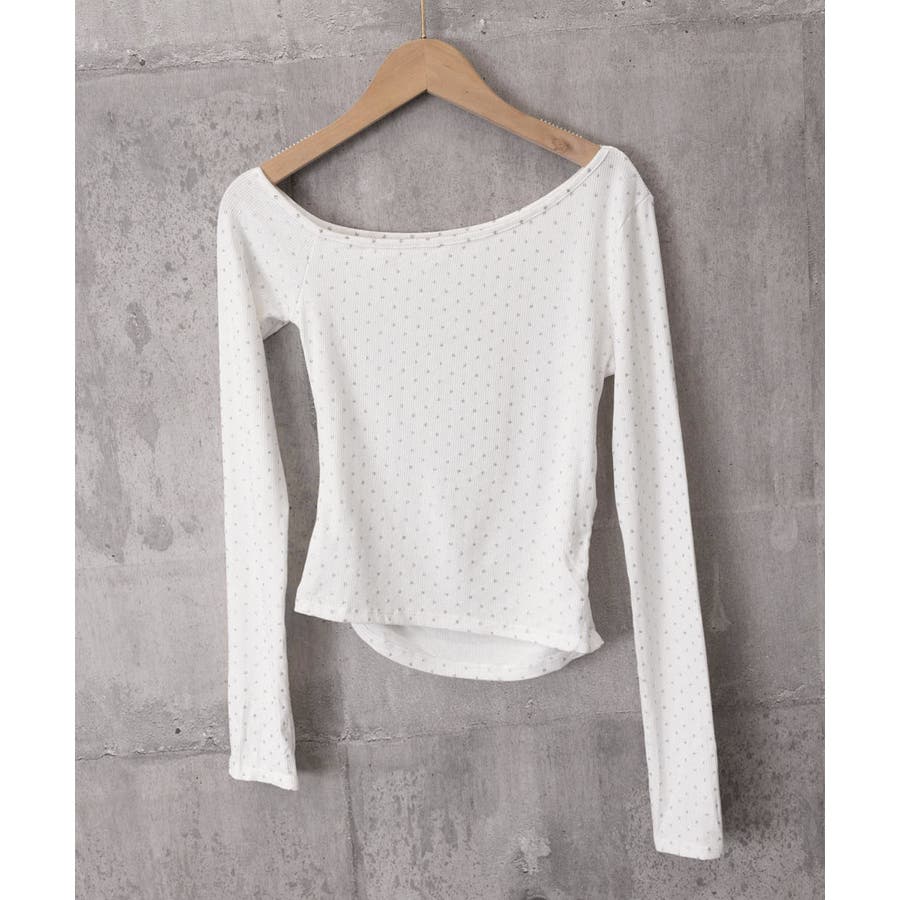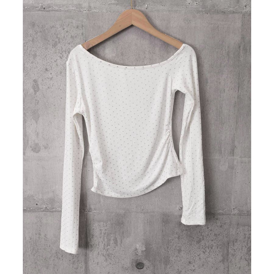 きらめくラメをあしらった、アシンメトリーなネックラインの長袖Tシャツ。