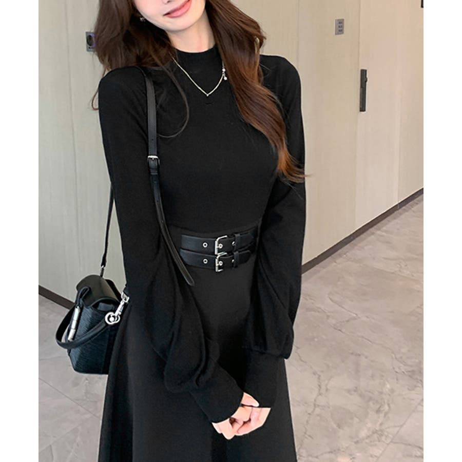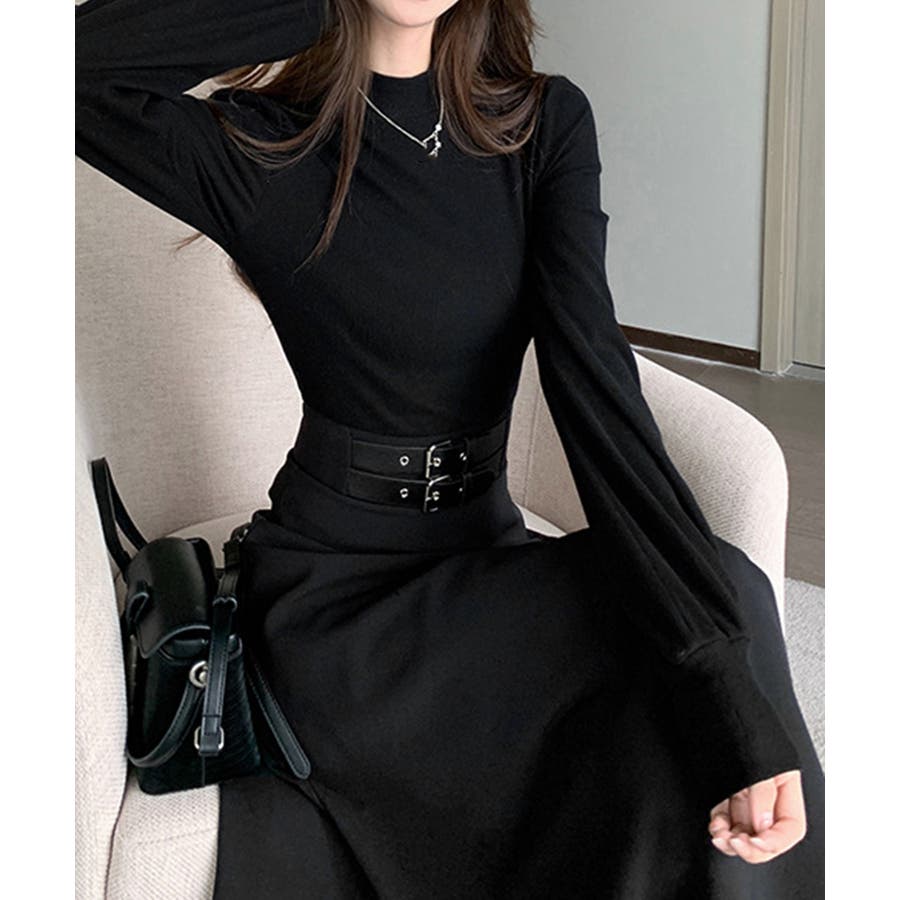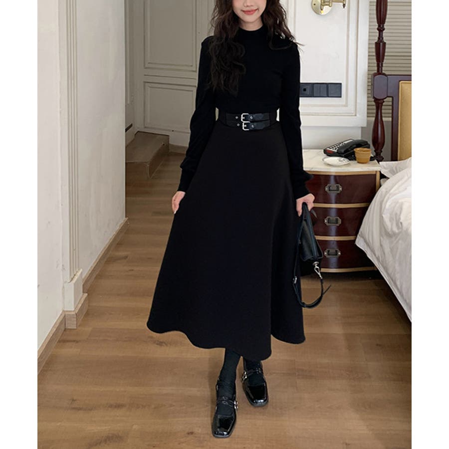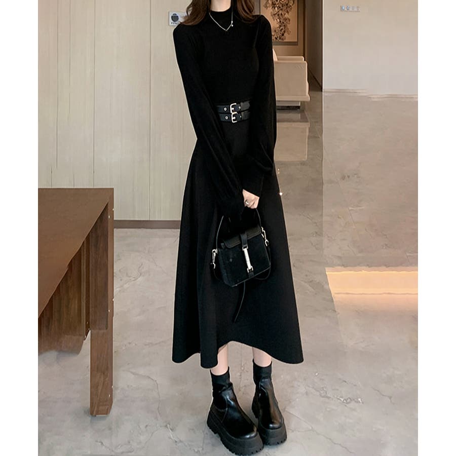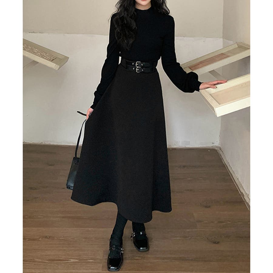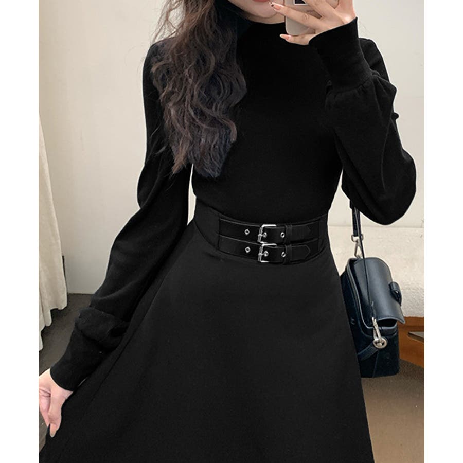 プチハイネック Aラインワンピース 大人可愛い ハイウエストフレアワンピース長袖 体型カバー 着やせワンピース黒 韓国風