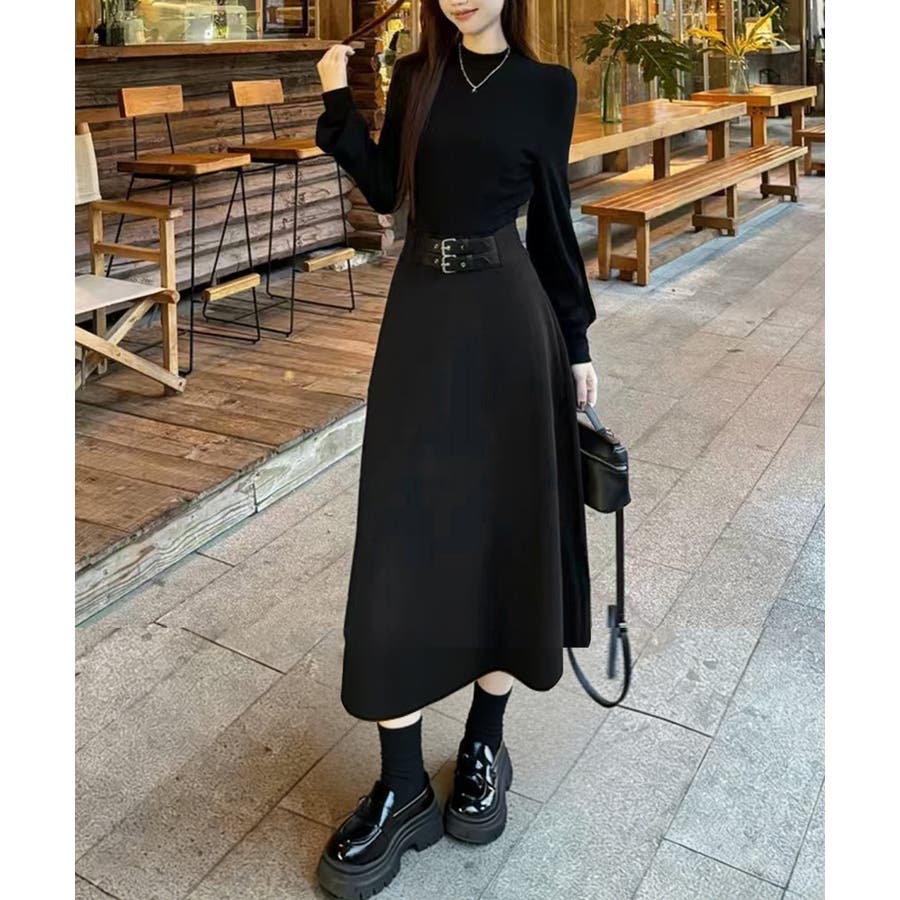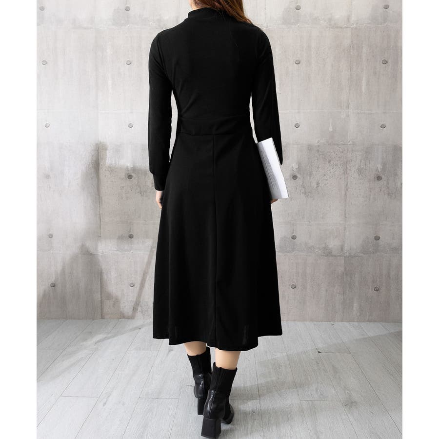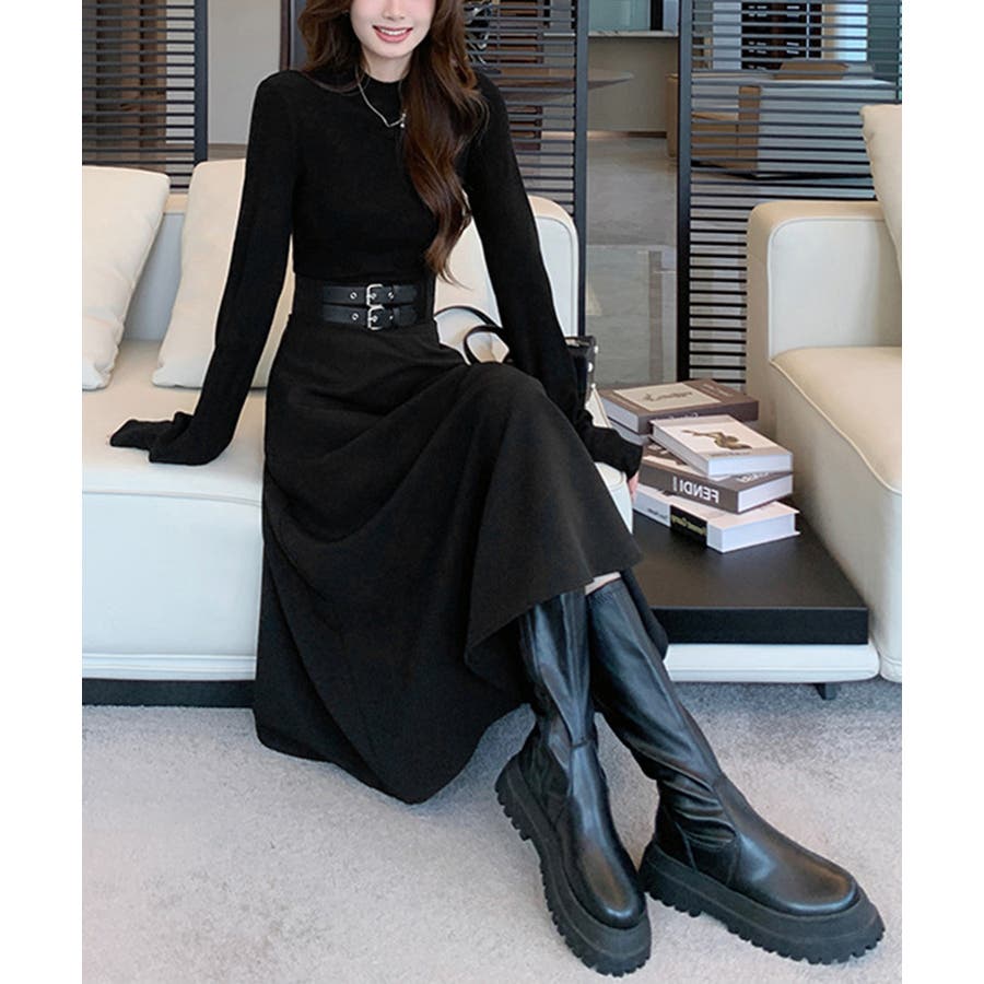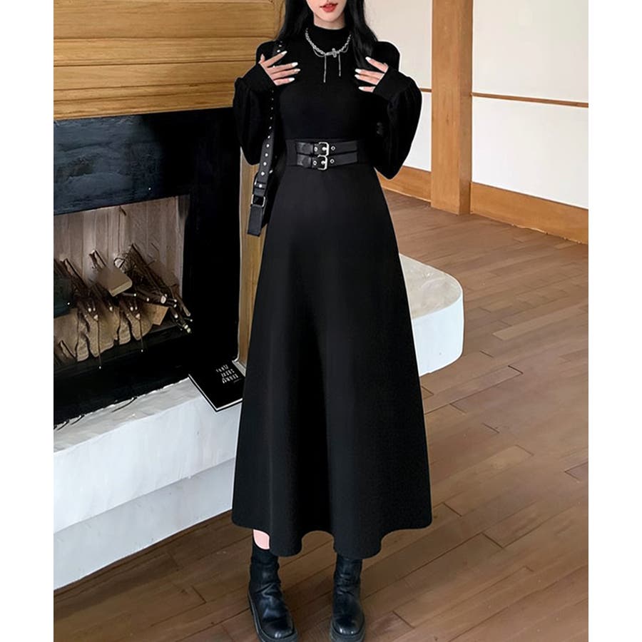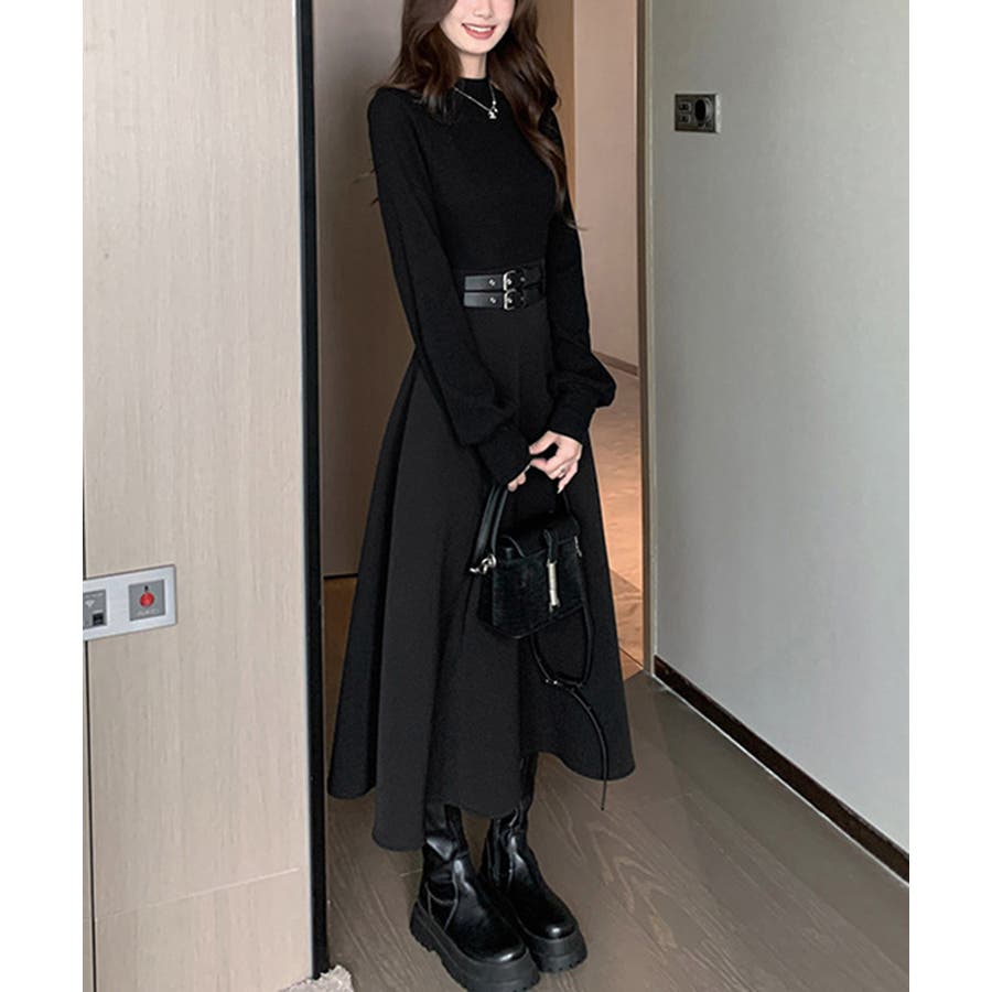 プチハイネック Aラインワンピース 大人可愛い ハイウエストフレアワンピース長袖 体型カバー 着やせワンピース黒 韓国風