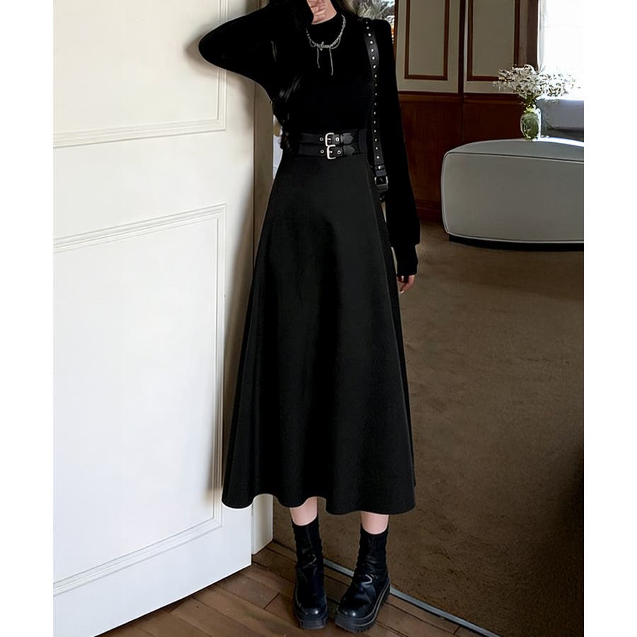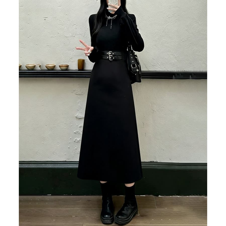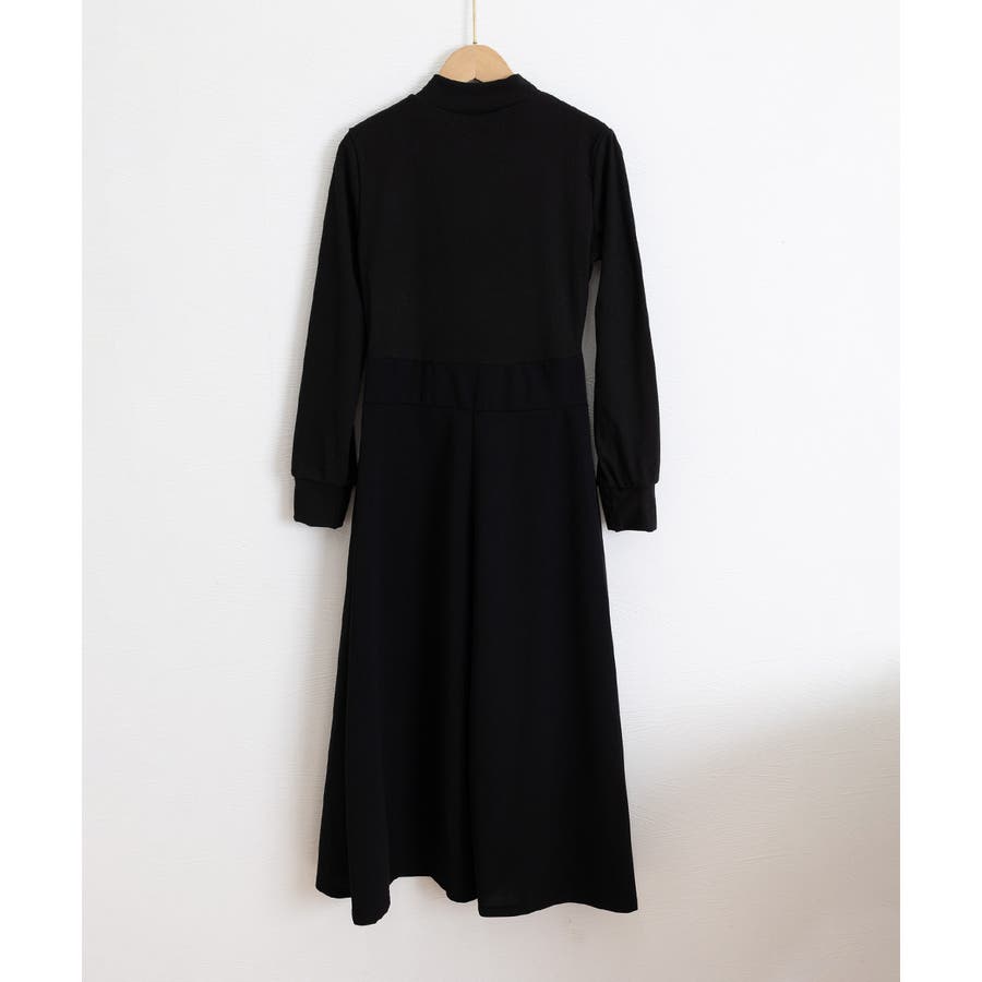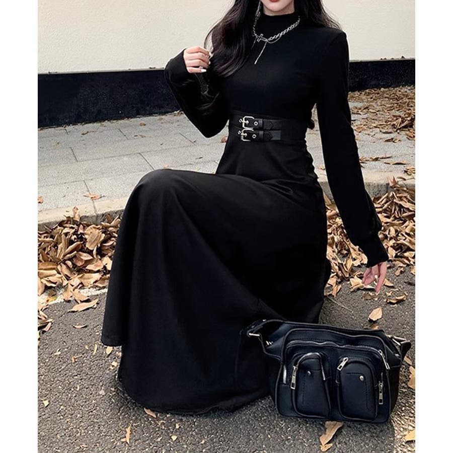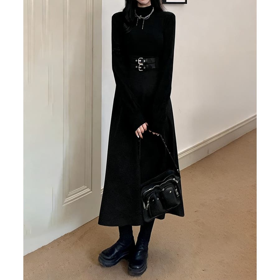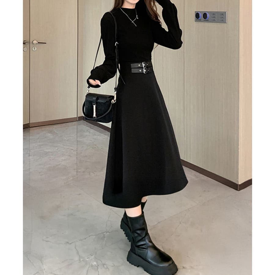 プチハイネック Aラインワンピース 大人可愛い ハイウエストフレアワンピース長袖 体型カバー 着やせワンピース黒 韓国風