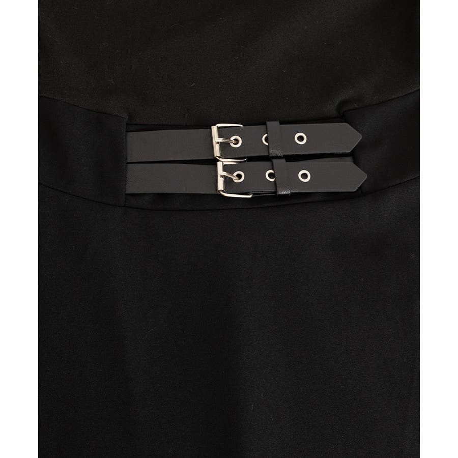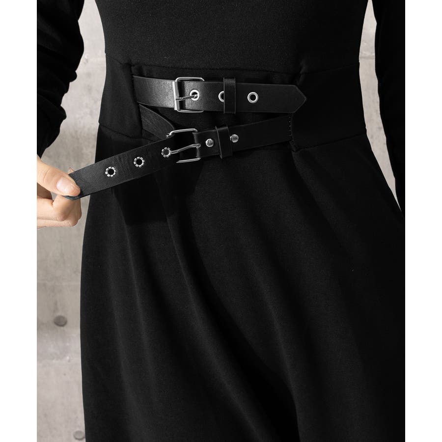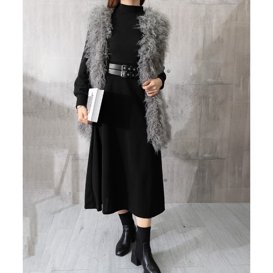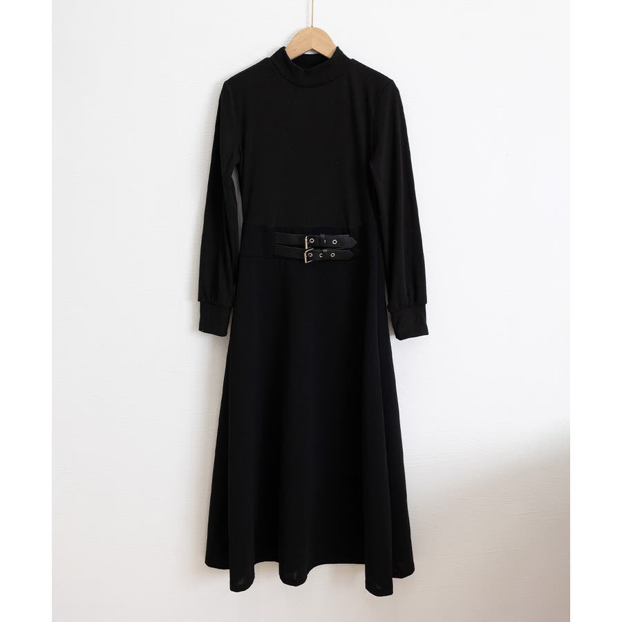 異素材切り替えとウエストベルト飾りがアクセントのロング丈ワンピース。
