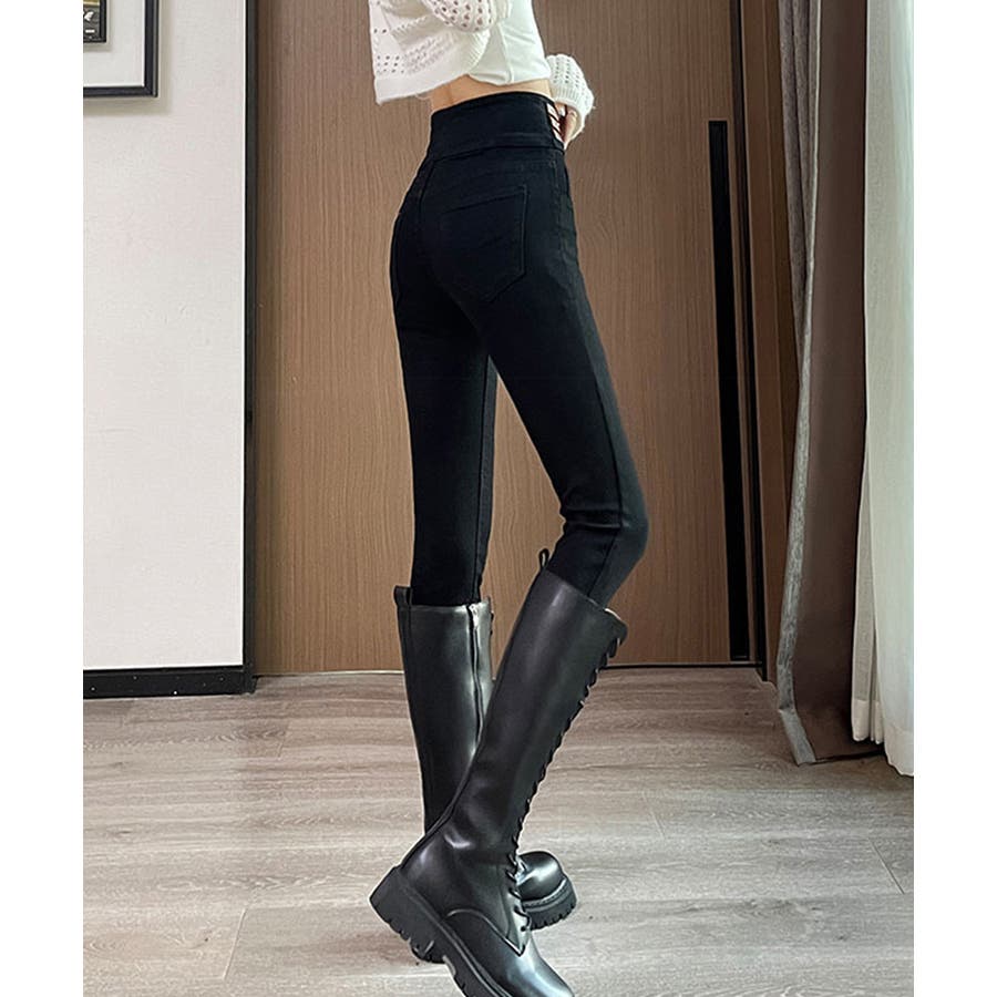 ハイウエスト×スキニーシルエットで脚長に見える。