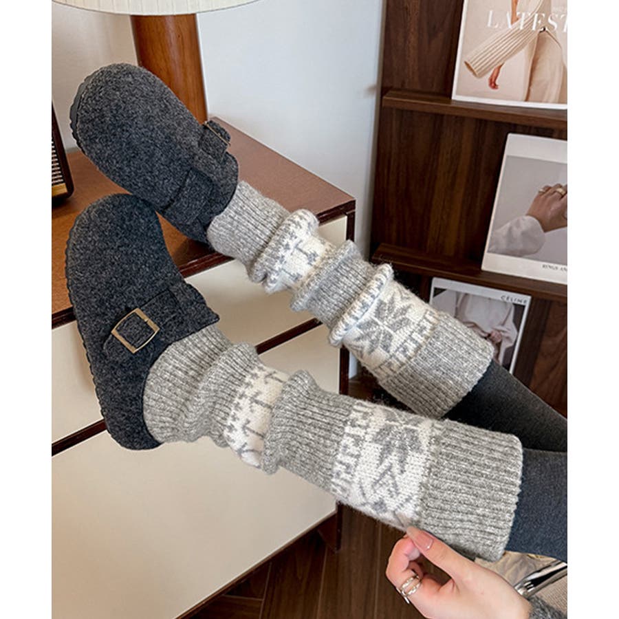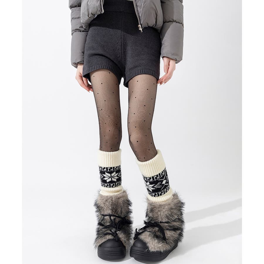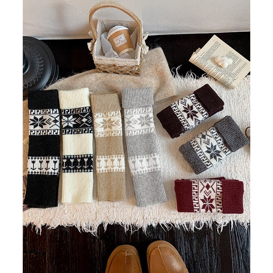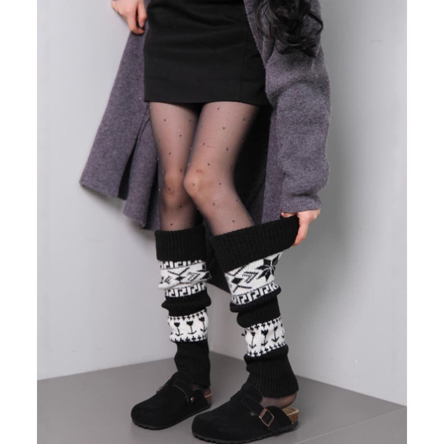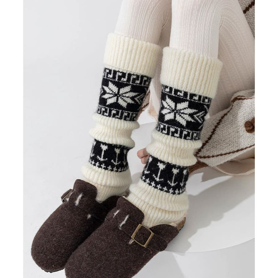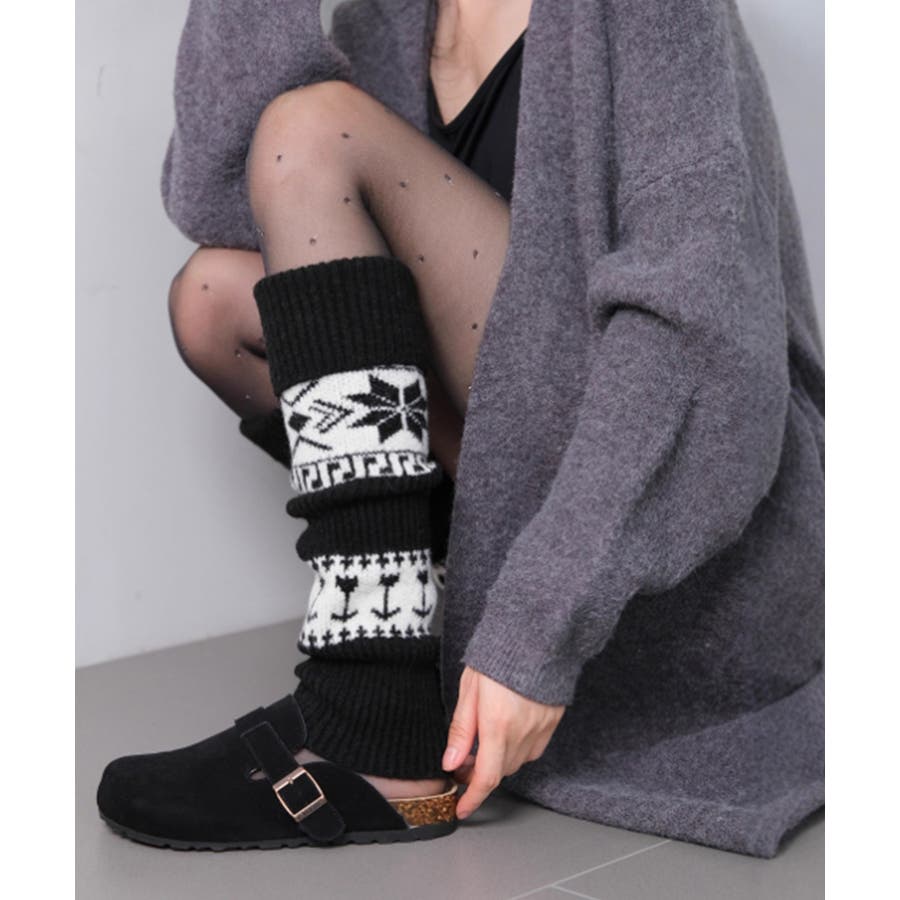 ウールタッチの厚手ニット素材を使用した、レディーススノーフレーク柄レッグウォーマー。