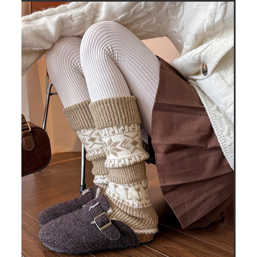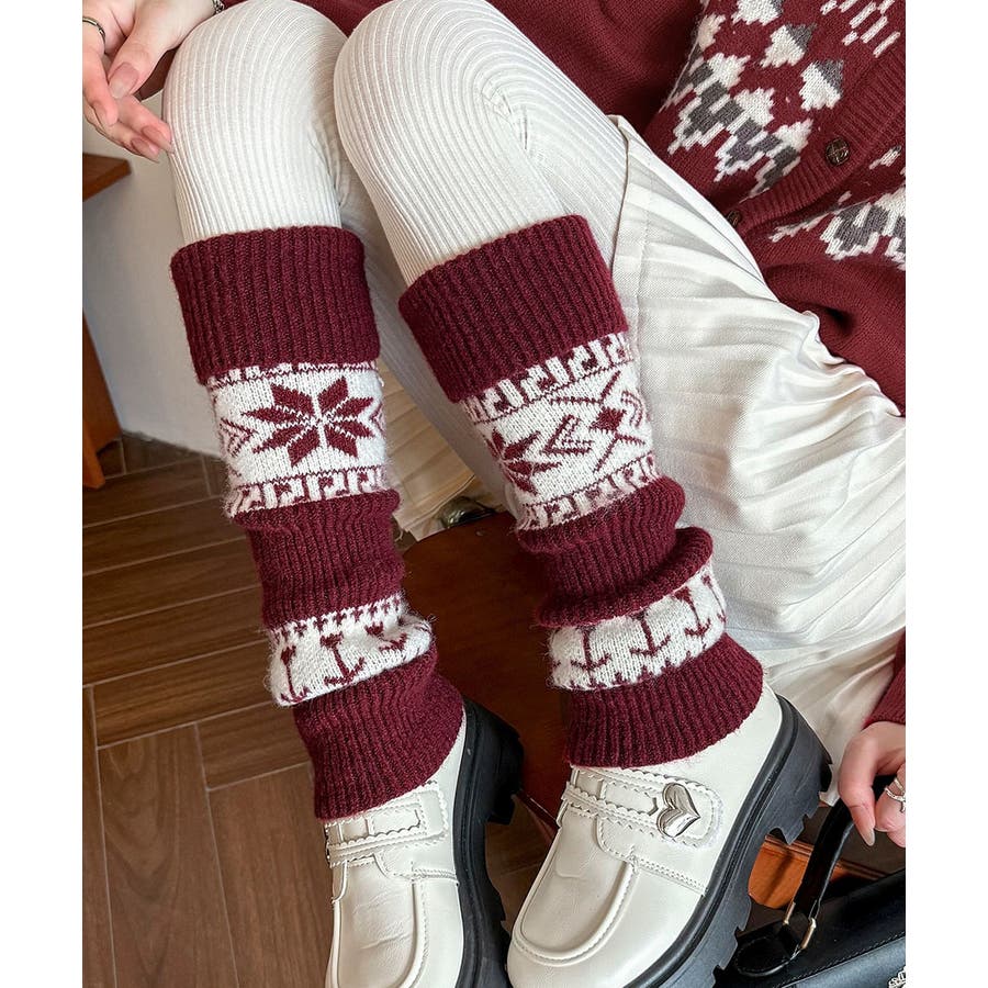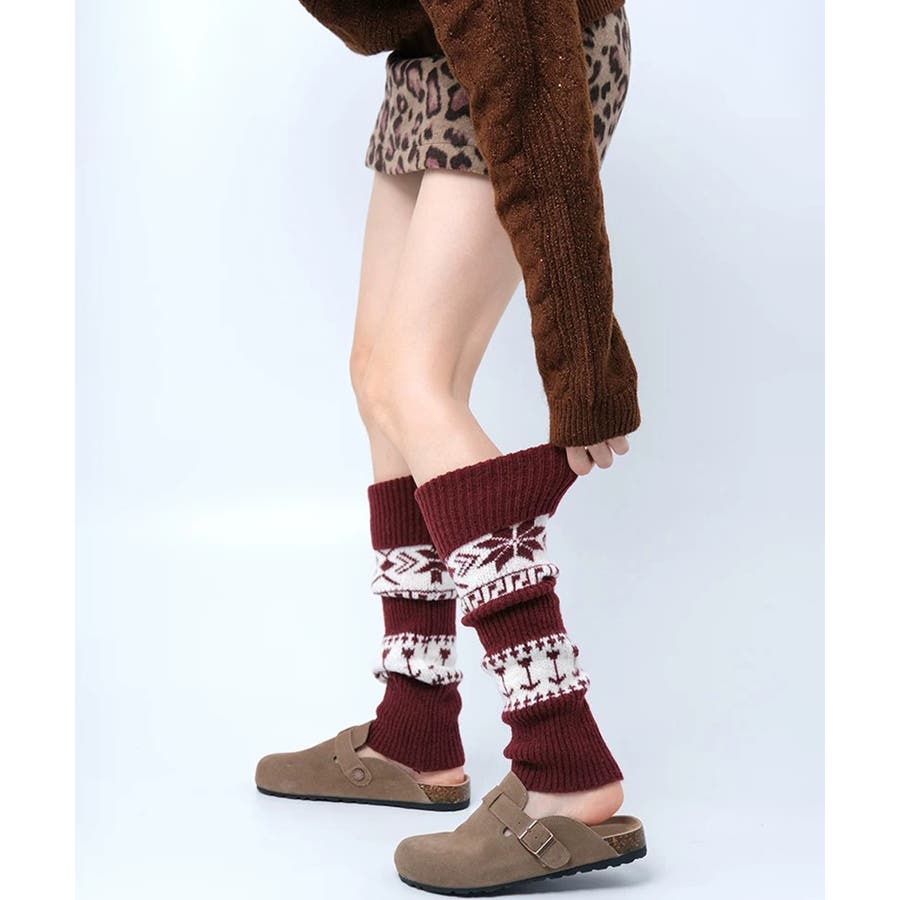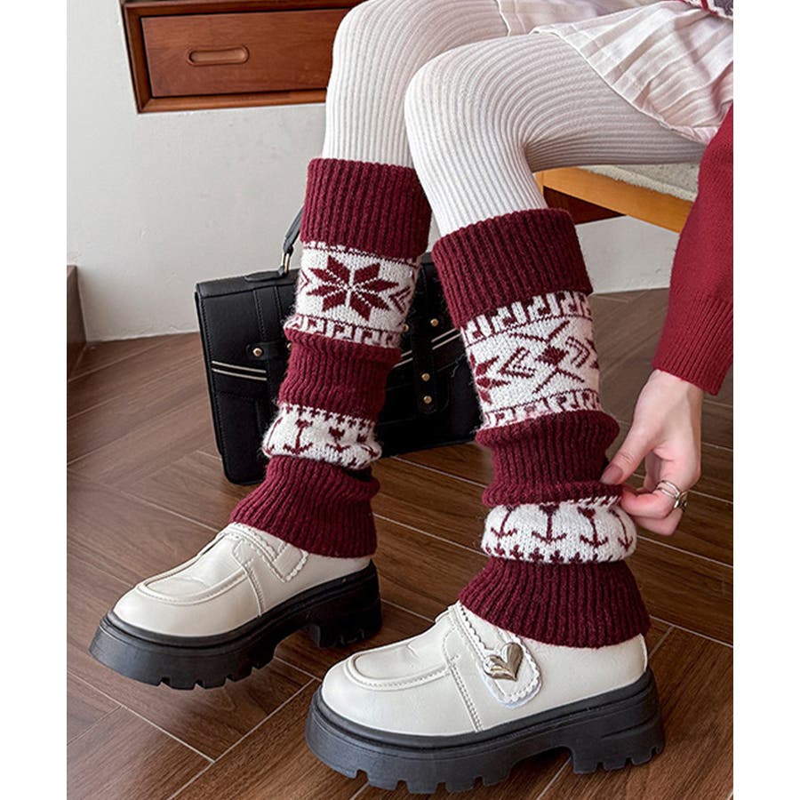 【ワインレッド】ノルディック柄レッグウォーマー暖かい靴下