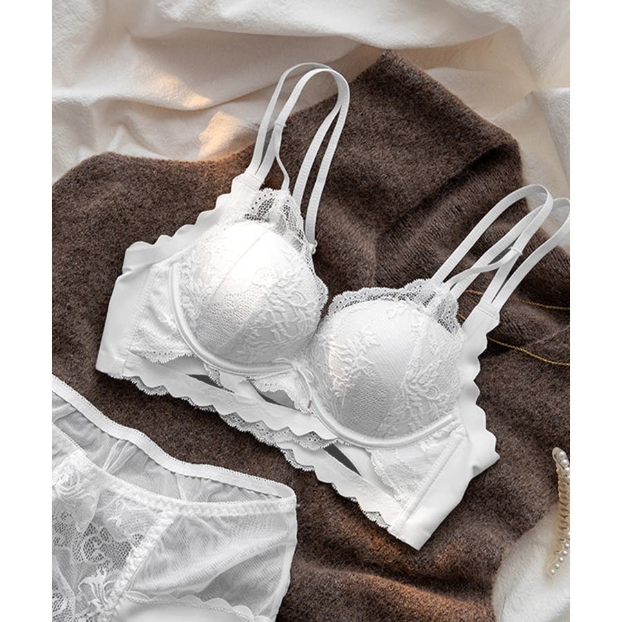 流れるようなボタニカル柄のレースがエレガントな、ブラジャー&ショーツのセット