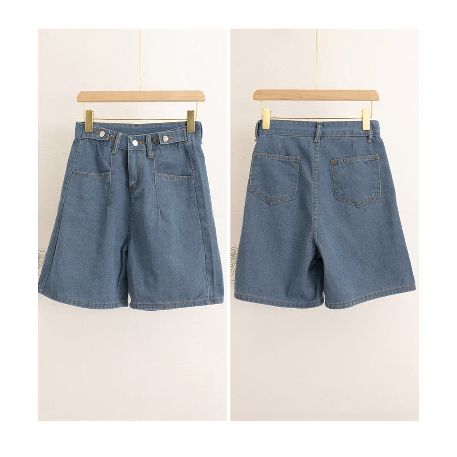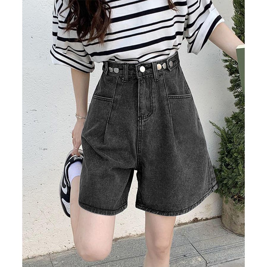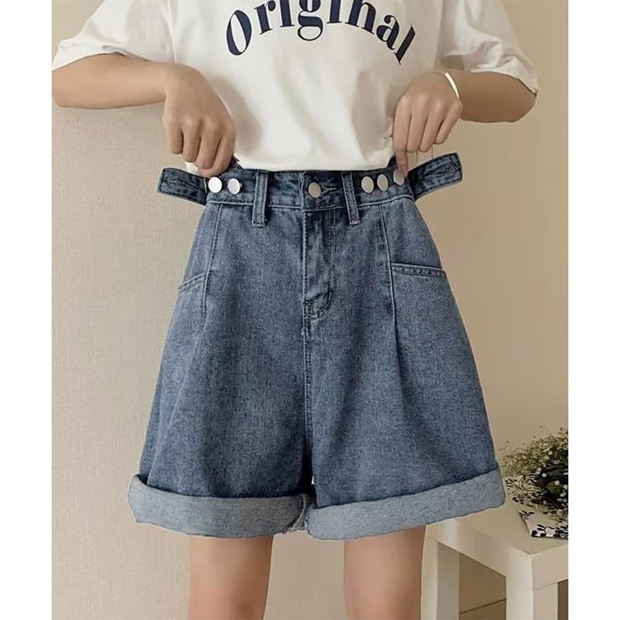 ウエストのボタンでサイズ調節が可能な、ハイウエストデニムハーフパンツ