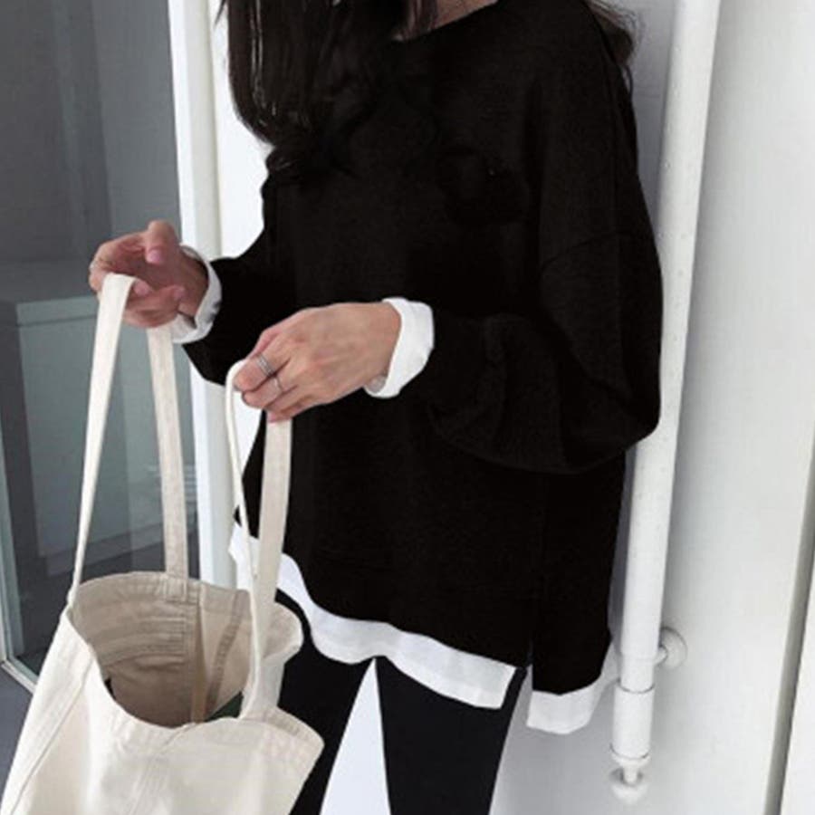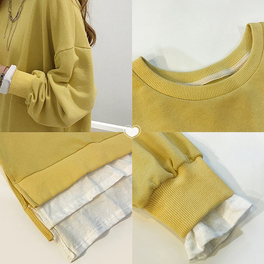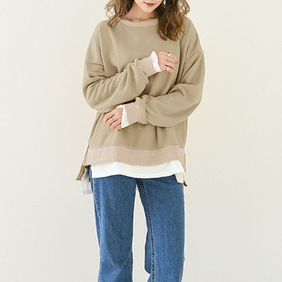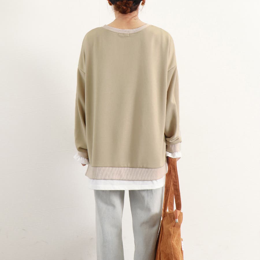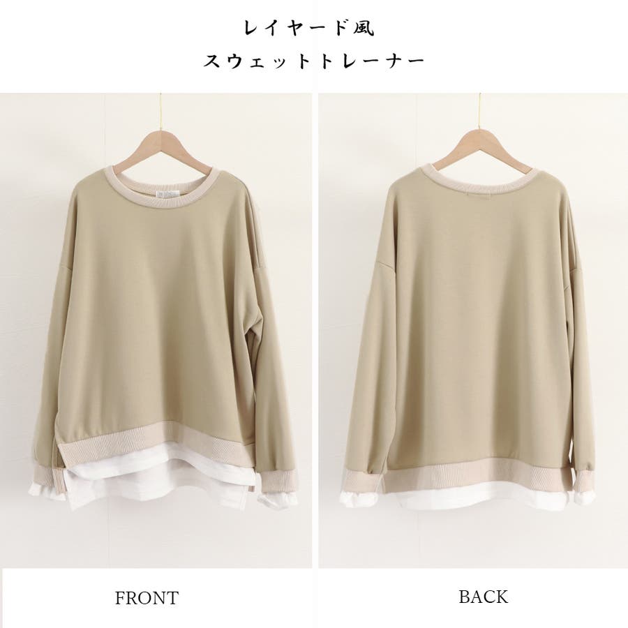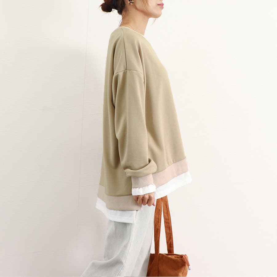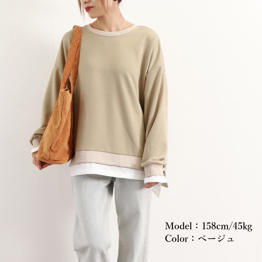 カジュアルのデザインが魅力のレイヤード風ゆるスウェットトレーナーです