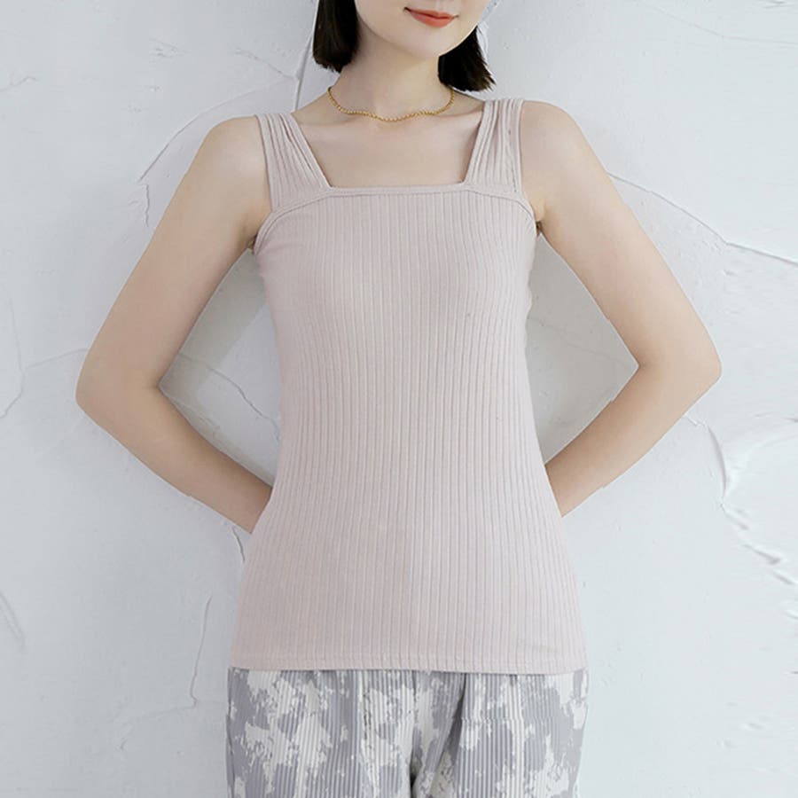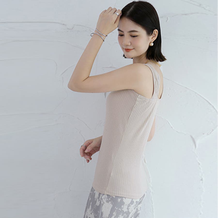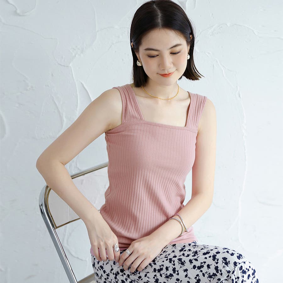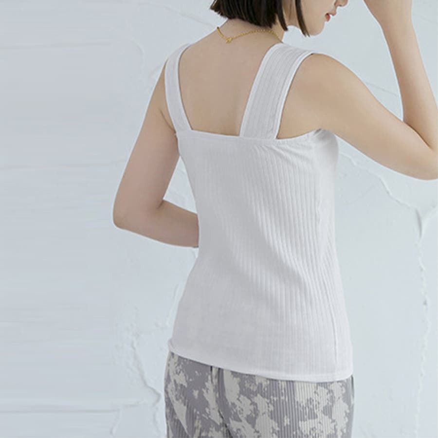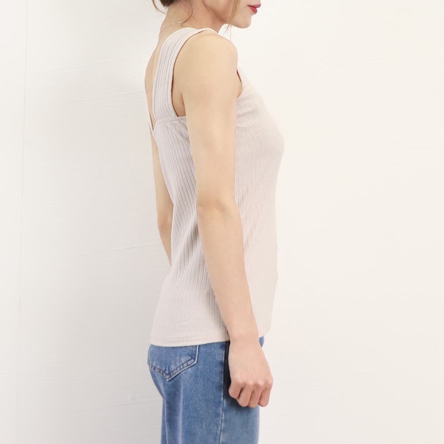 肩紐部分が下着の紐をすっぽり覆えるように太く作られたリブタンクトップ