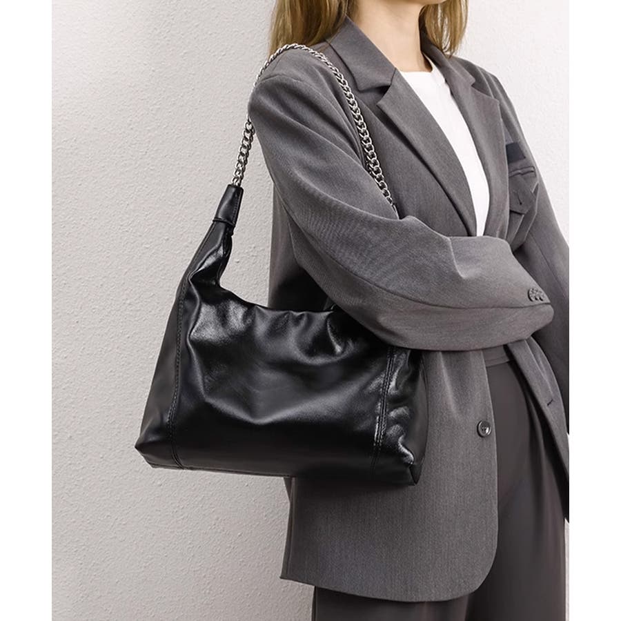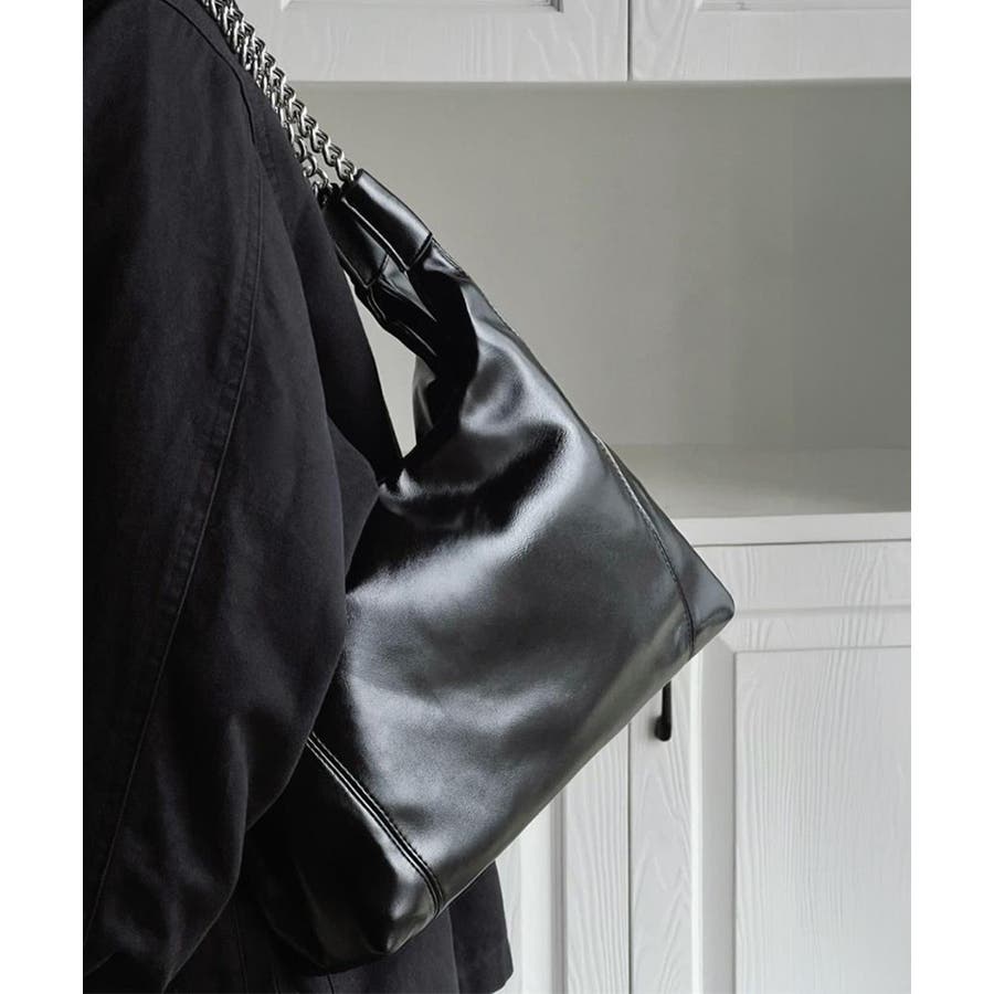 光沢のある上質な素材感で、カジュアルからフォーマルまで幅広く活躍するチェーントートバッグ