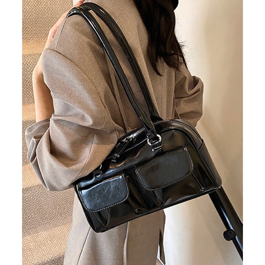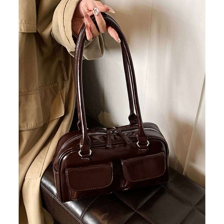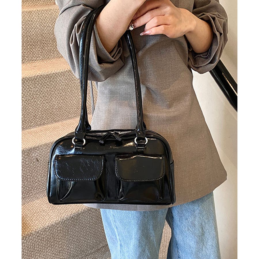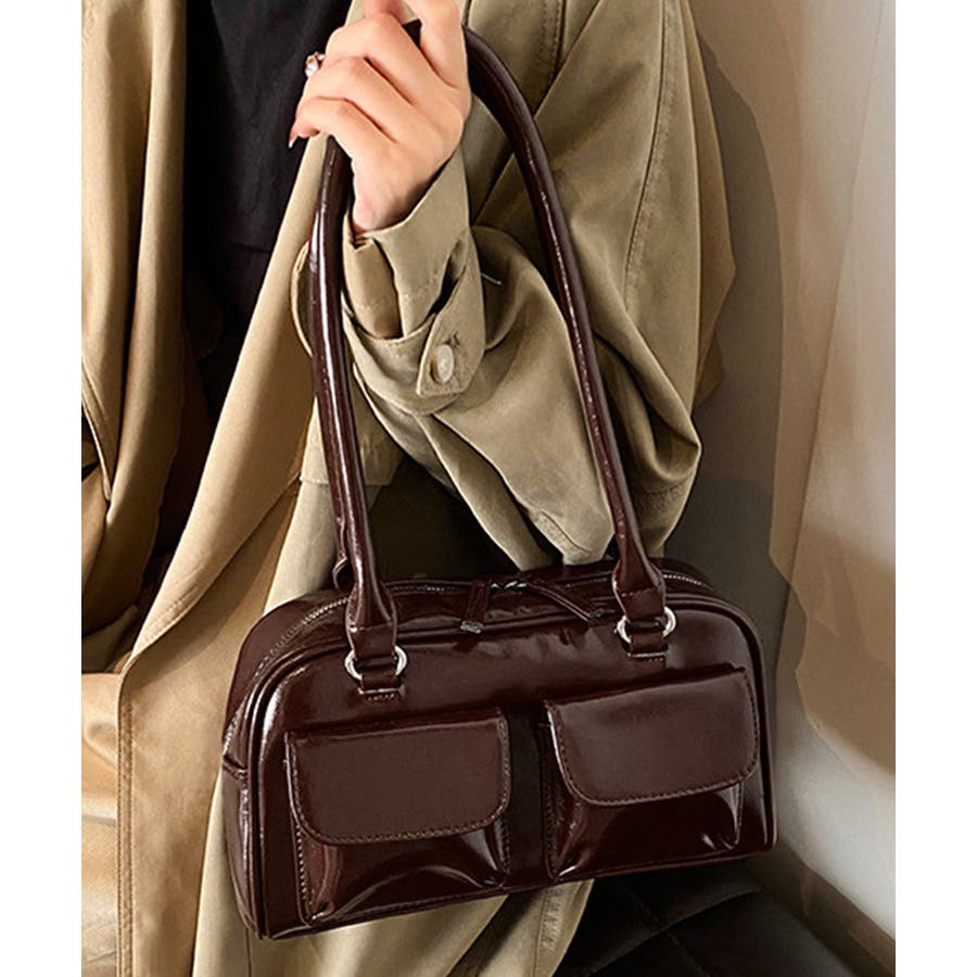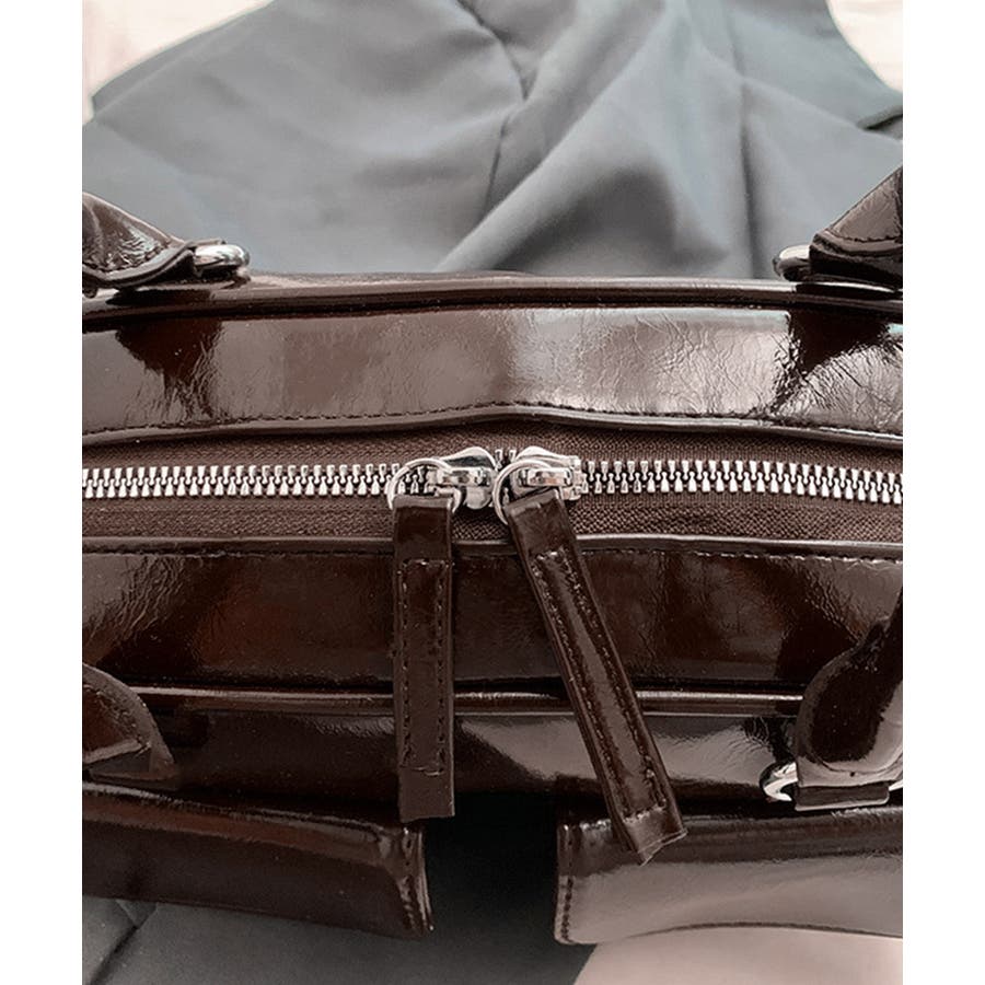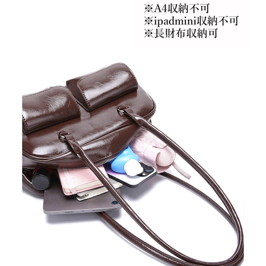 ツヤ感トートバッグ マチ広めハンドバッグ おしゃれ マルチポケット 学生カバン 韓国風通勤通学 PUレザーバッグ 高級感
