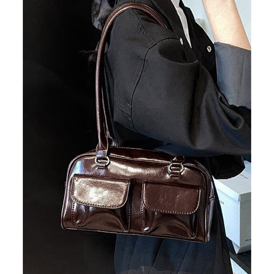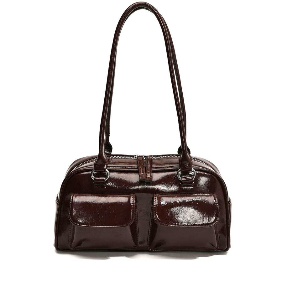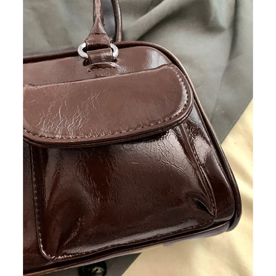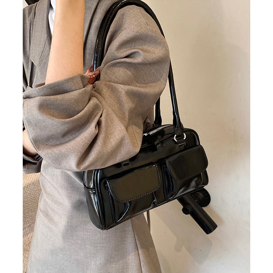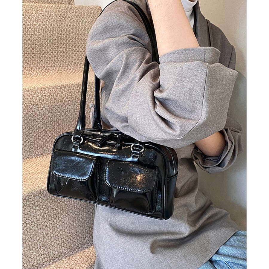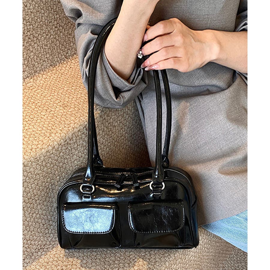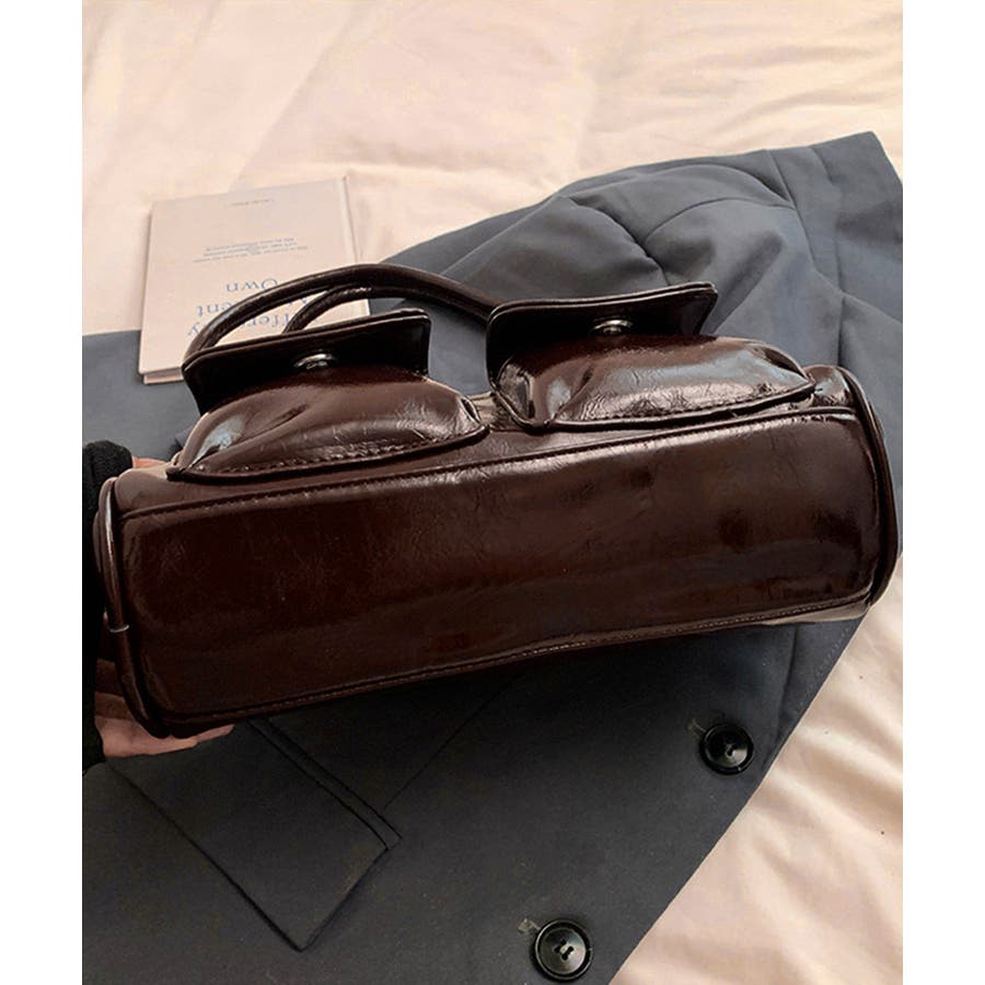 ツヤ感トートバッグ マチ広めハンドバッグ おしゃれ マルチポケット 学生カバン 韓国風通勤通学 PUレザーバッグ 高級感