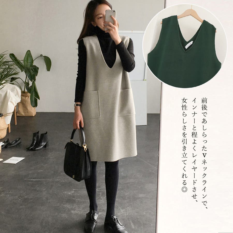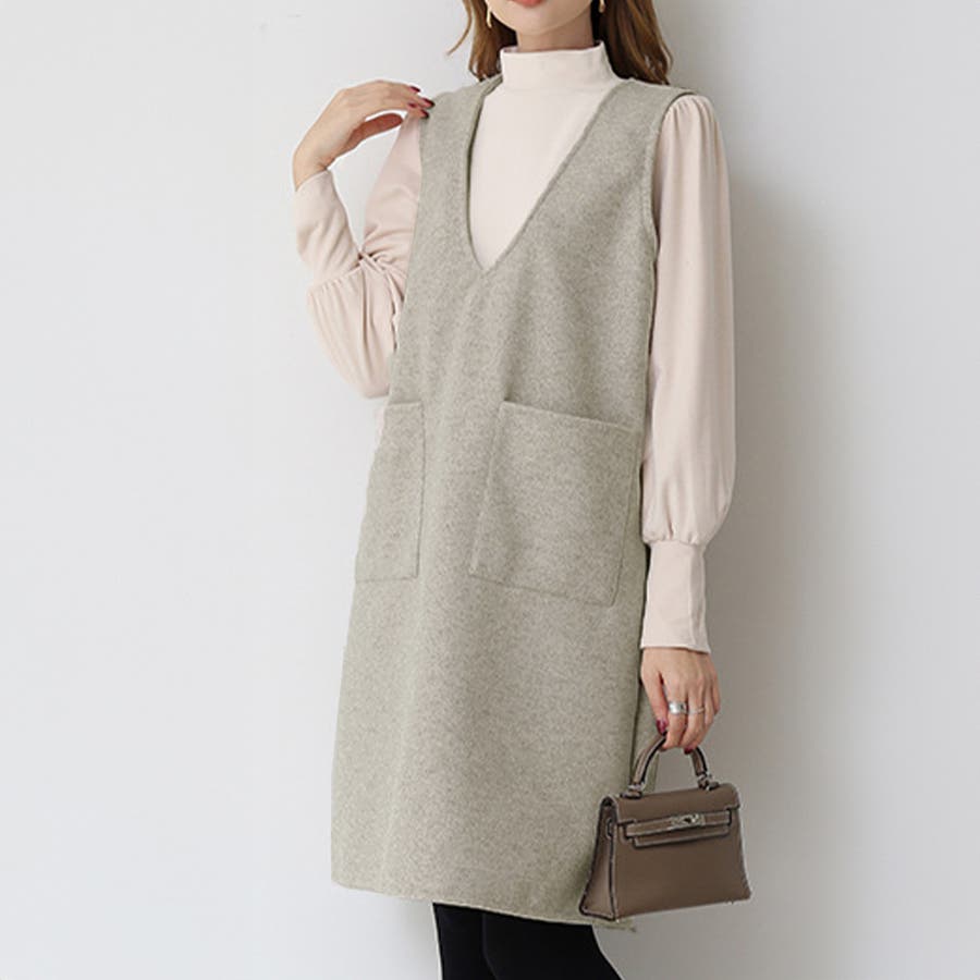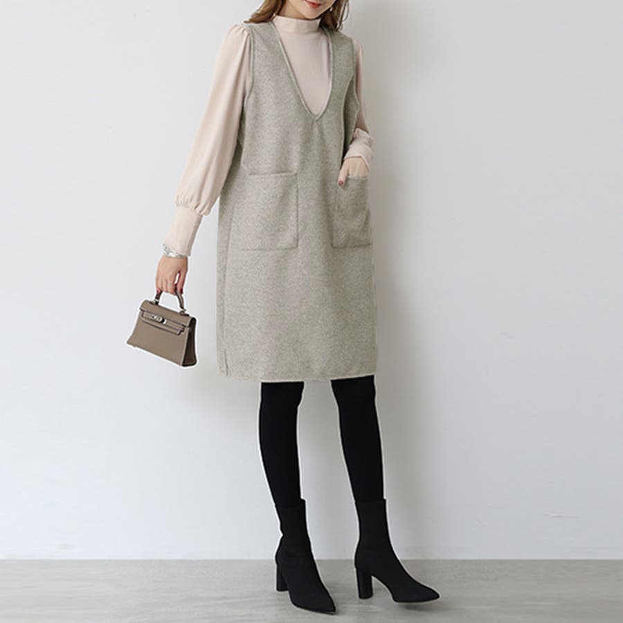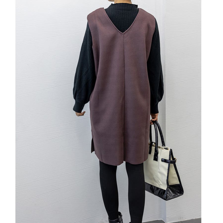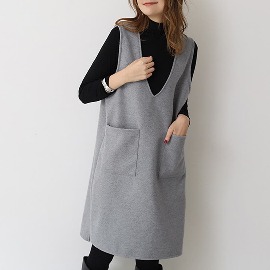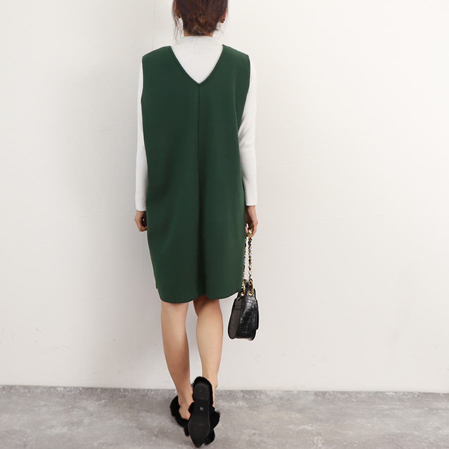 深めのVネックでデコルテラインを綺麗に演出するベストワンピース