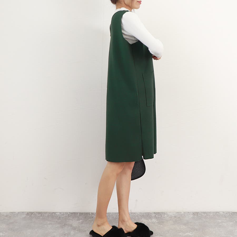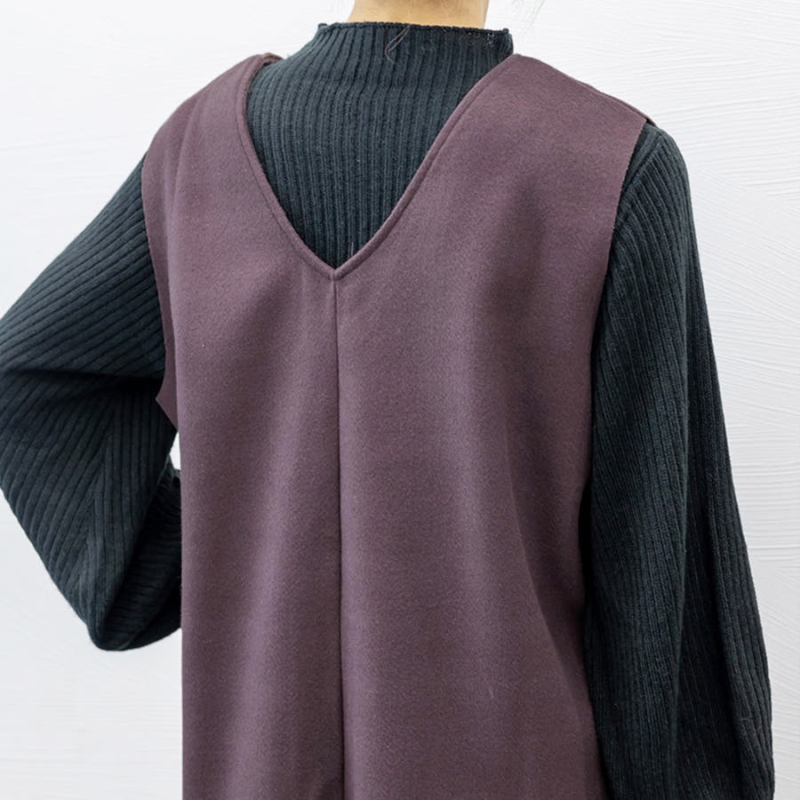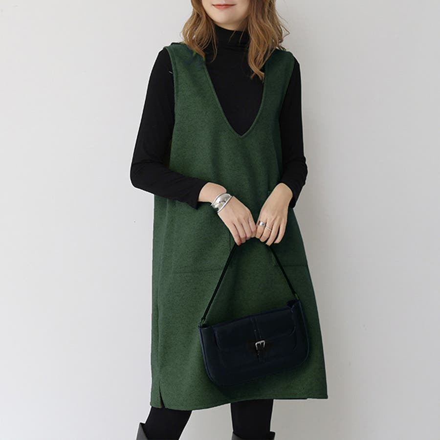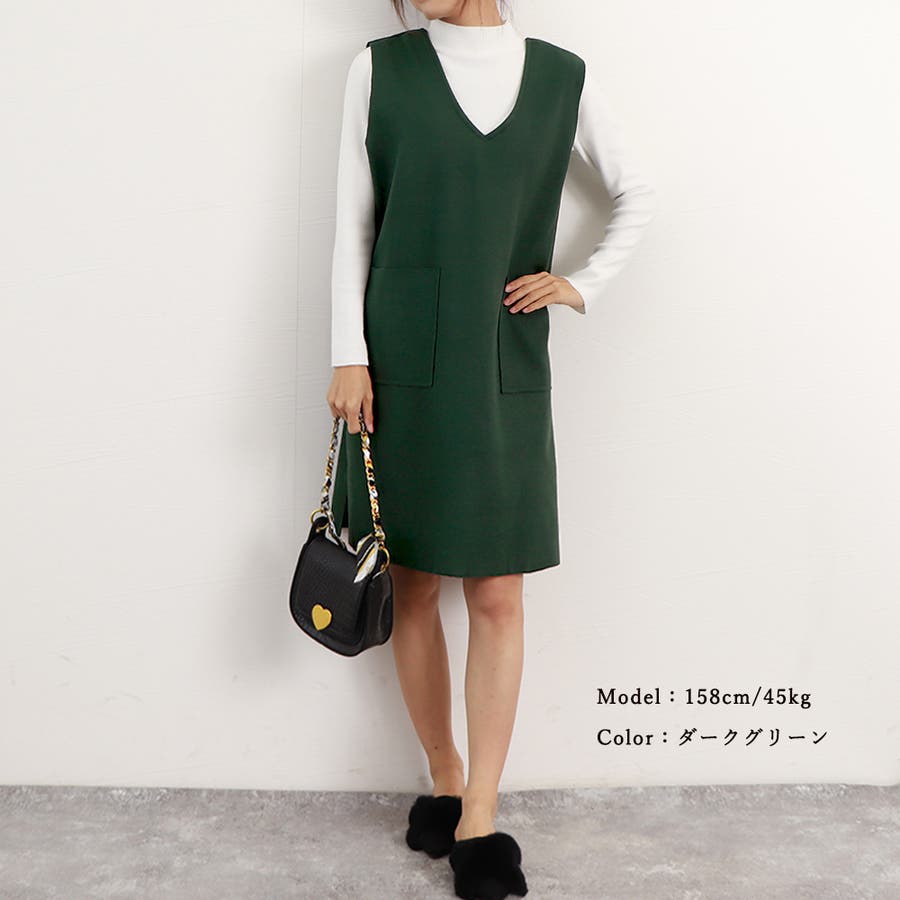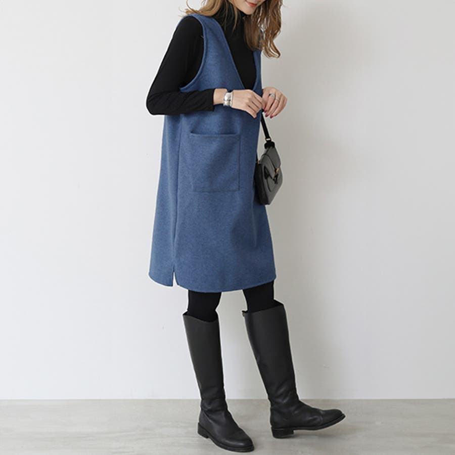 深めのVネックでデコルテラインを綺麗に演出するベストワンピース