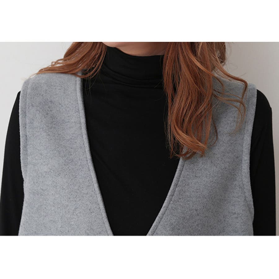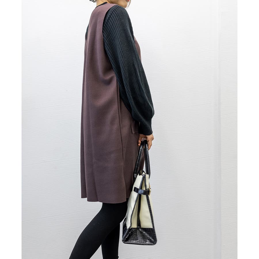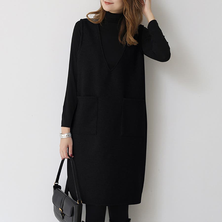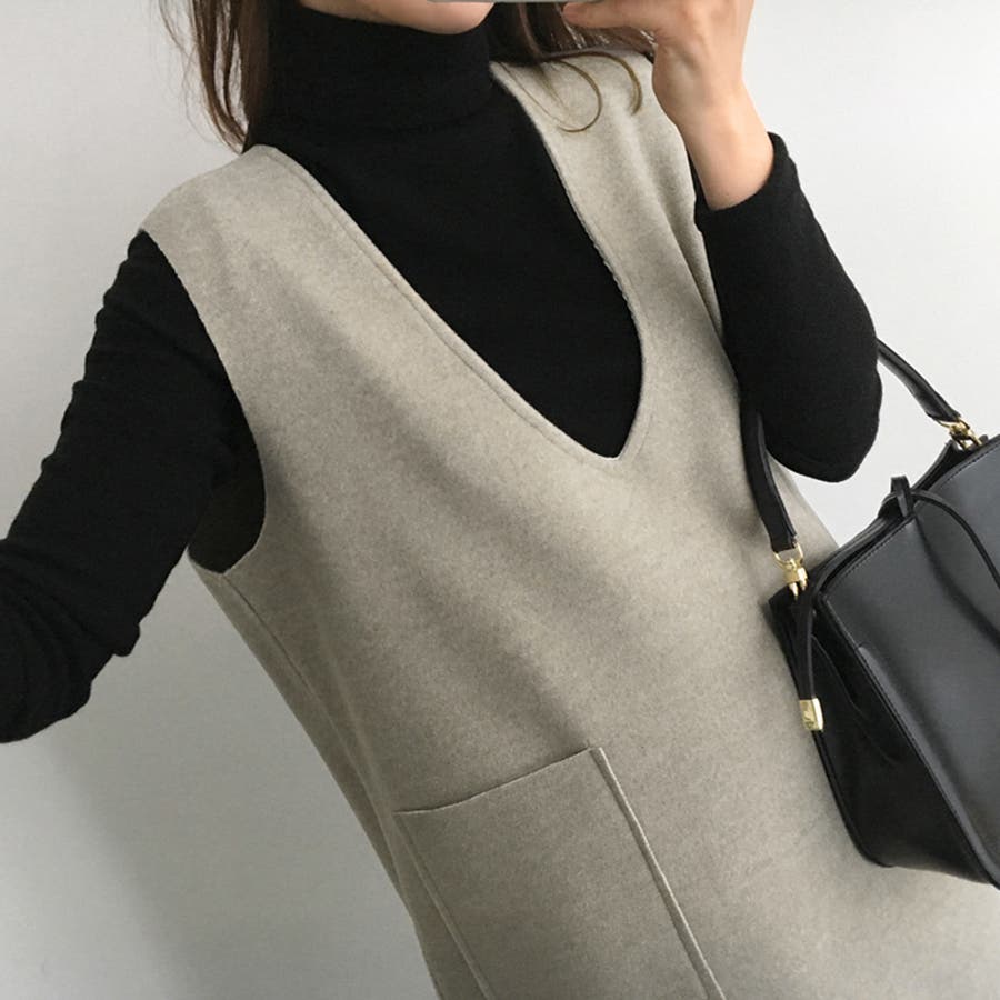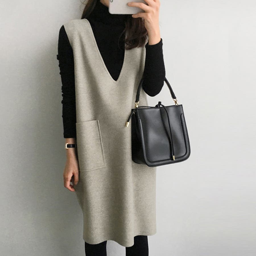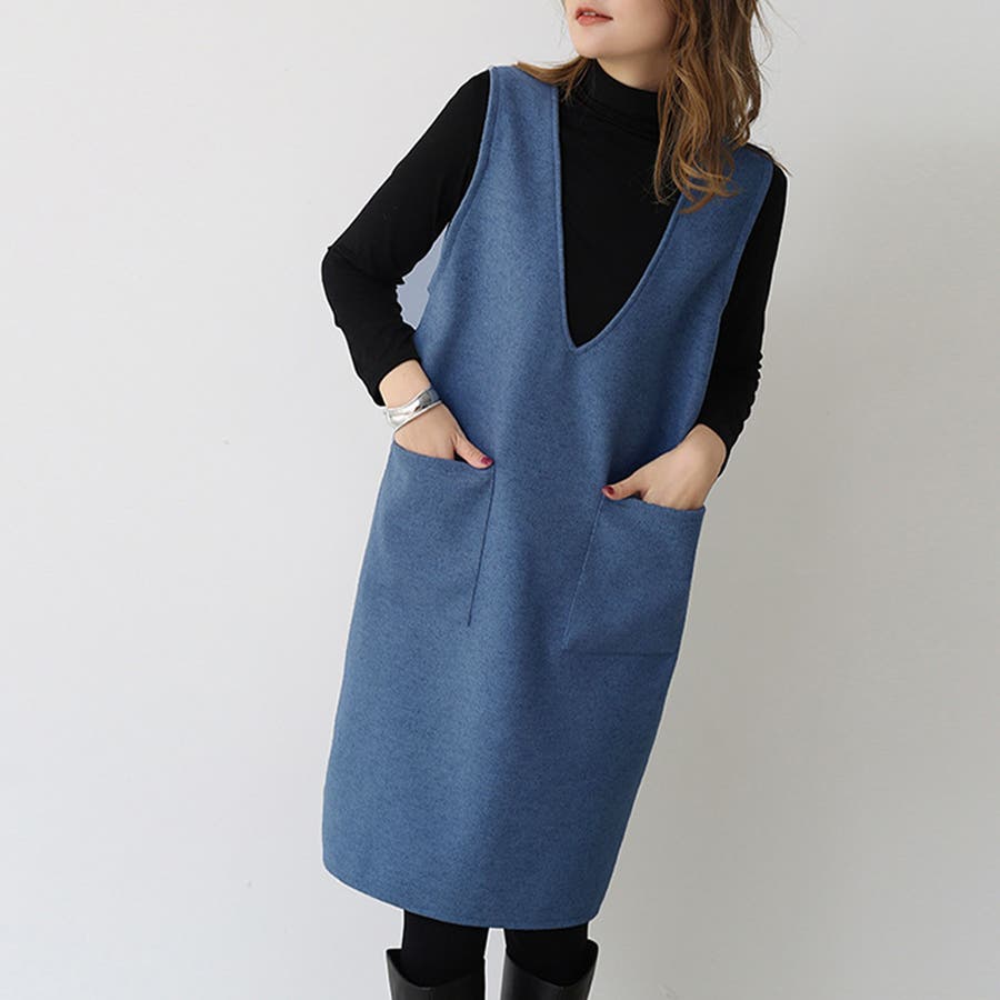 深めのVネックでデコルテラインを綺麗に演出するベストワンピース