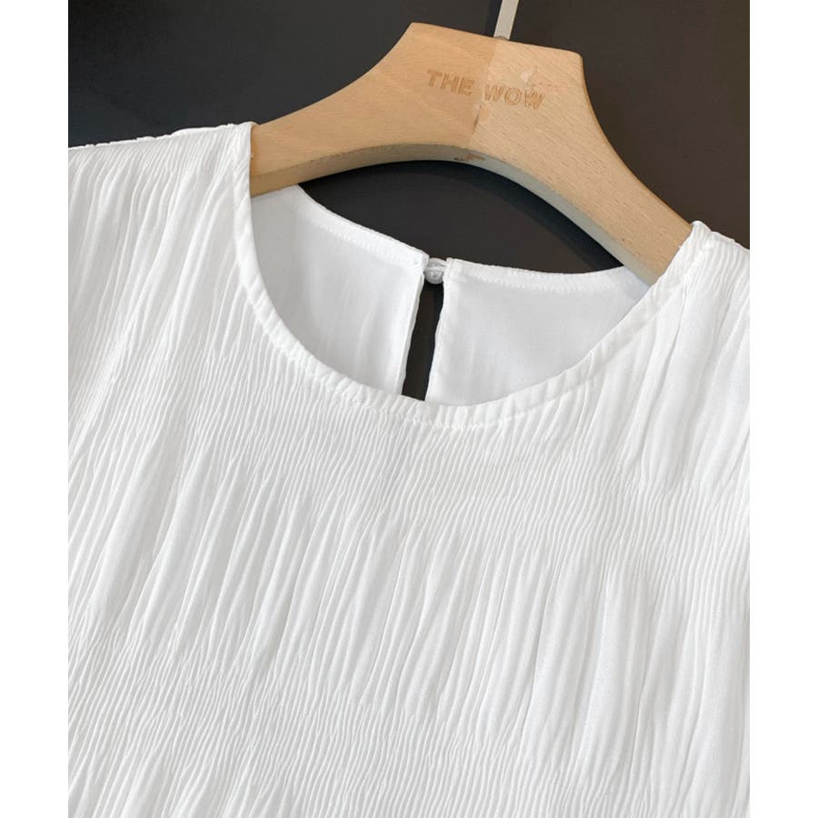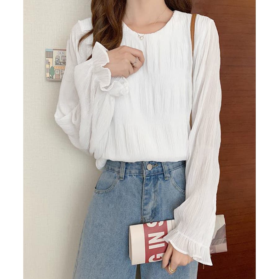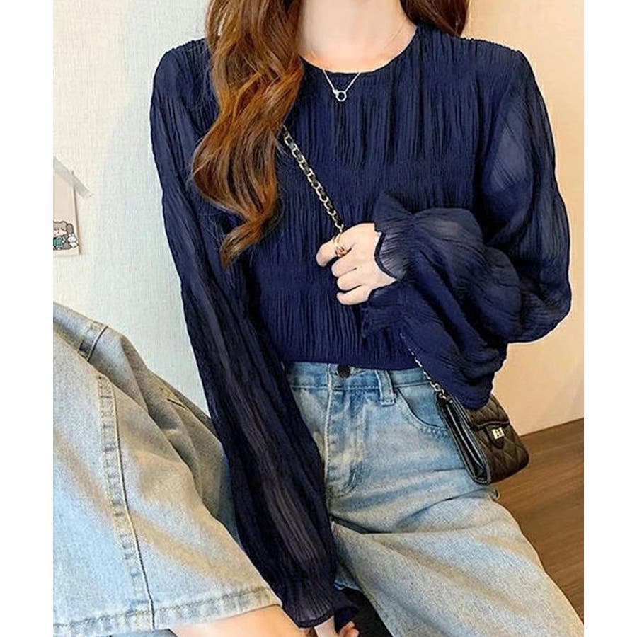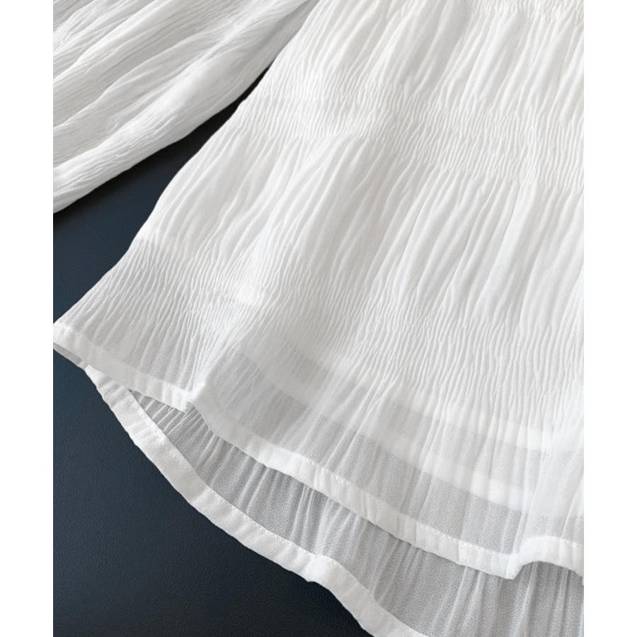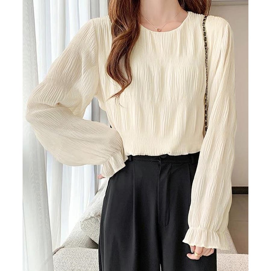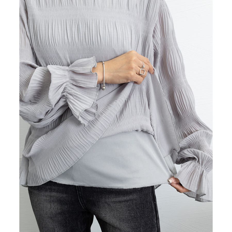 繊細なシャーリング加工を施したシアー素材が、スタイリングに抜け感を演出するシフォンブラウスです。
