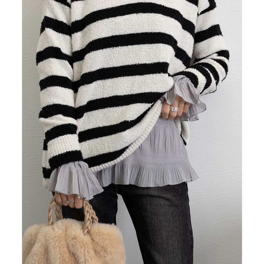 袖口にはギャザーで絞りを入れ、メリハリをプラス。花びらのようなフリルが手元を華やかに彩ります。