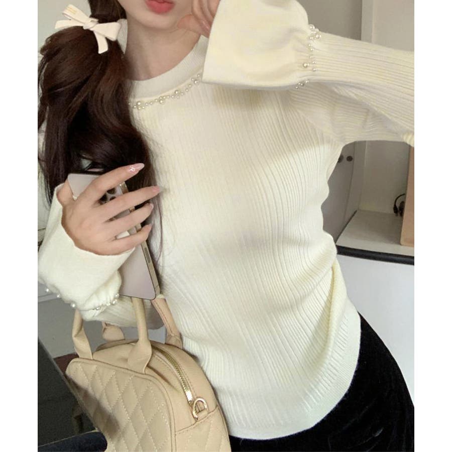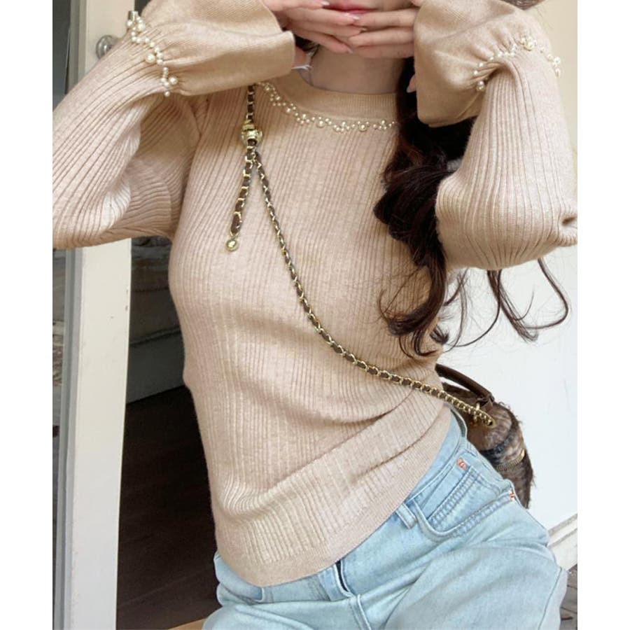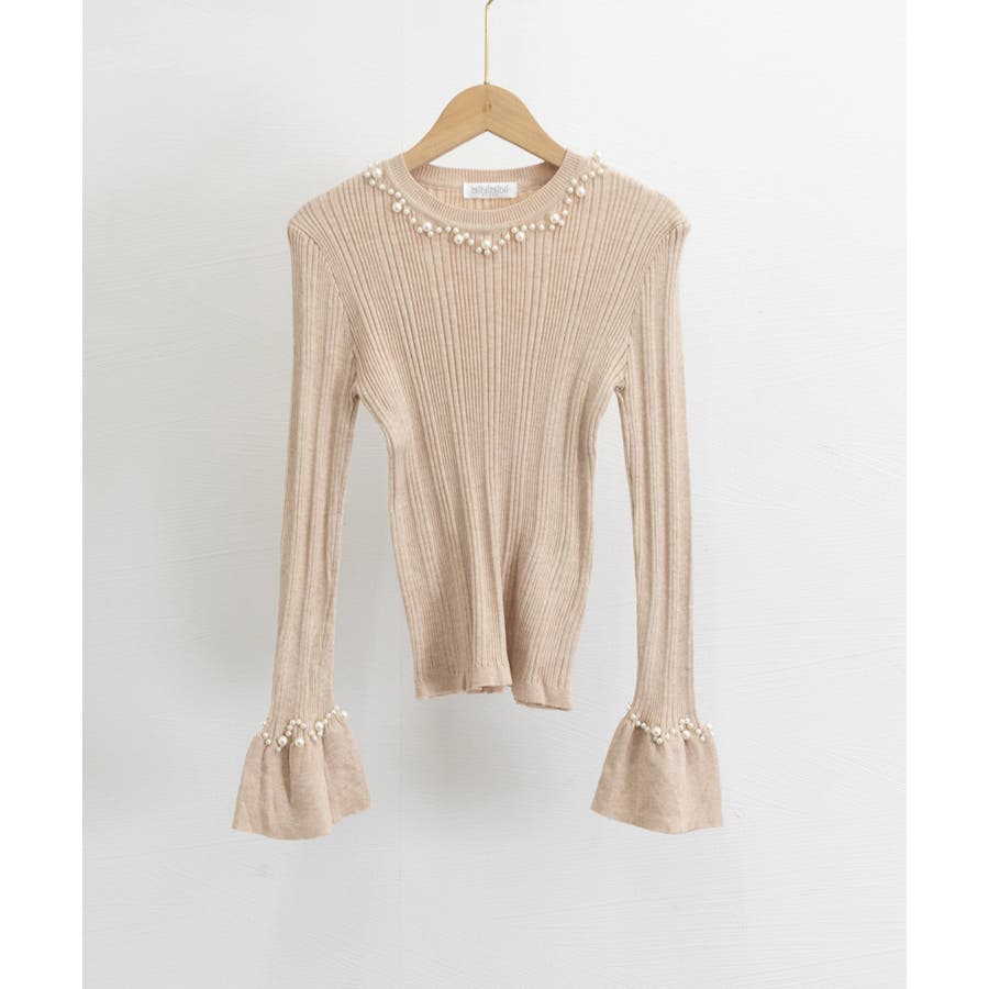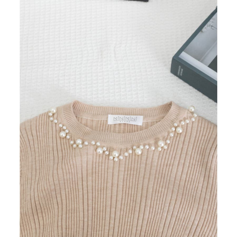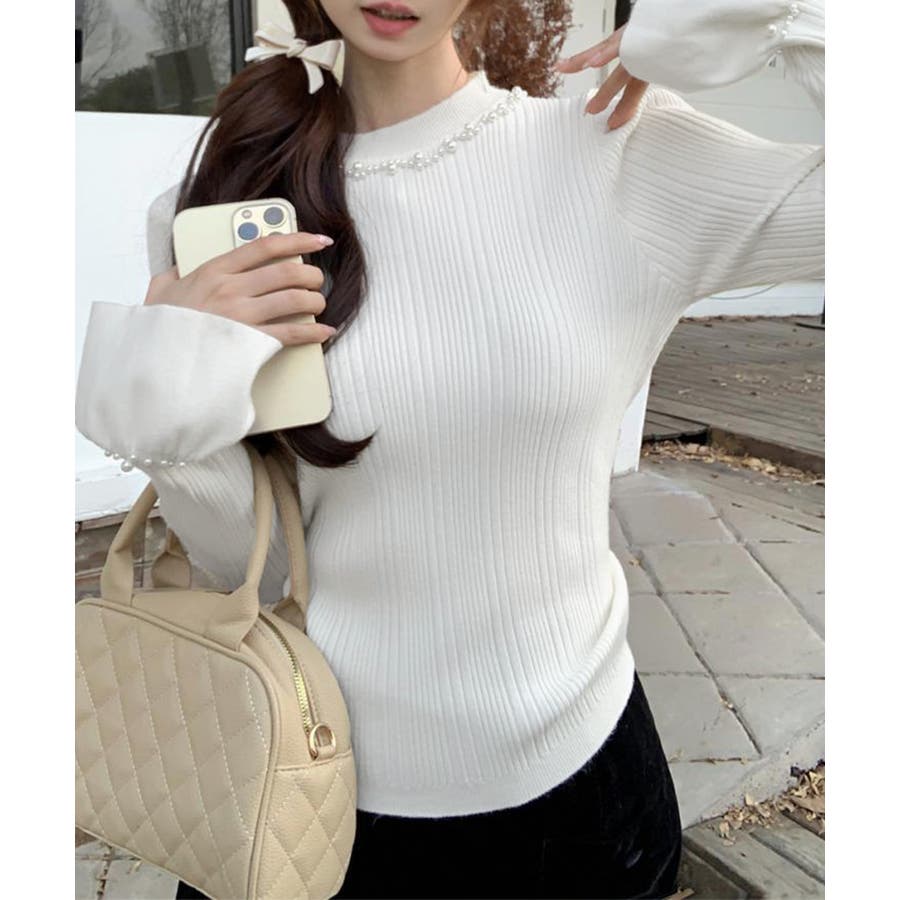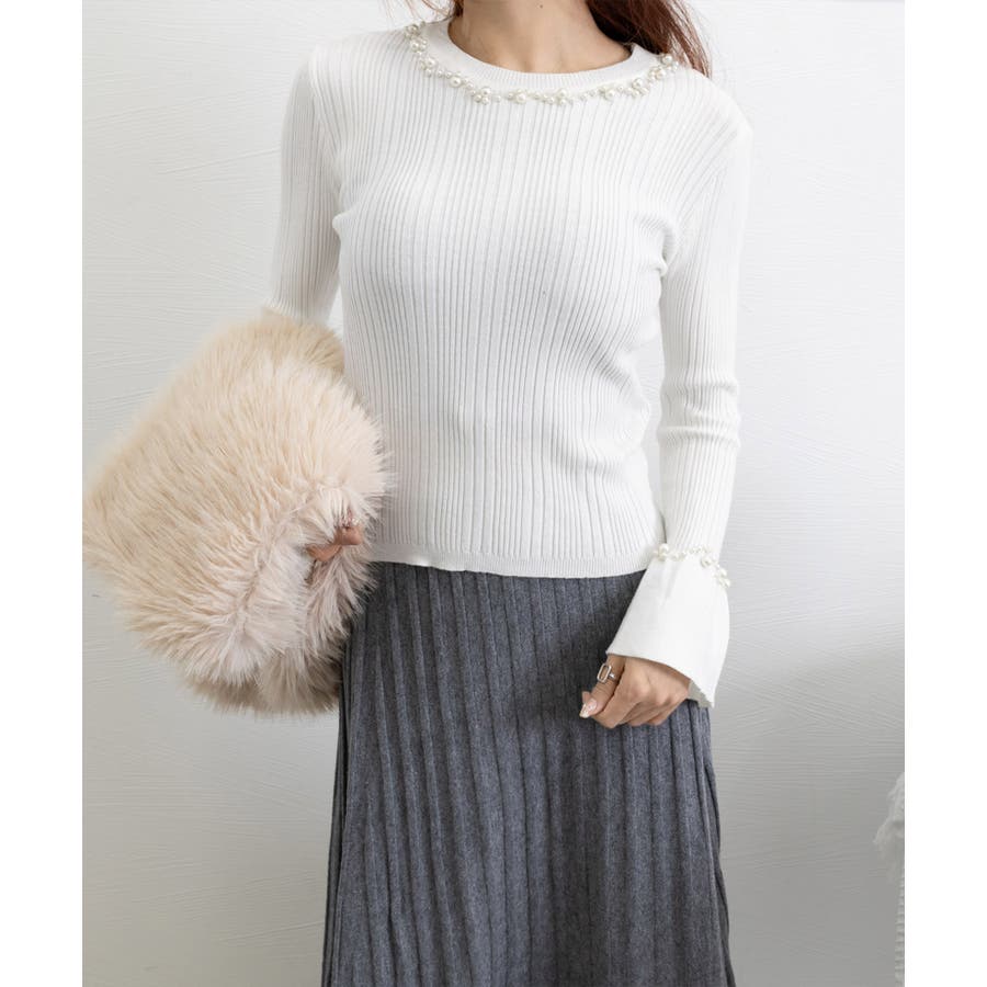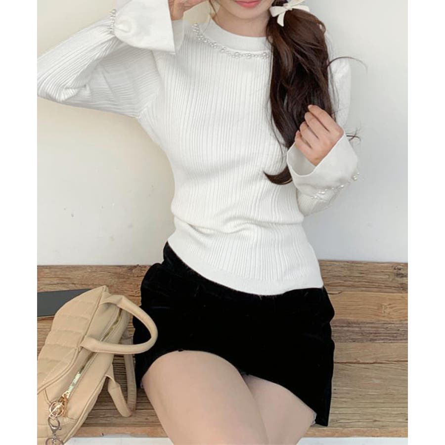 ネックラインと腕周りのパールデザインが上品で目を惹き、トレンド感満載のリブニットトップス。