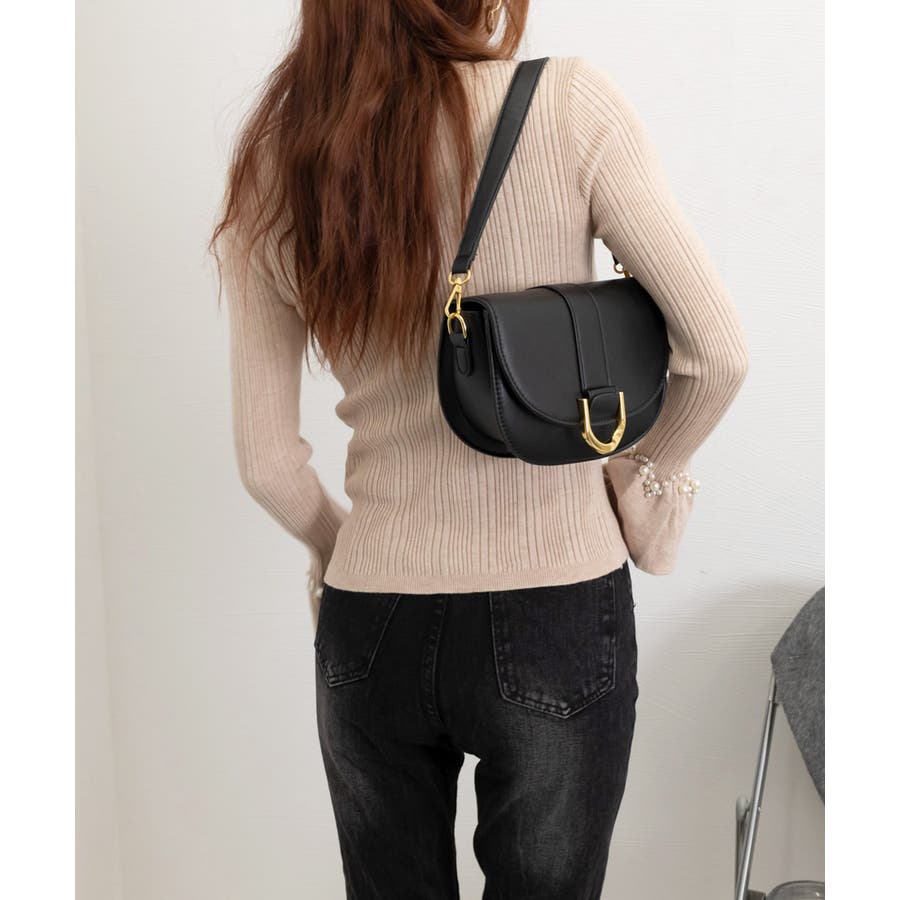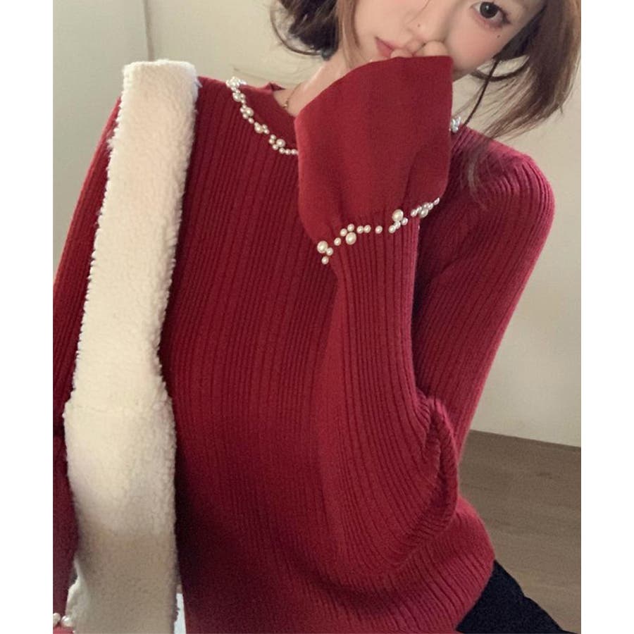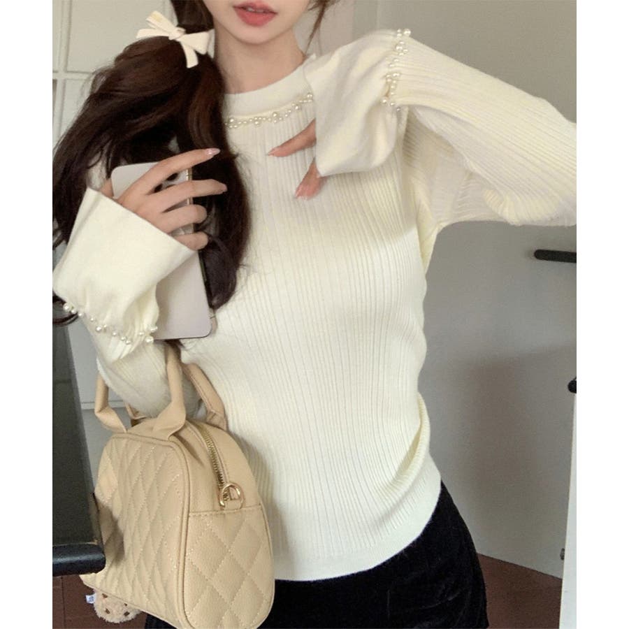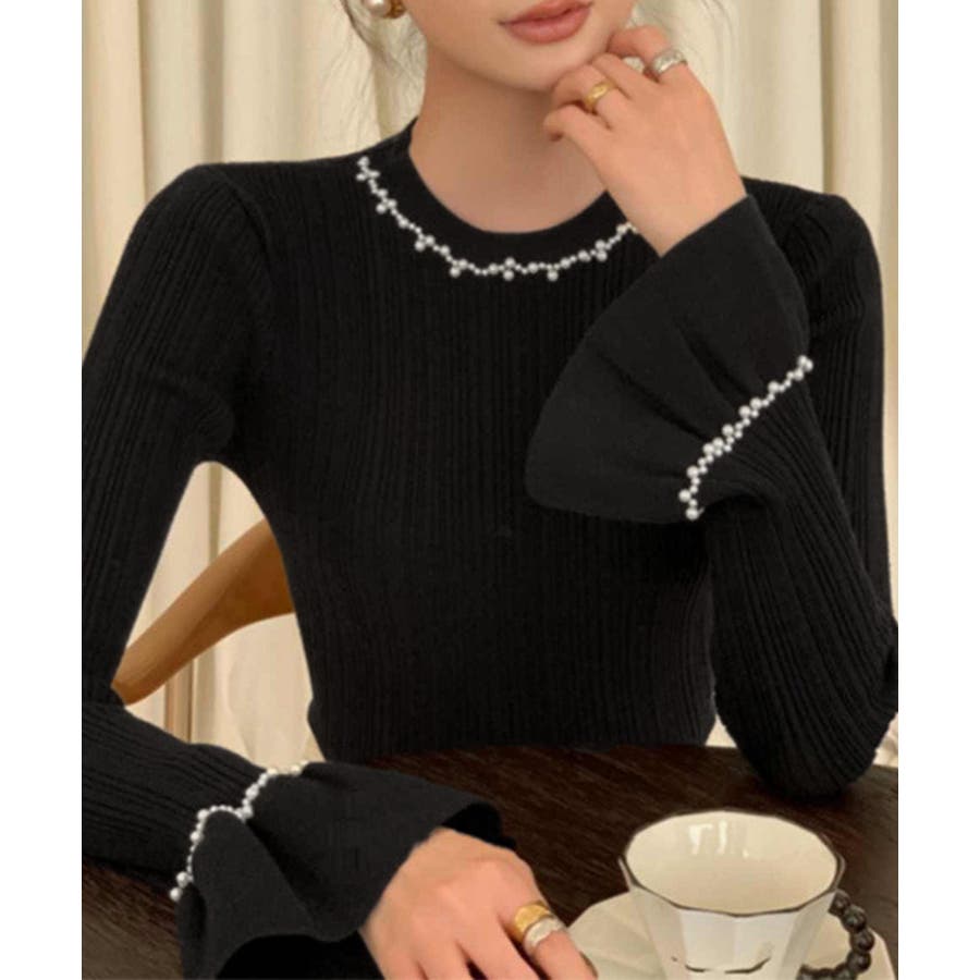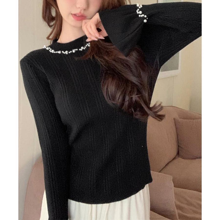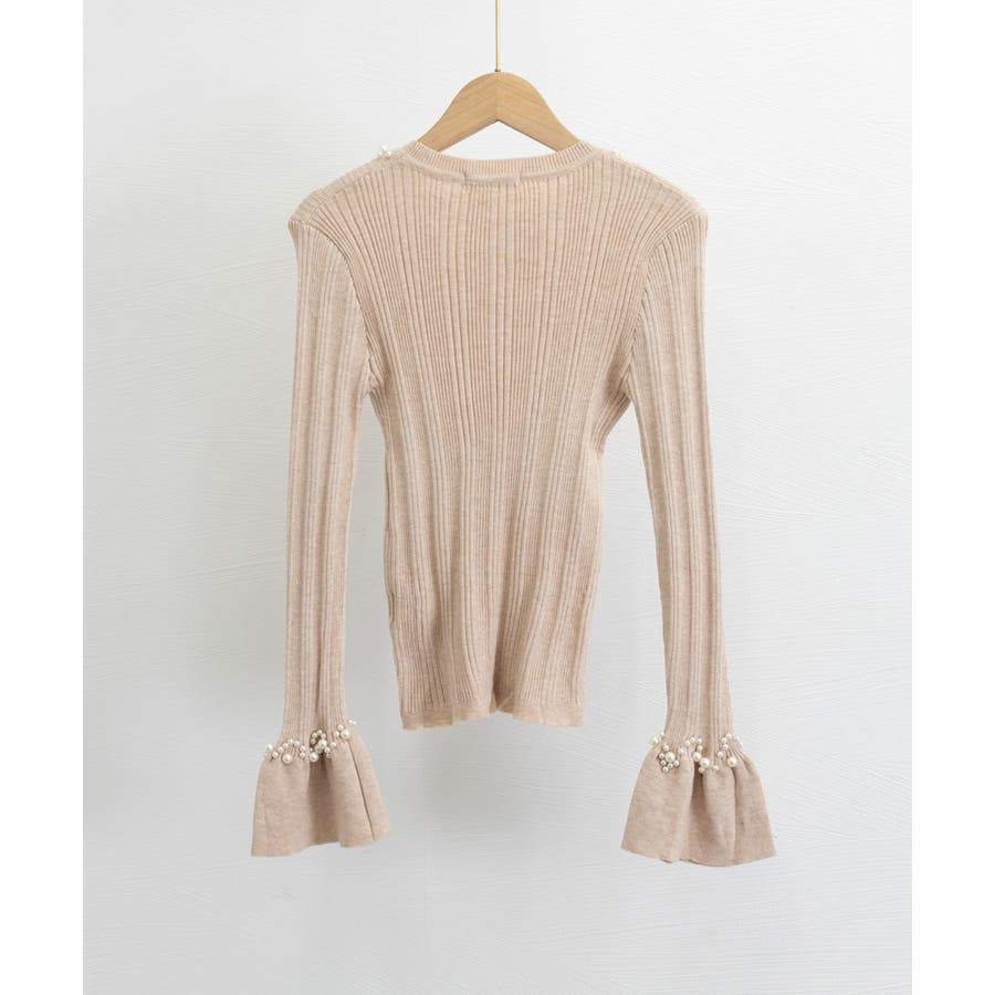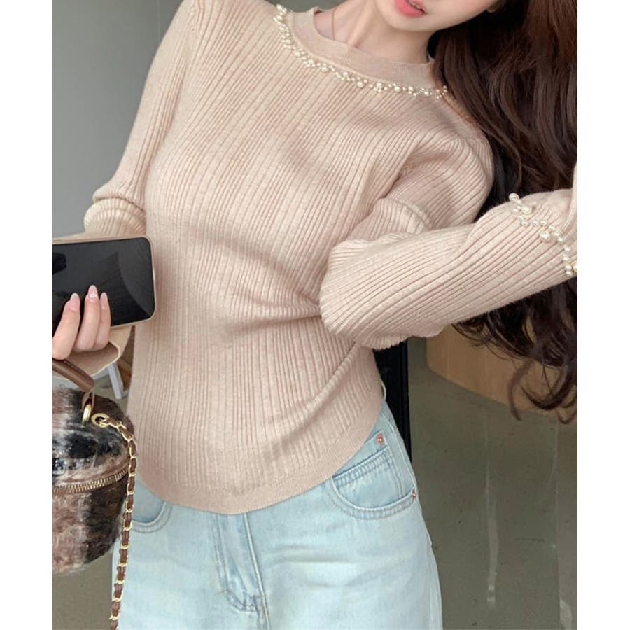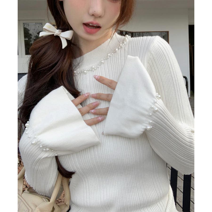 ネックラインと腕周りのパールデザインが上品で目を惹き、トレンド感満載のリブニットトップス。