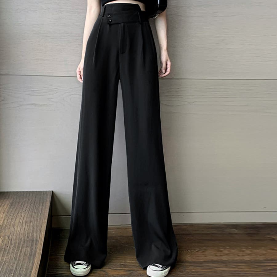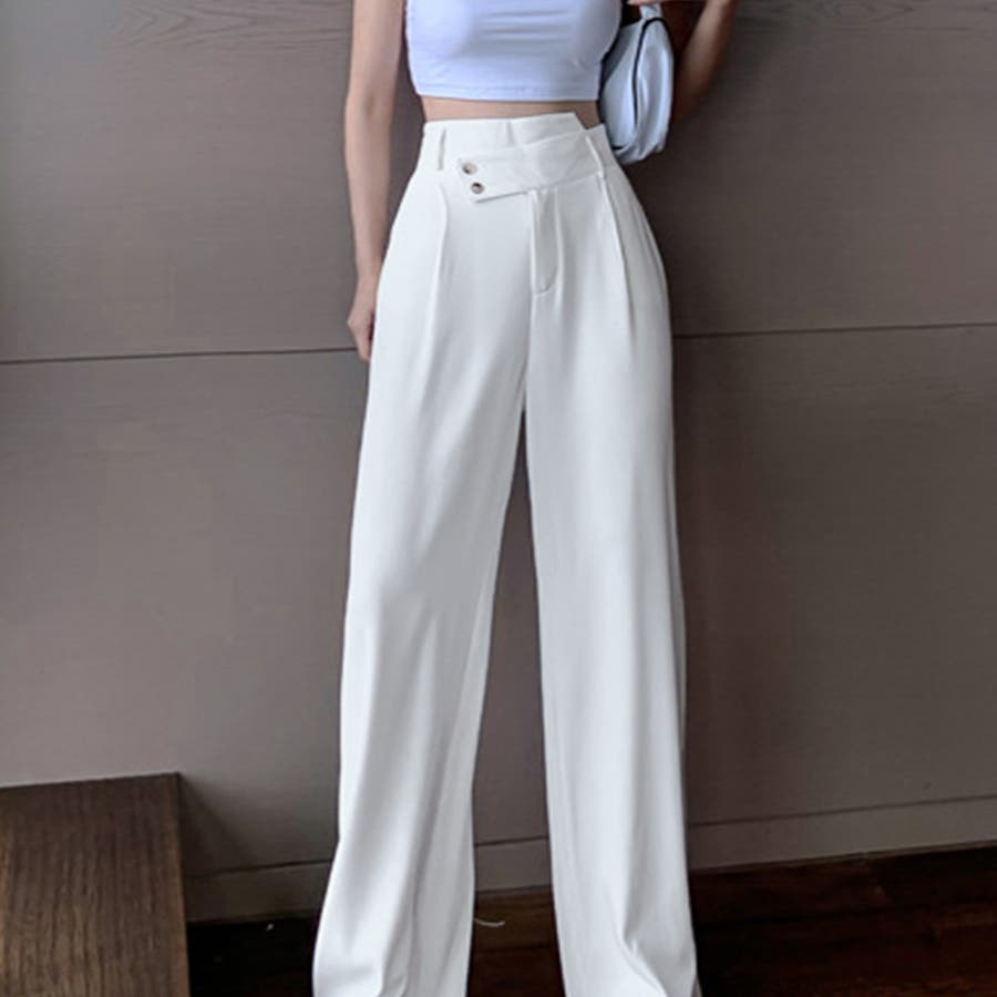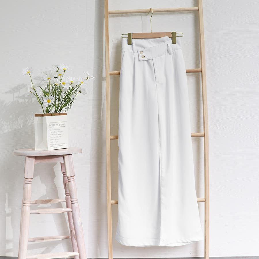 ウエストのアシンメトリーDesignが特徴的、シンプルながらもトレンド感抜群のハイウエストセミワイドパンツ