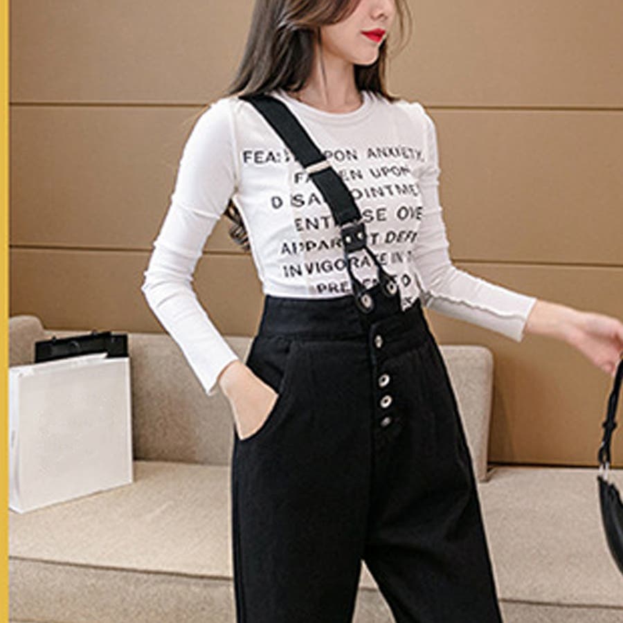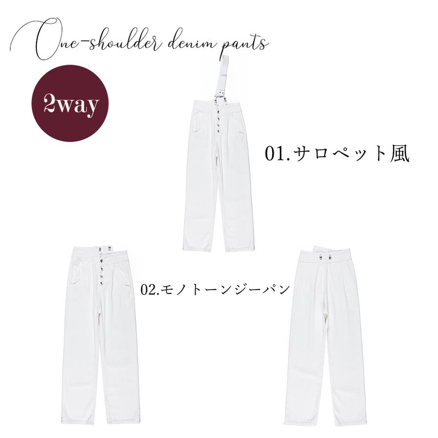 ワンショルダーのストラップデザインが目を惹くほかと被らないロング丈のデニムパンツ