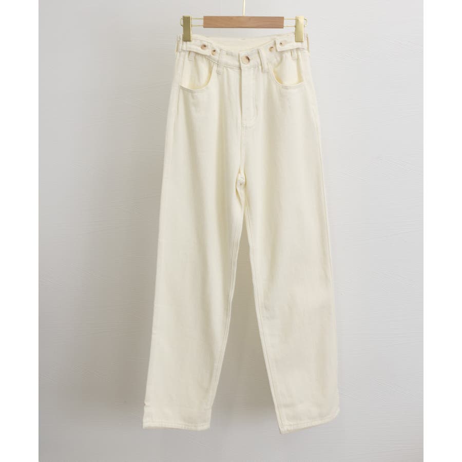 ウエストに調整ボタン付きで腰周りの穿き心地の微調整が可能、裾ロールアップのアンクルパンツ風で爽やかで軽やかに穿くのが旬顔コーデポイント