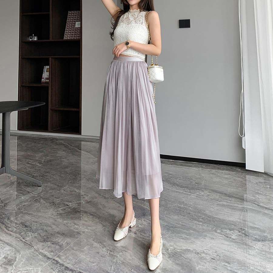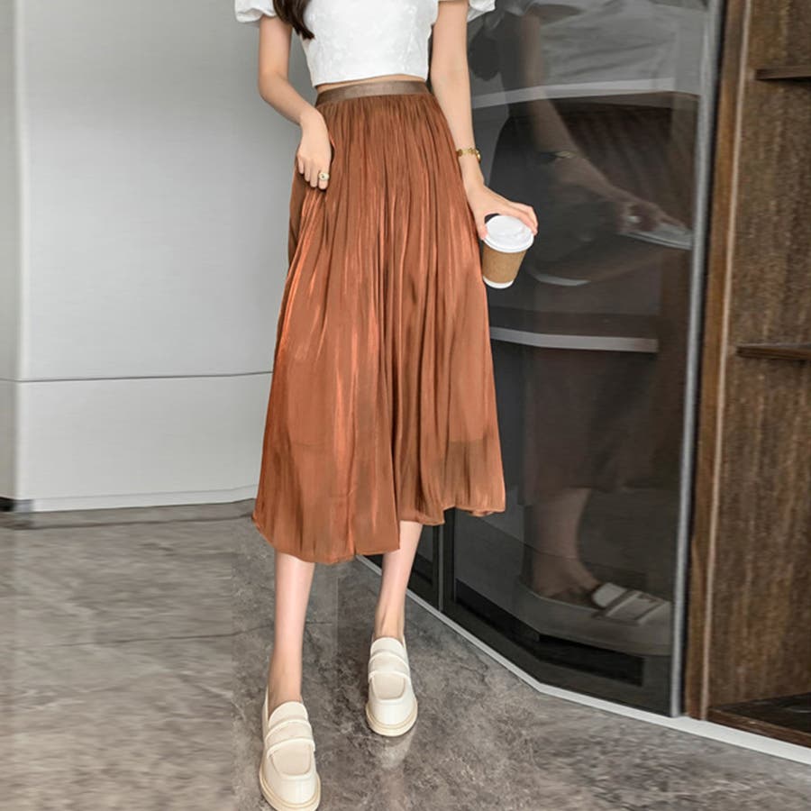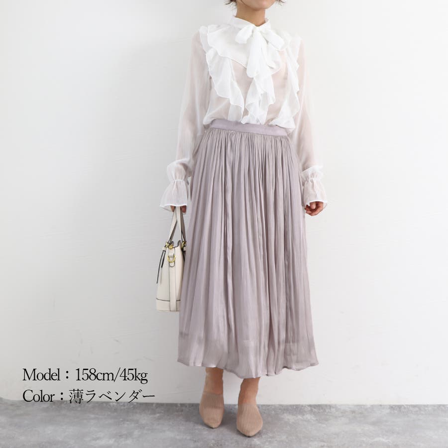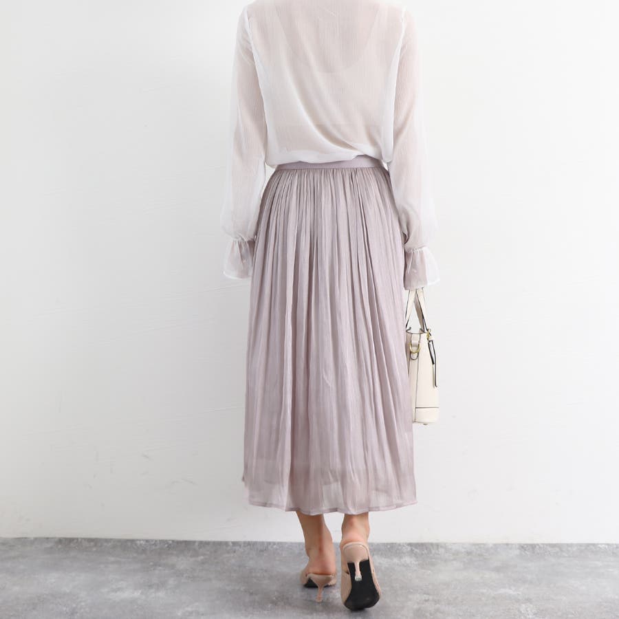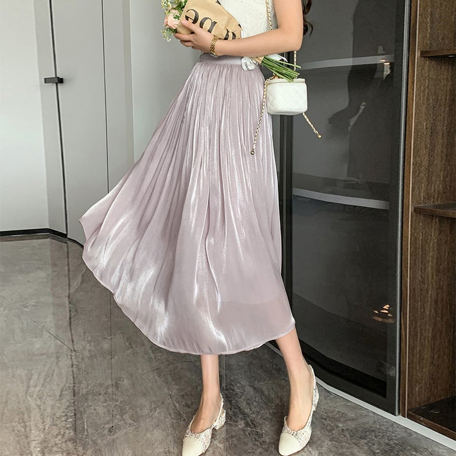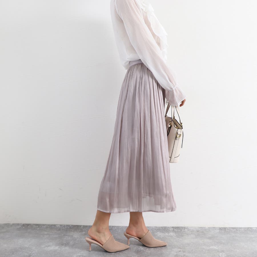 光沢感があり、なめらかな質感が特徴のフレアスカート