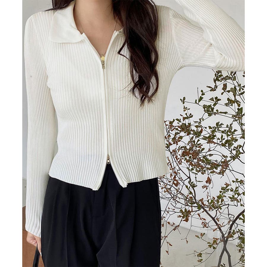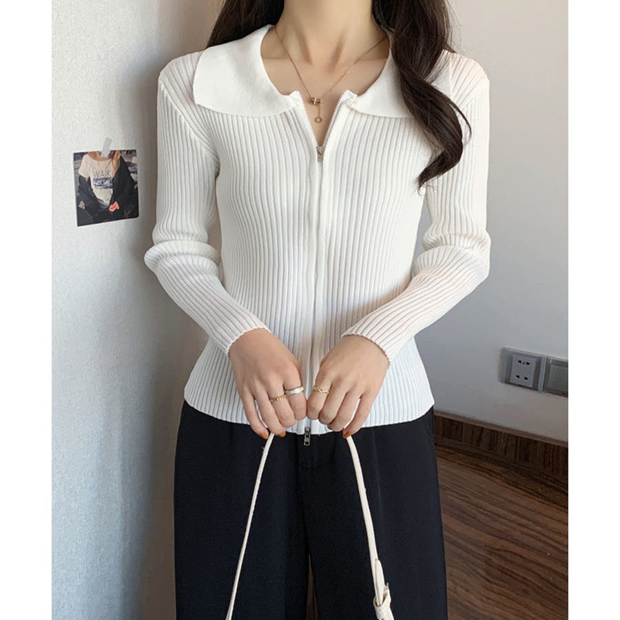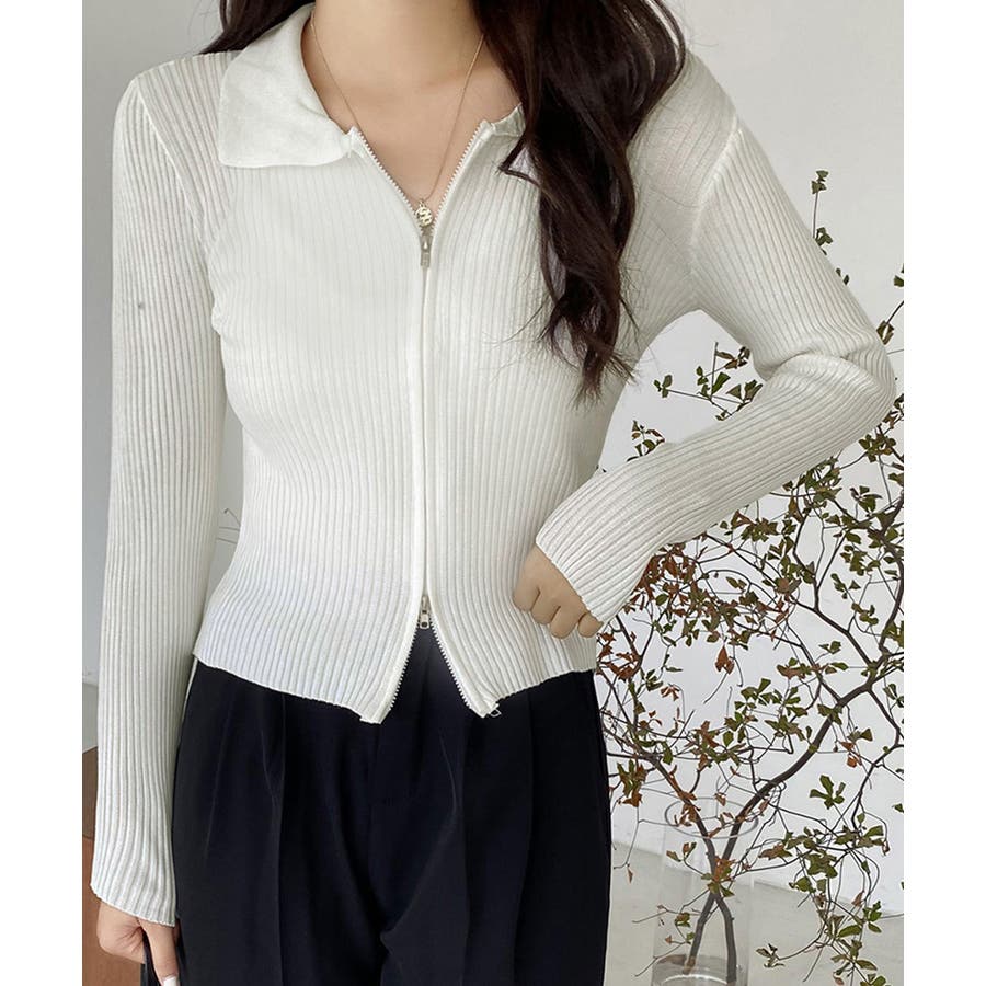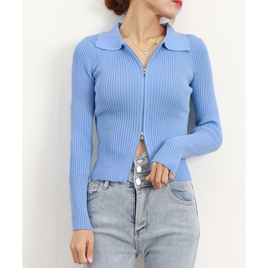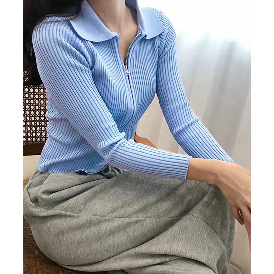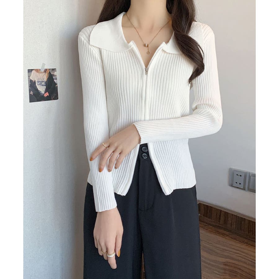 リブニットトップスレディースジップアップ