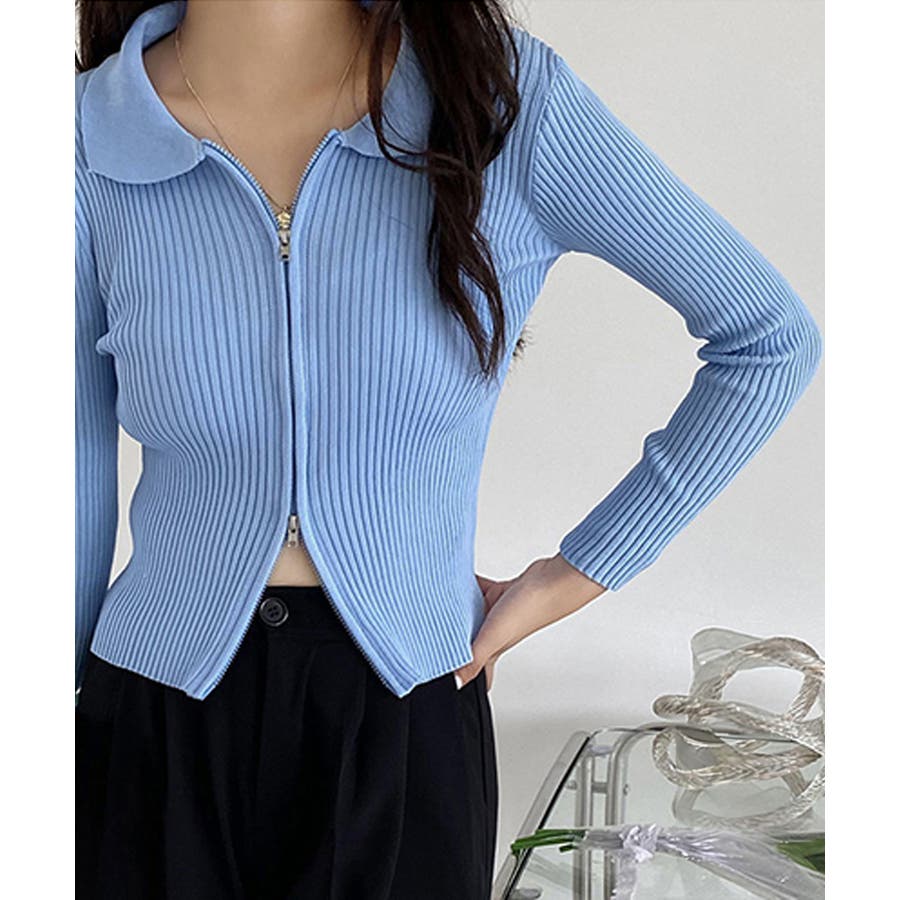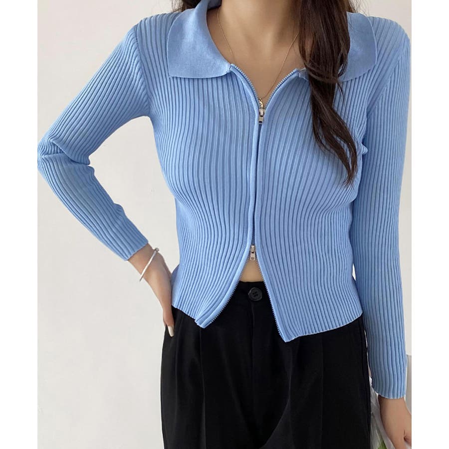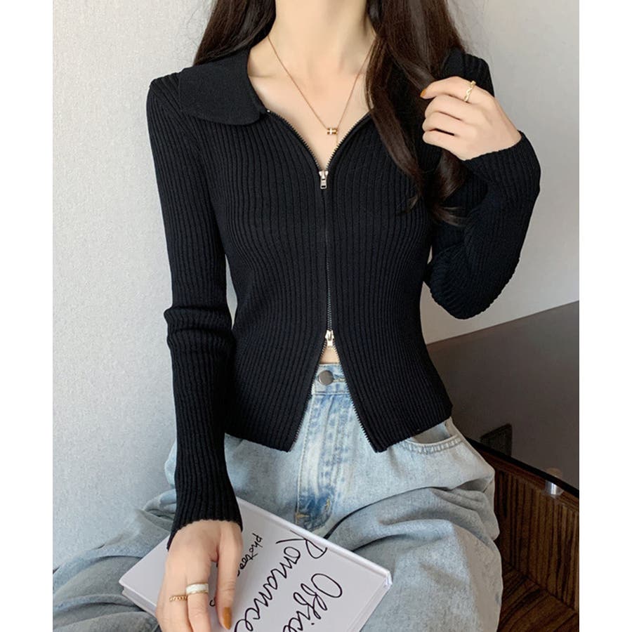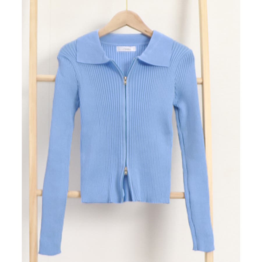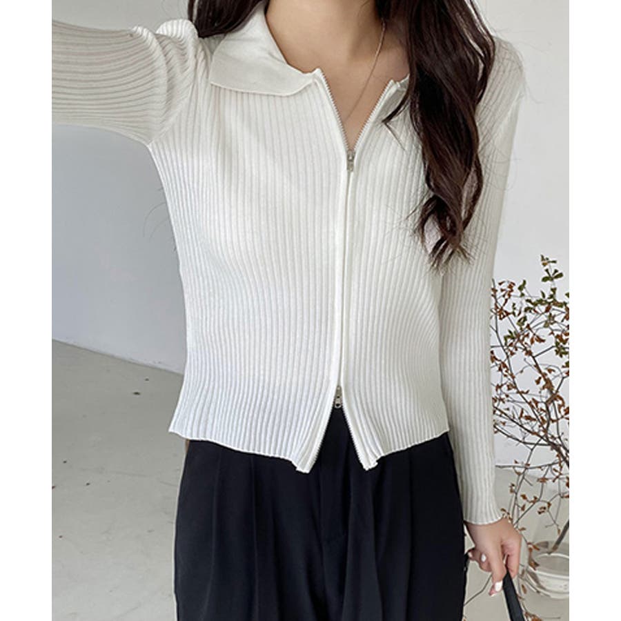 リブニットトップスレディースジップアップ