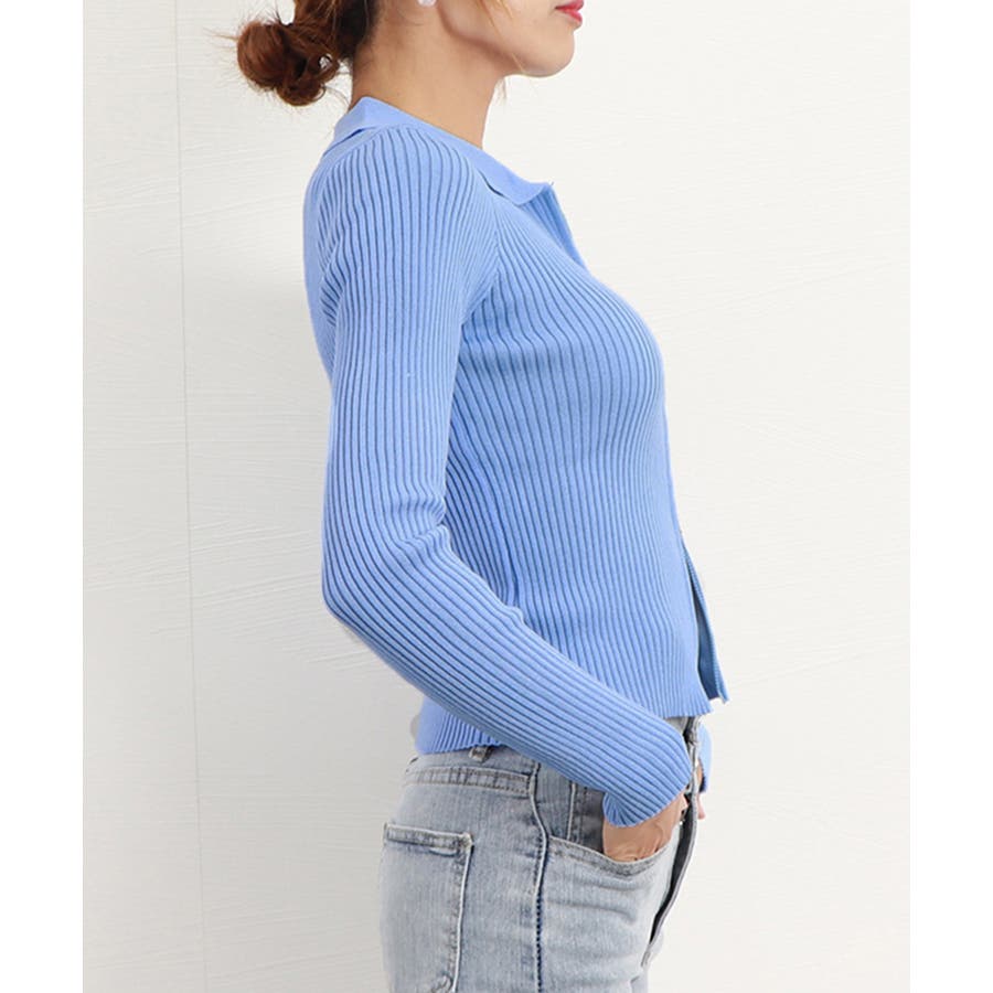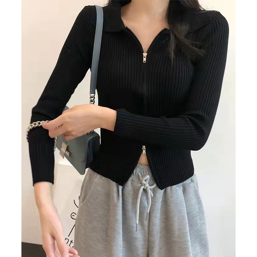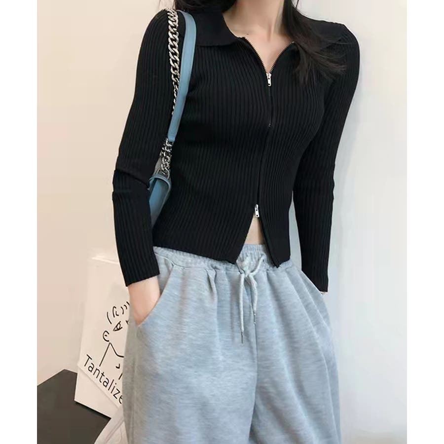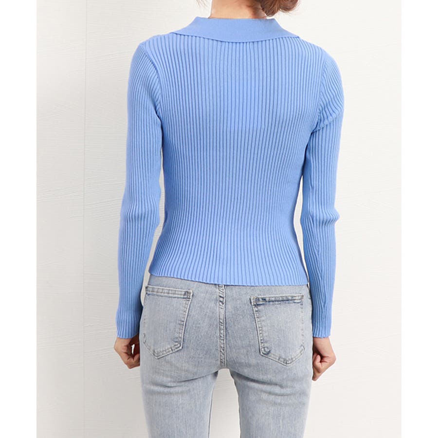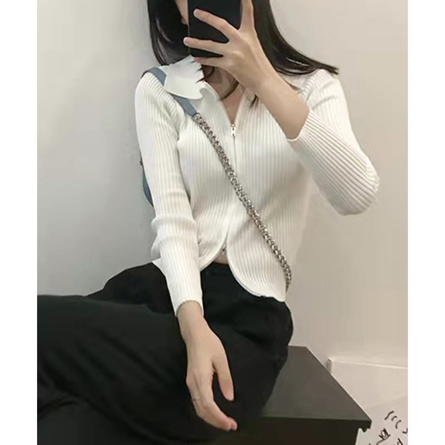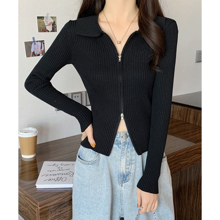 リブニットトップスレディースジップアップ