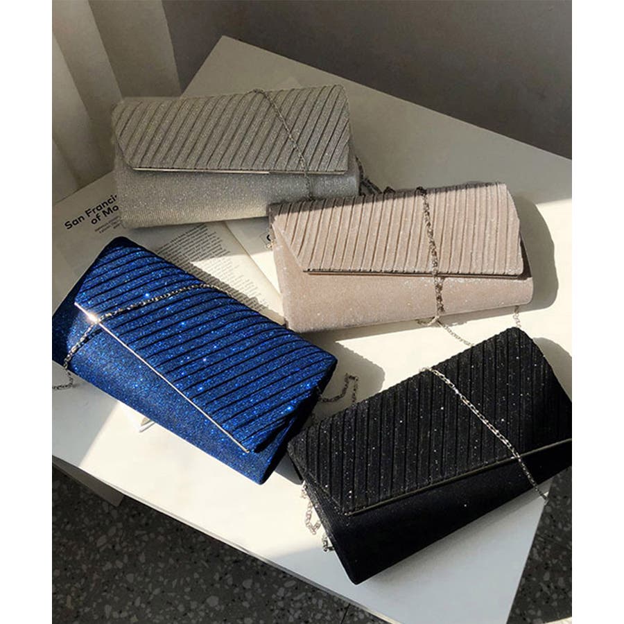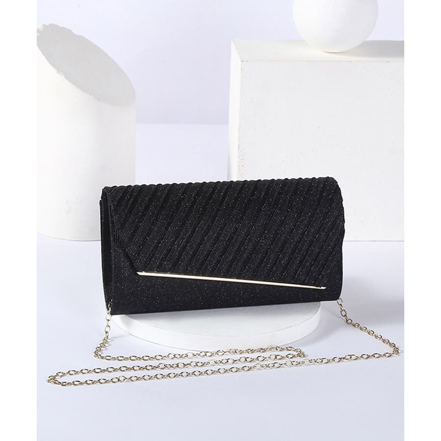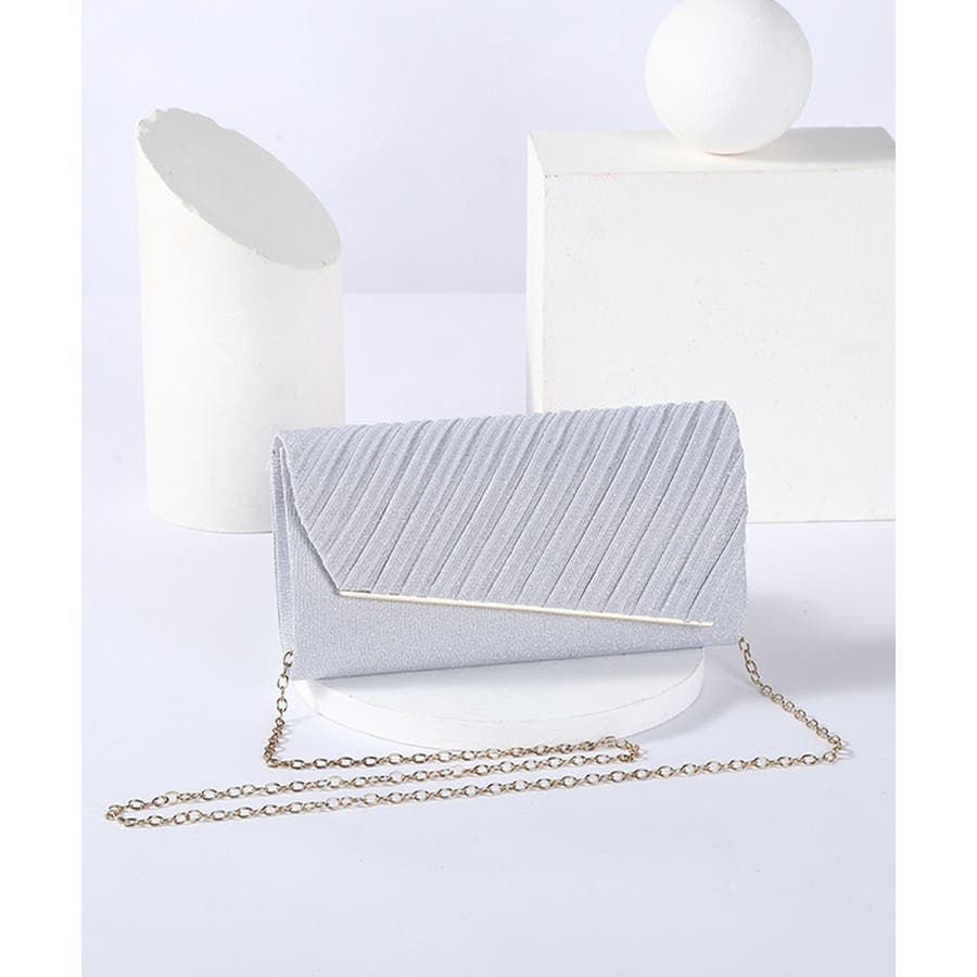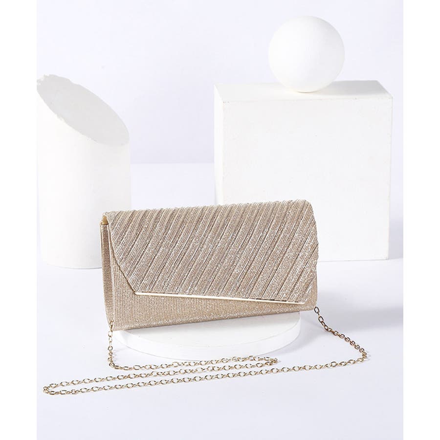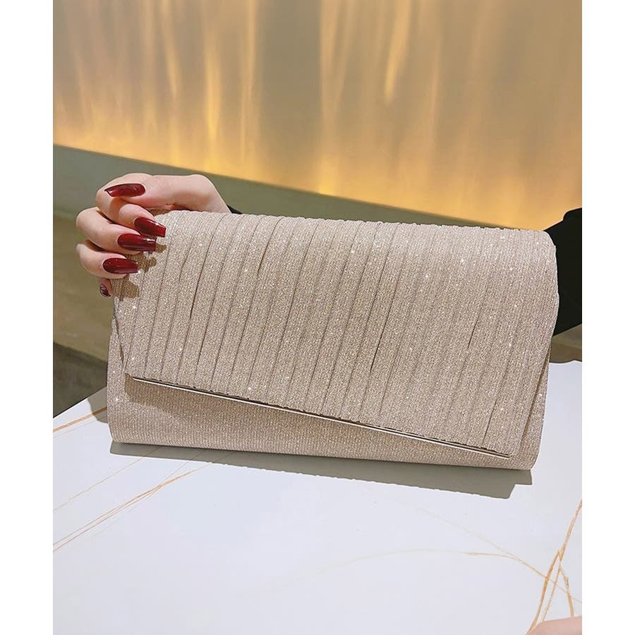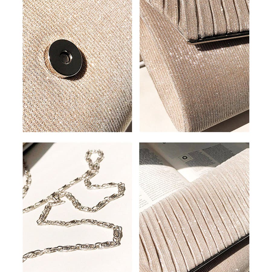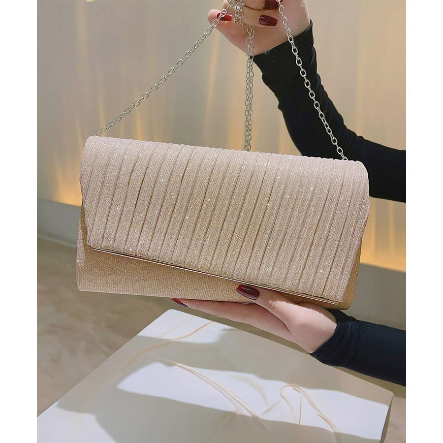 プリーツ加工をほどこしたサテン生地が上品なキラキラパーティーバッグ