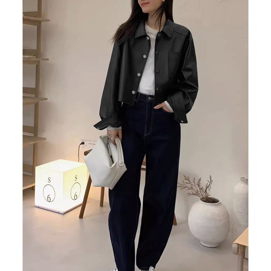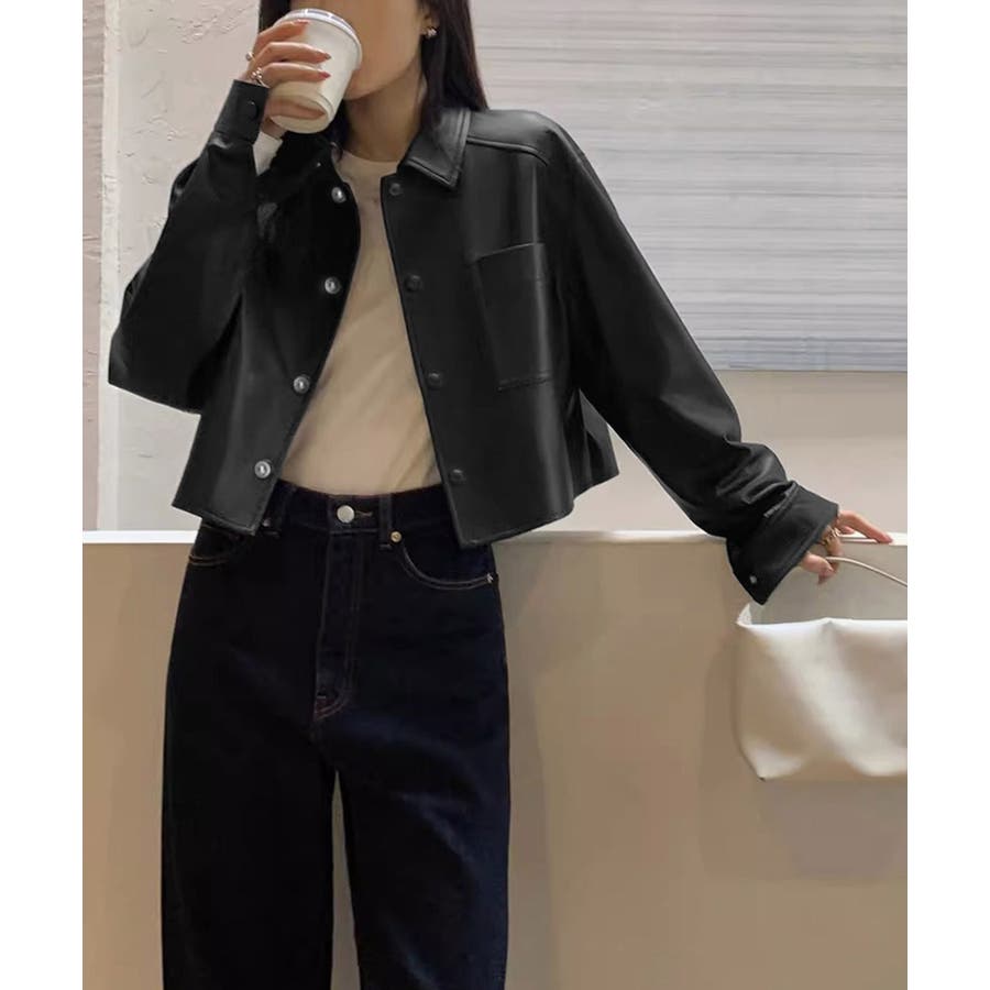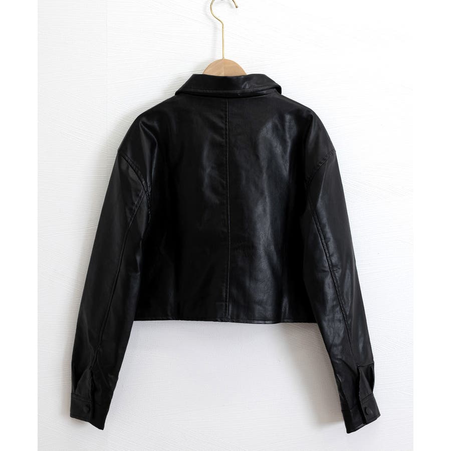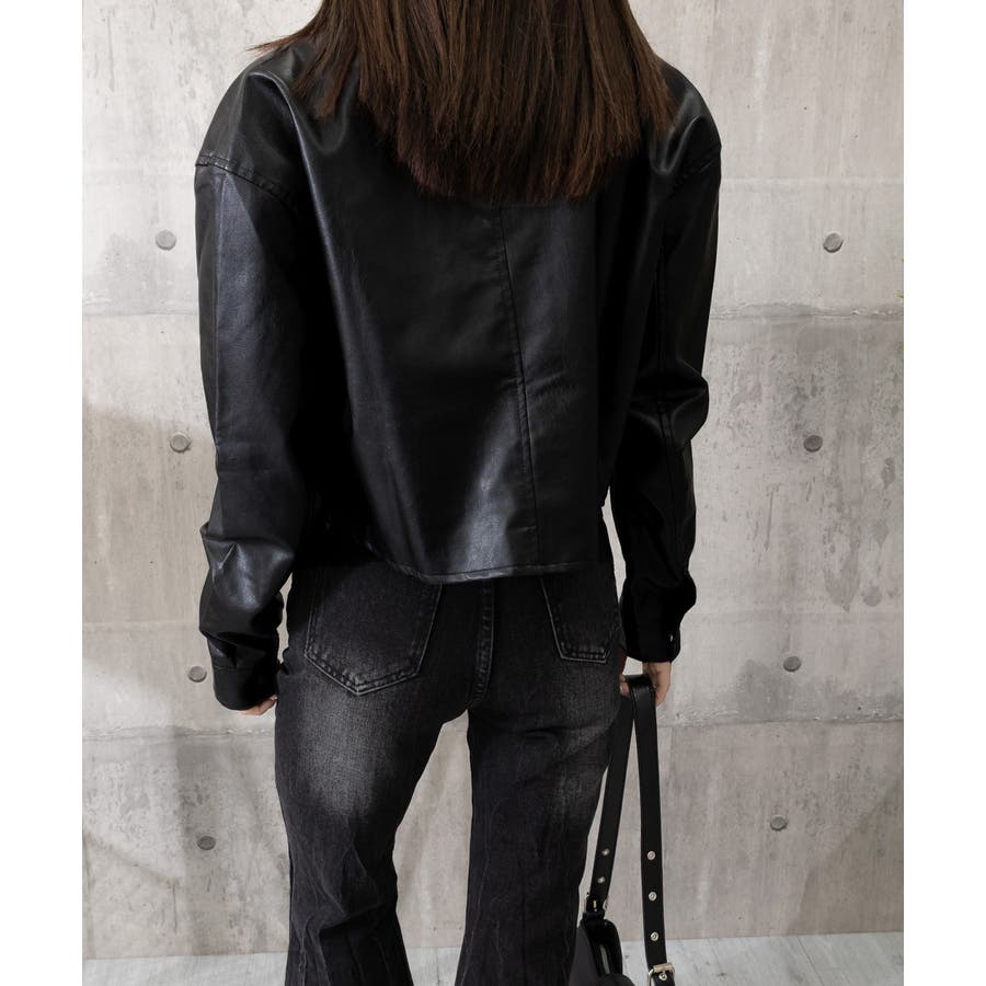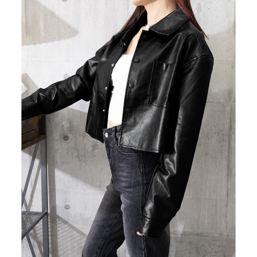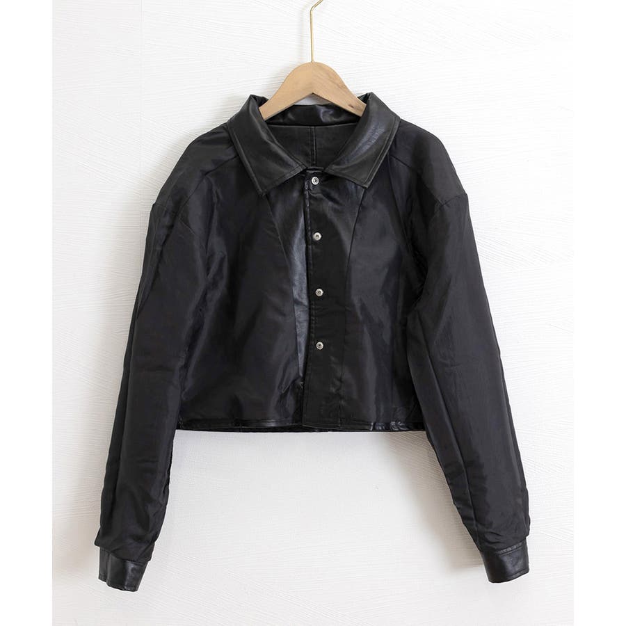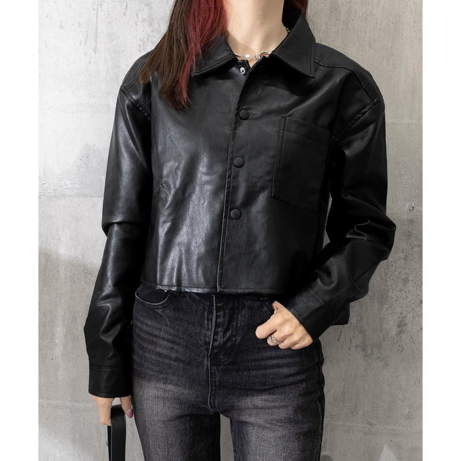 すっきりしたシルエットでシャープな印象の、ショート丈フェイクレザージャケットが新登場。