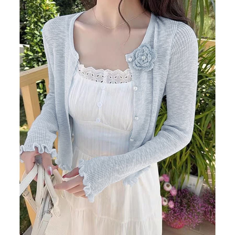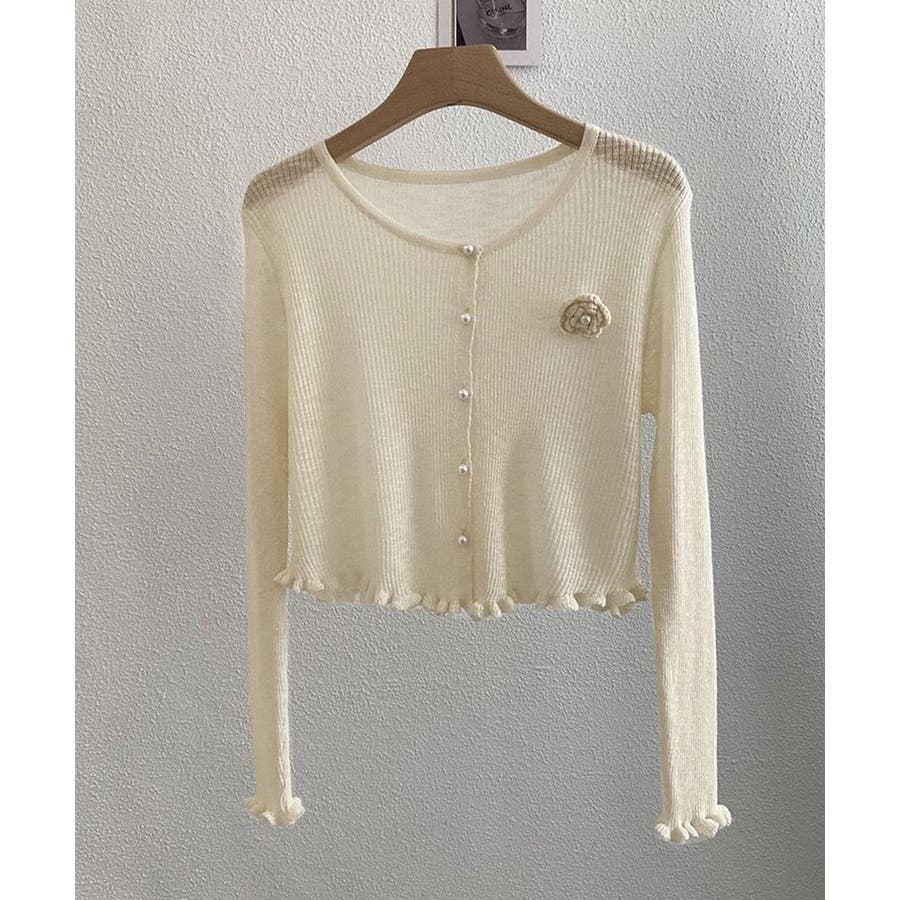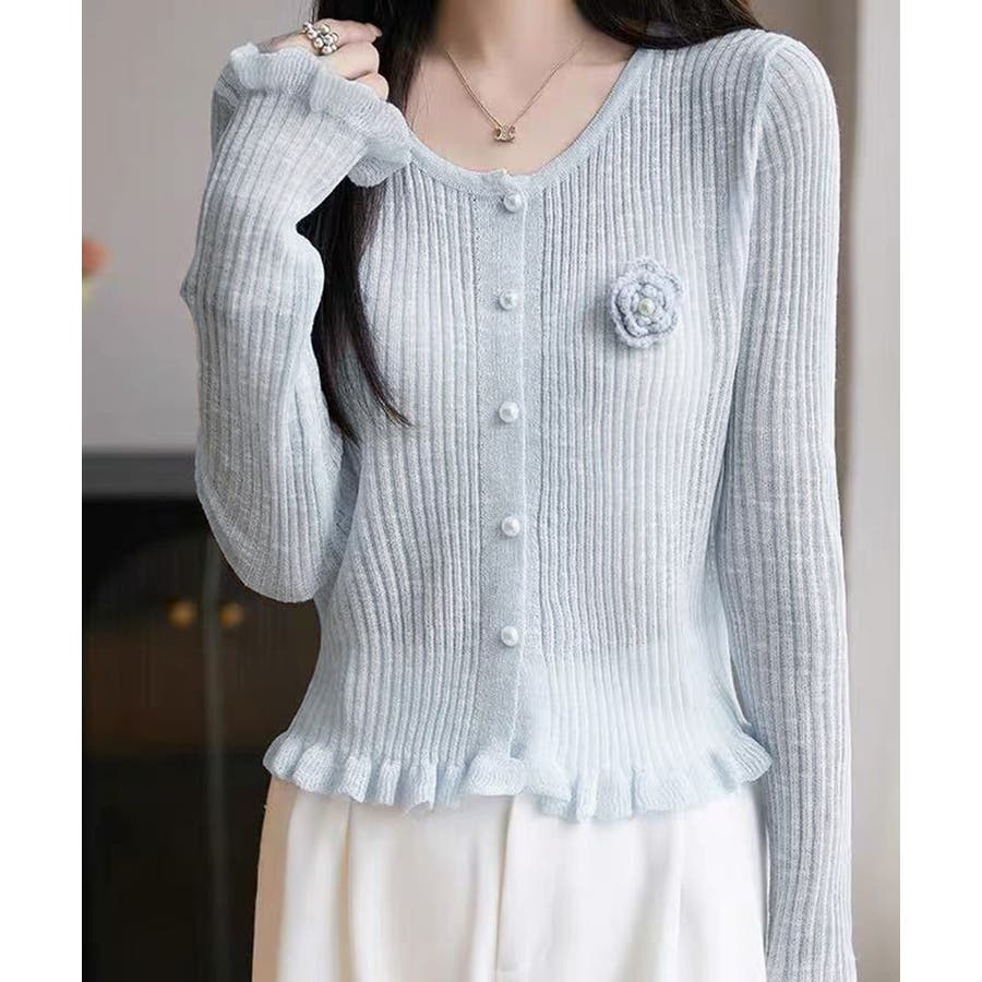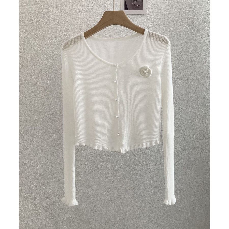 立体的なフラワーチャームが印象的なニットカーディガン。