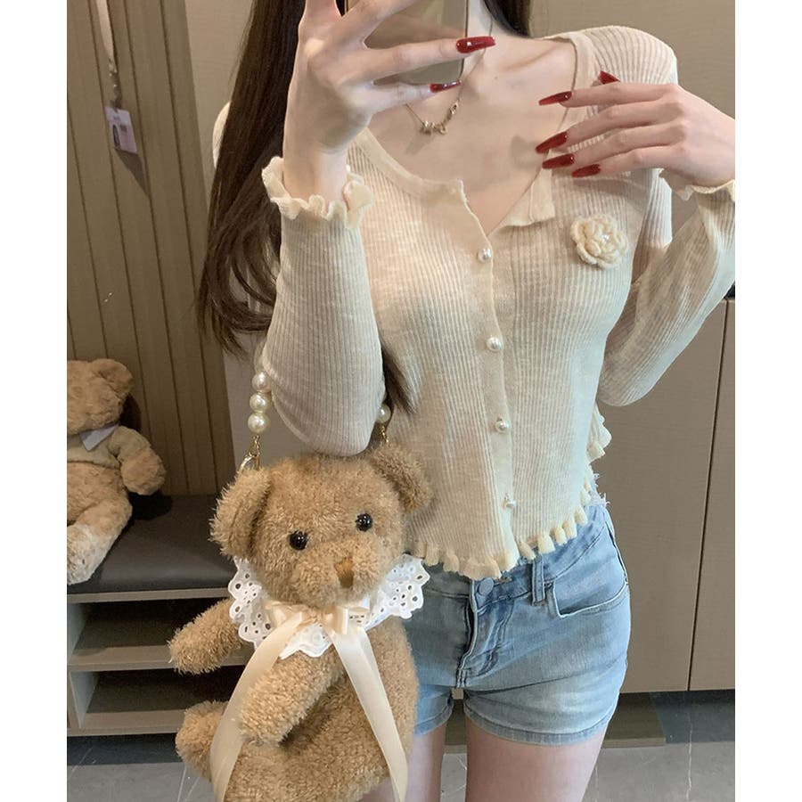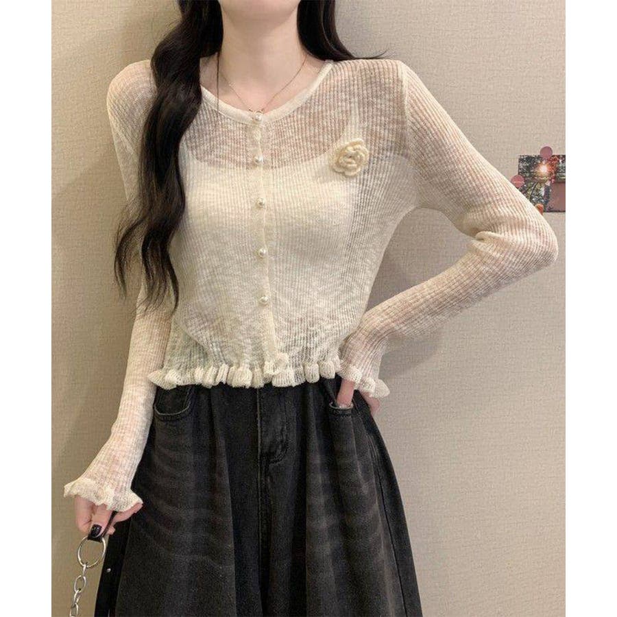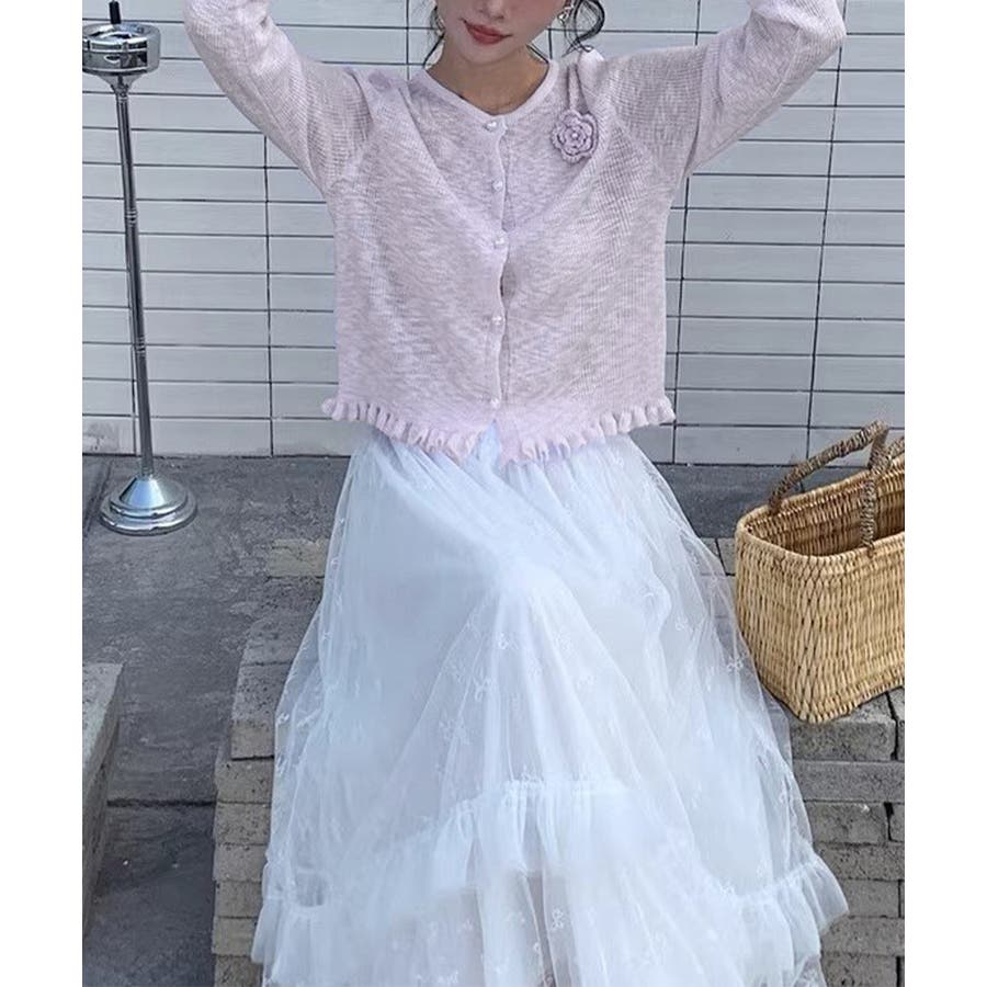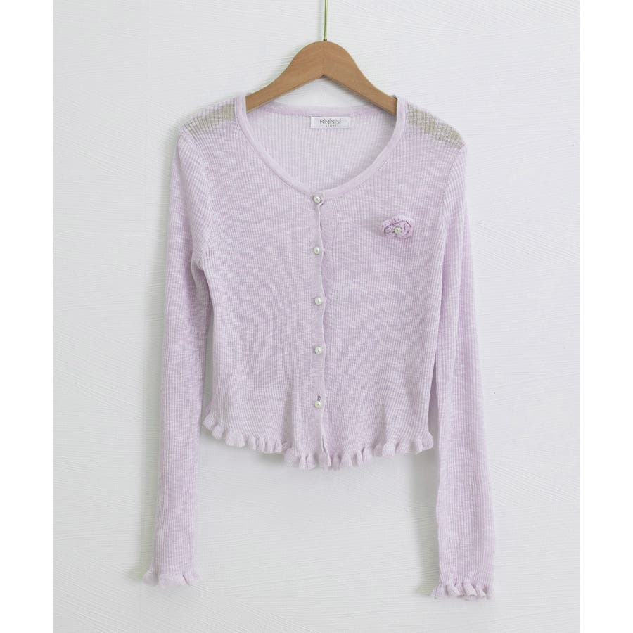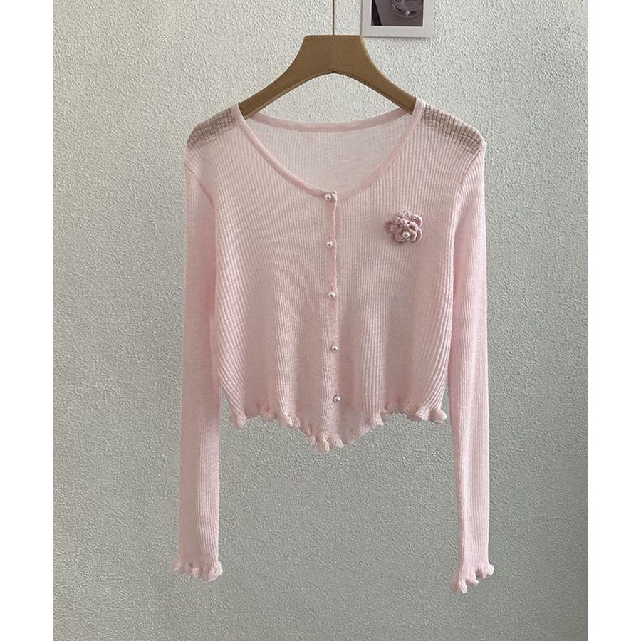 立体的なフラワーチャームが印象的なニットカーディガン。