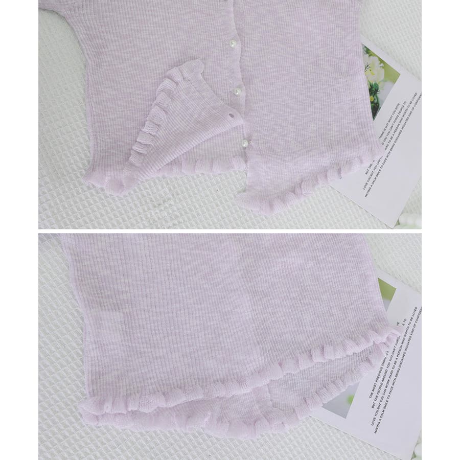 袖口と裾にあしらわれたフリルが、女性らしい華やかさを演出する。