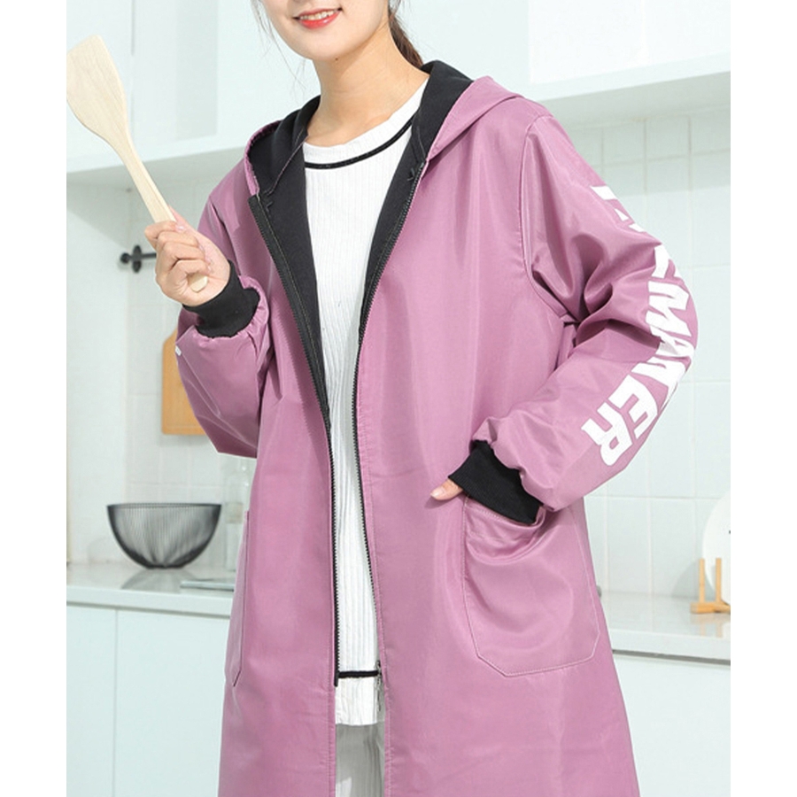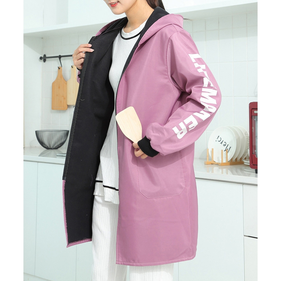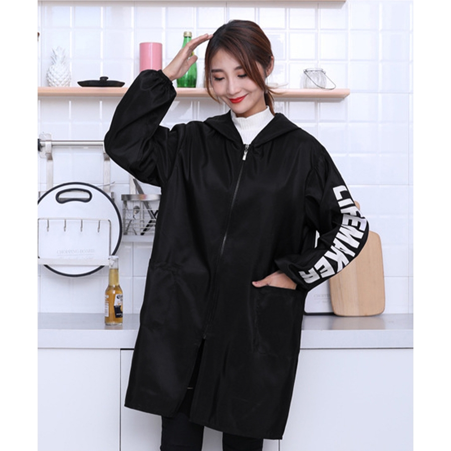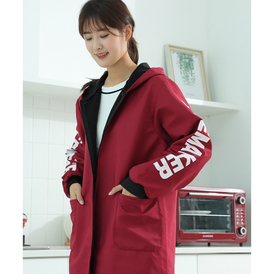 英字Logoがお洒落、コートのように着るファスナー付きの前開き割烹着風エプロン