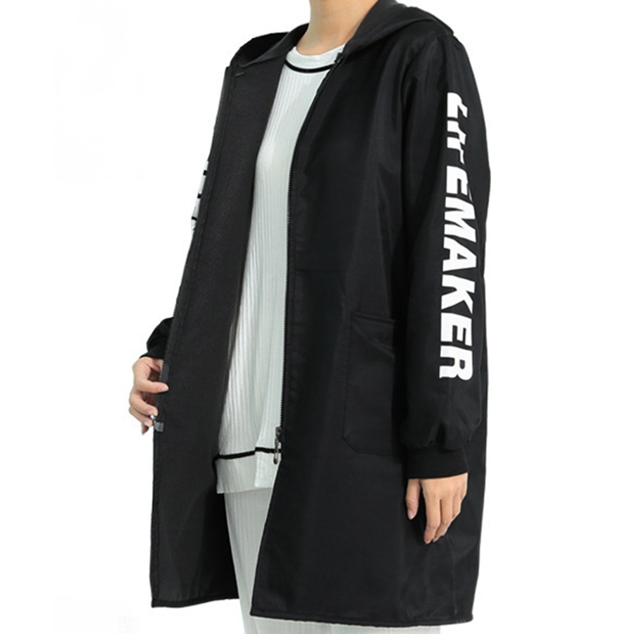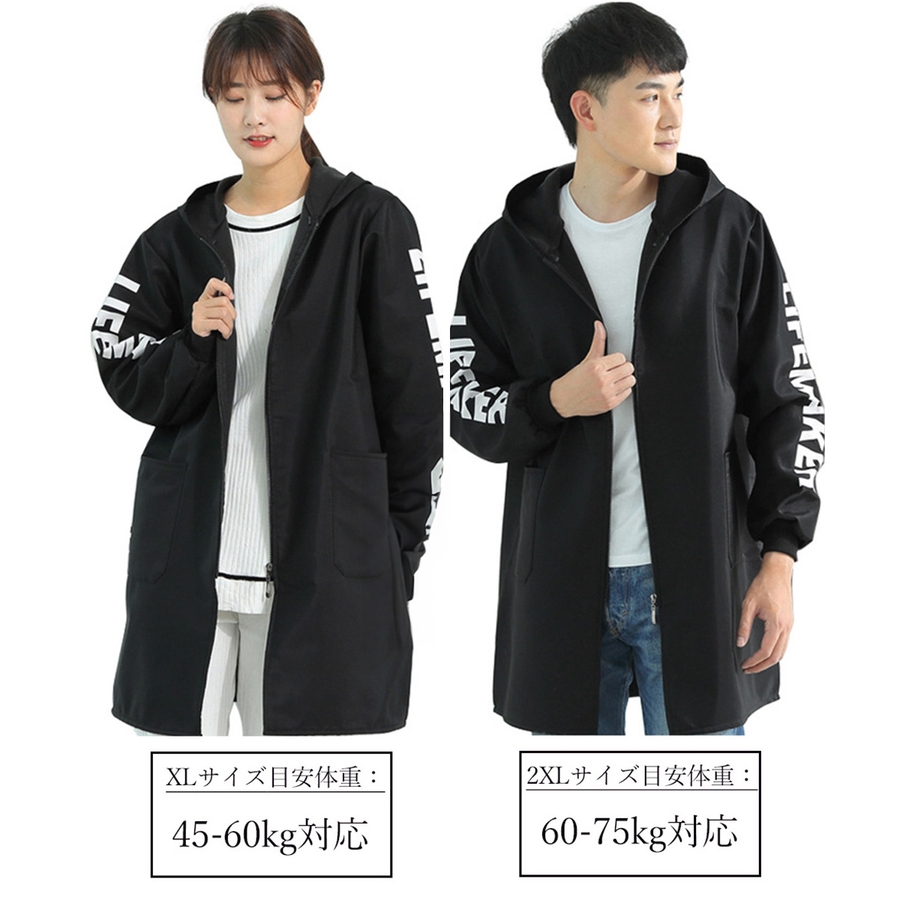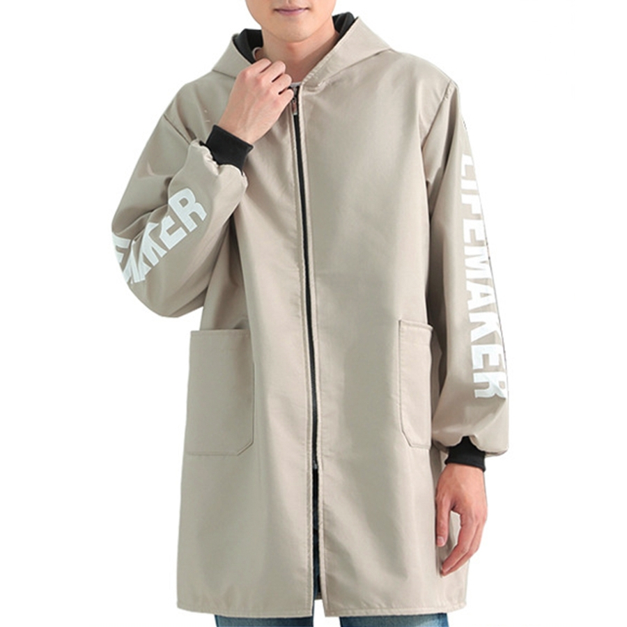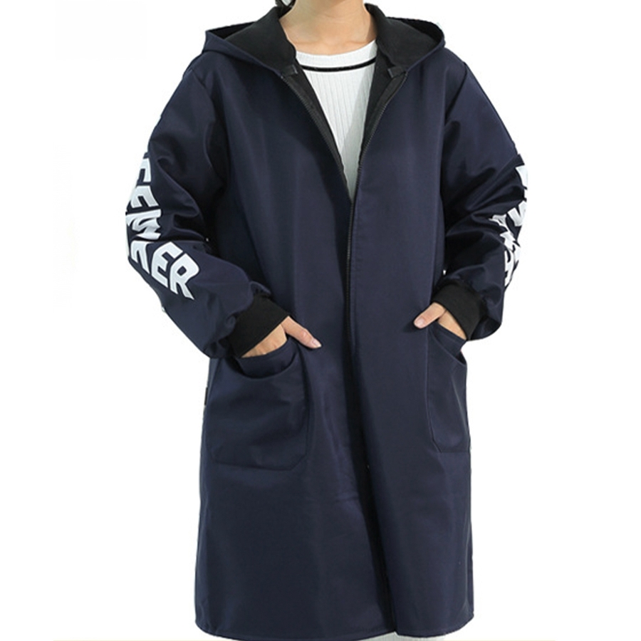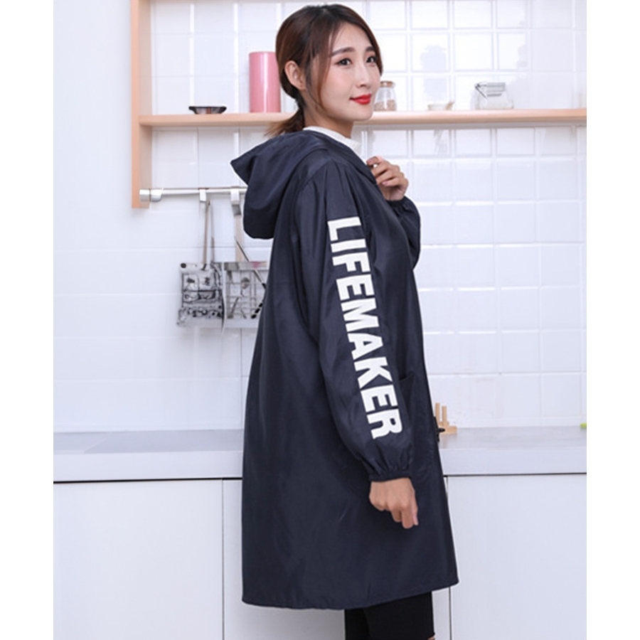 英字Logoがお洒落、コートのように着るファスナー付きの前開き割烹着風エプロン